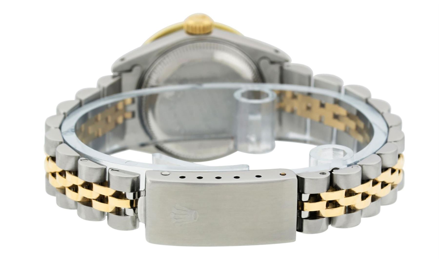 One Ladies 14K Two Tone Rolex Datejust Polished, Serviced & Electronically Tested, 14K Yellow Gold & Stainless Steel Case: 26mm, 14K Yellow Gold Crown, Custom Bezel: New 18K 1ctw Yellow Gold Beadset Diamond Bezel, Diamond Count: 44 Diamonds, Total Weight 1.00 Carat, Clarity: Si-VS, Color: G to H. Custom Crystal: New Synthetic Sapphire Cyclops Lens. Custom Hands: New Luminescent Hands. Movement: Automatic Winding Movement Caliber 2030. Custom Dial: Mother Of Pearl String Diamond Dial, Diamond Count: 43 Single Cut Diamonds in Dial, G To H In Color, VS Clarity. Date Window: 3 O'Clock Position Date Display, Model: Datejust, Condition: G-6 Extra Fine. Bracelet: Two Tone 14K Yellow Gold & Stainless Steel Jubilee. Bright Polish. 6.0 Inch Length, Adjustable. Standard Clasp, With Rolex Logo. This Watch Has Been Serviced Time Tested And Is In Excellent Condition It Is Free Of All Scratches And Dents.
