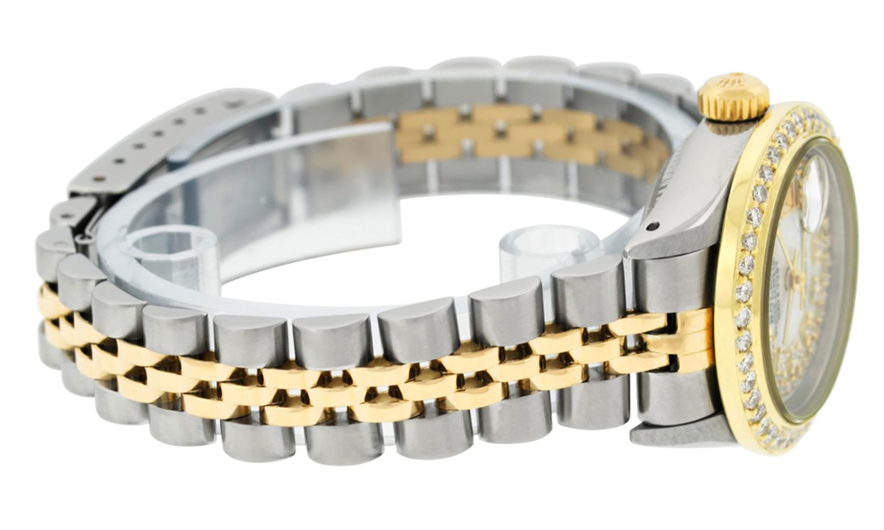 One Ladies 14K Two Tone Rolex Datejust Polished, Serviced & Electronically Tested, 14K Yellow Gold & Stainless Steel Case: 26mm, 14K Yellow Gold Crown, Custom Bezel: New 18K 1ctw Yellow Gold Beadset Diamond Bezel, Diamond Count: 44 Diamonds, Total Weight 1.00 Carat, Clarity: Si-VS, Color: G to H. Custom Crystal: New Synthetic Sapphire Cyclops Lens. Custom Hands: New Luminescent Hands. Movement: Automatic Winding Movement Caliber 2030. Custom Dial: Mother Of Pearl String Diamond Dial, Diamond Count: 43 Single Cut Diamonds in Dial, G To H In Color, VS Clarity. Date Window: 3 O'Clock Position Date Display, Model: Datejust, Condition: G-6 Extra Fine. Bracelet: Two Tone 14K Yellow Gold & Stainless Steel Jubilee. Bright Polish. 6.0 Inch Length, Adjustable. Standard Clasp, With Rolex Logo. This Watch Has Been Serviced Time Tested And Is In Excellent Condition It Is Free Of All Scratches And Dents.