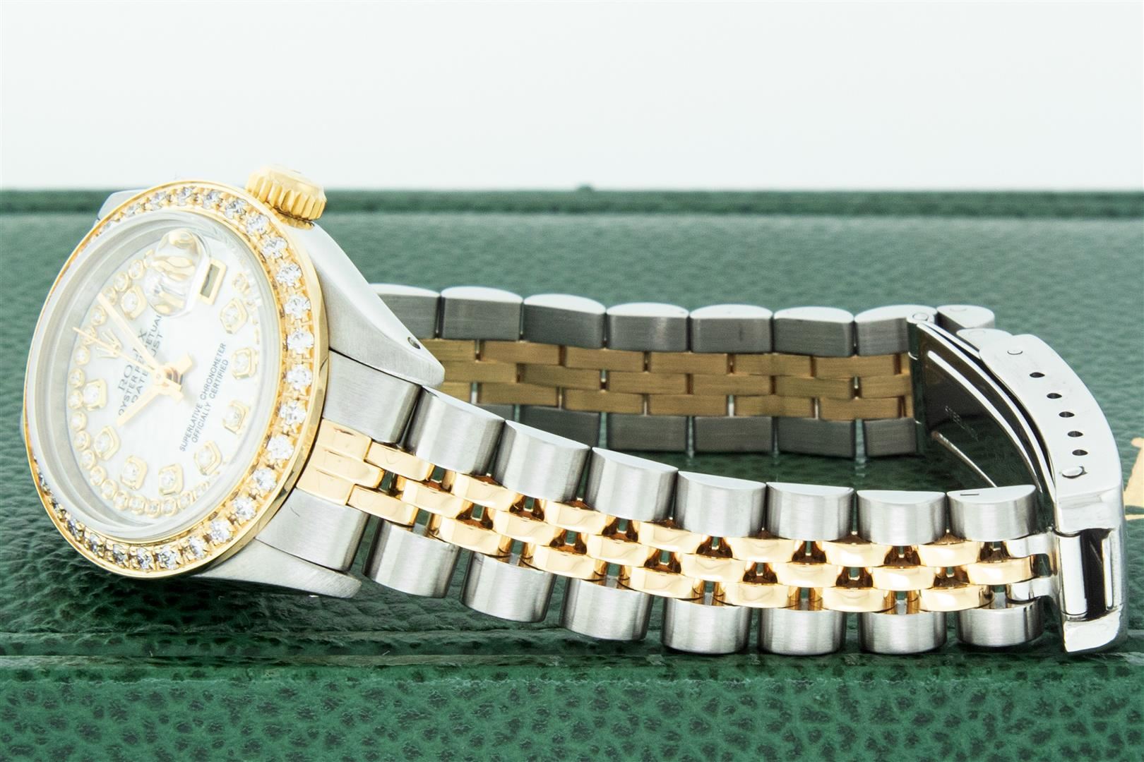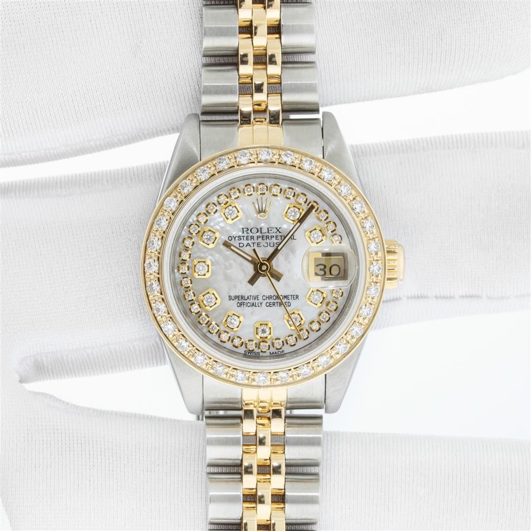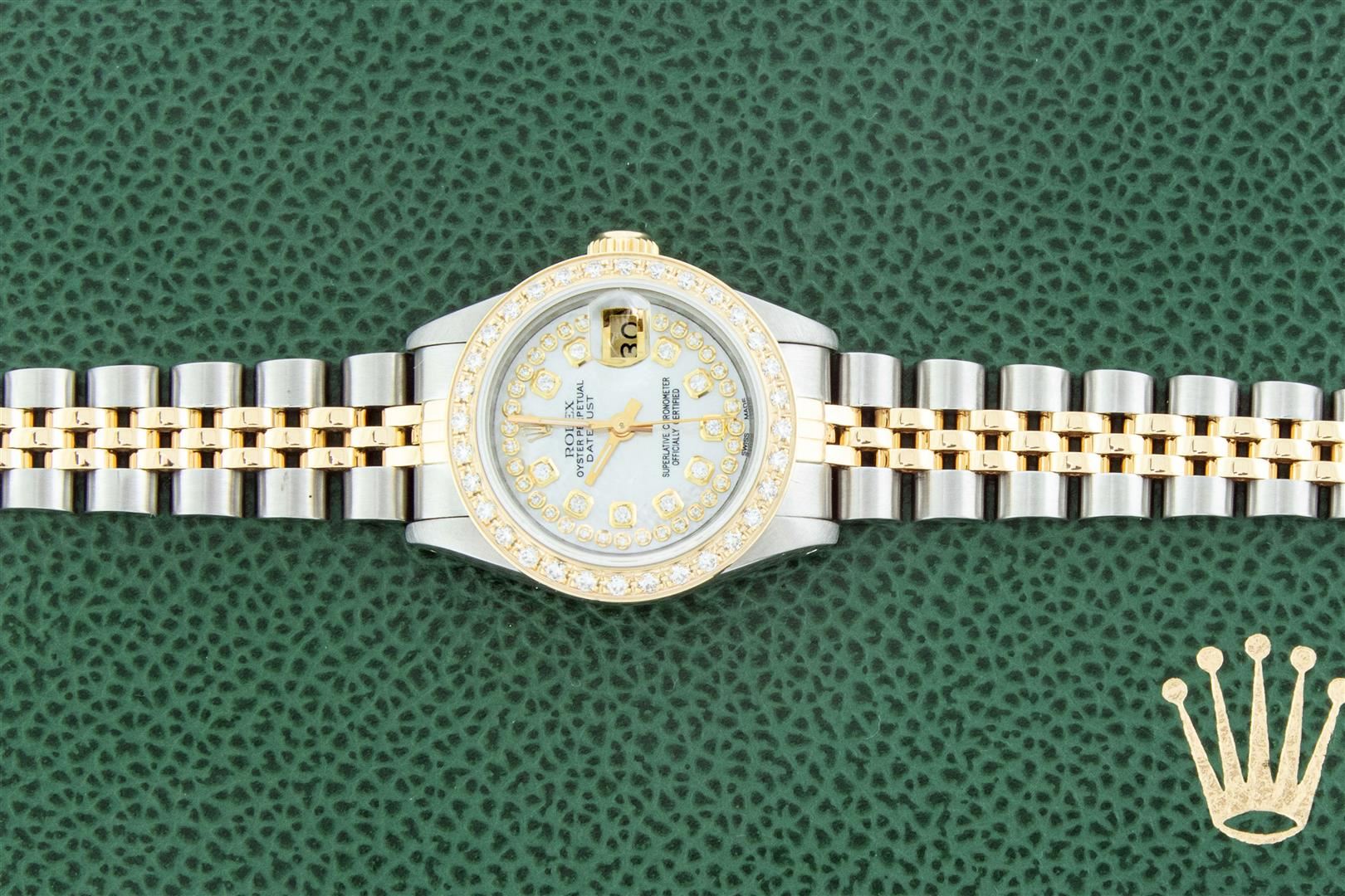 One Ladies Two Tone Rolex Datejust Polished, Serviced & Electronically Tested, Rolex Yellow Gold & Stainless Steel Case: 26mm, Rolex Yellow Gold Crown, Custom Bezel: New 18K Yellow Gold Beadset Diamond Bezel, Diamond Count: 43 Diamonds in dial, Total Weight .70 Carat, Clarity: SI-VS, Color: G to H. Custom Crystal: New Sapphire With Magnified Date Window. Custom Hands: New Luminescent Hands. Rolex Movement: Automatic Winding Movement. Custom Dial: Mother Of Pearl String Diamond Dial, Diamond Count: 43 Diamonds, Clarity: SI-VS, Color: G to H. Date Window: 3 O'clock Position Date Display, Model: Datejust. Condition: G-6 Extra Fine. Rolex Bracelet: Two Tone Yellow Gold & Stainless Steel Jubilee Band. Bright Polish. 6.0 Inch Length, Adjustable. Standard Clasp, With Rolex Logo. This Pre Owned Watch Has Been Serviced Time Tested And Is In Excellent Condition It Is Free Of All Scratches And Dents. This Watch Comes With A Rolex Box.