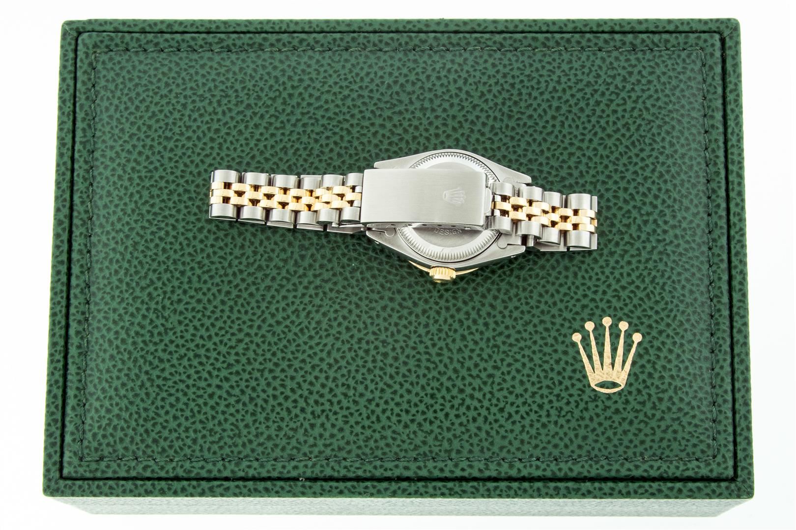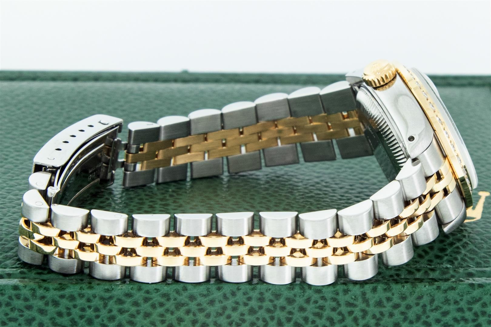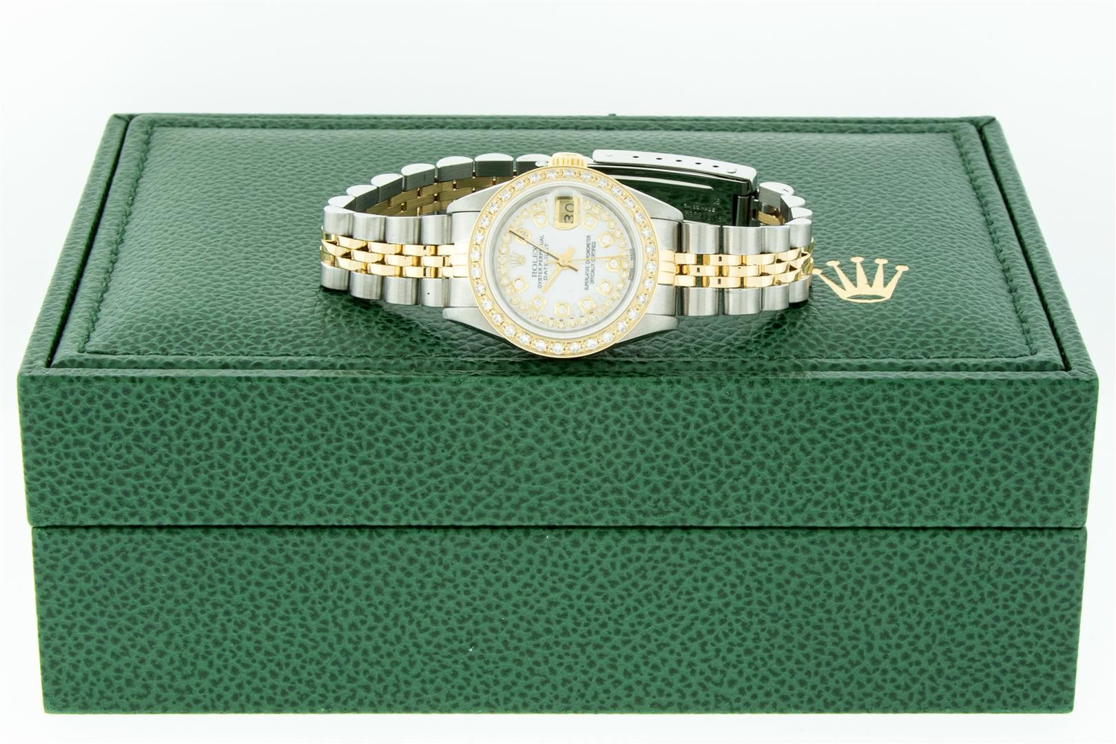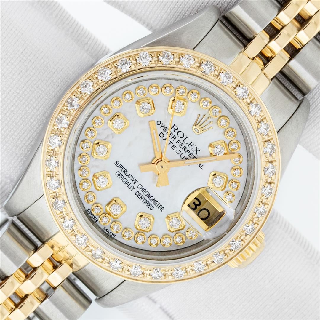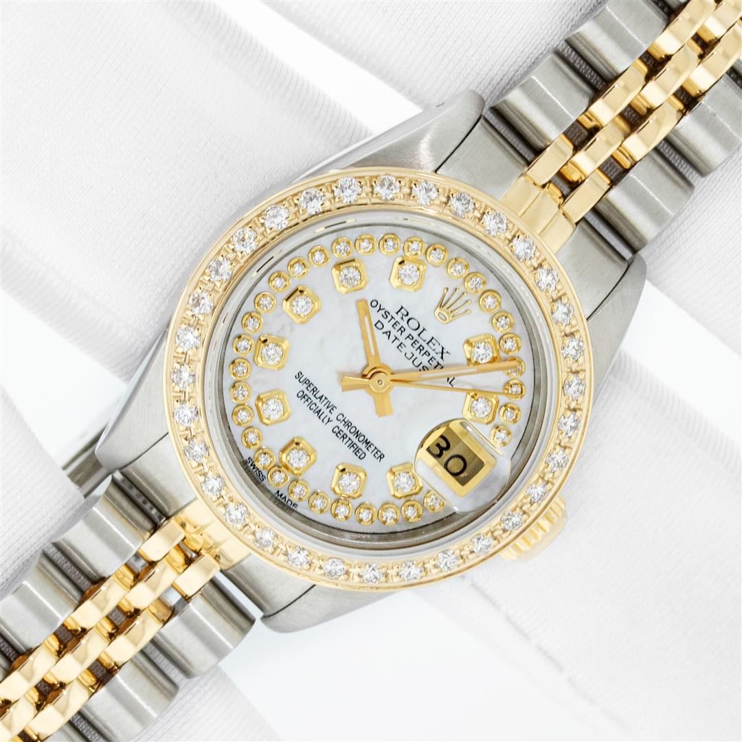 One Ladies Two Tone Rolex Datejust Polished, Serviced & Electronically Tested, Rolex Yellow Gold & Stainless Steel Case: 26mm, Rolex Yellow Gold Crown, Custom Bezel: New 18K Yellow Gold Beadset Diamond Bezel, Diamond Count: 43 Diamonds in dial, Total Weight .70 Carat, Clarity: SI-VS, Color: G to H. Custom Crystal: New Sapphire With Magnified Date Window. Custom Hands: New Luminescent Hands. Rolex Movement: Automatic Winding Movement. Custom Dial: Mother Of Pearl String Diamond Dial, Diamond Count: 43 Diamonds, Clarity: SI-VS, Color: G to H. Date Window: 3 O'clock Position Date Display, Model: Datejust. Condition: G-6 Extra Fine. Rolex Bracelet: Two Tone Yellow Gold & Stainless Steel Jubilee Band. Bright Polish. 6.0 Inch Length, Adjustable. Standard Clasp, With Rolex Logo. This Pre Owned Watch Has Been Serviced Time Tested And Is In Excellent Condition It Is Free Of All Scratches And Dents. This Watch Comes With A Rolex Box.
