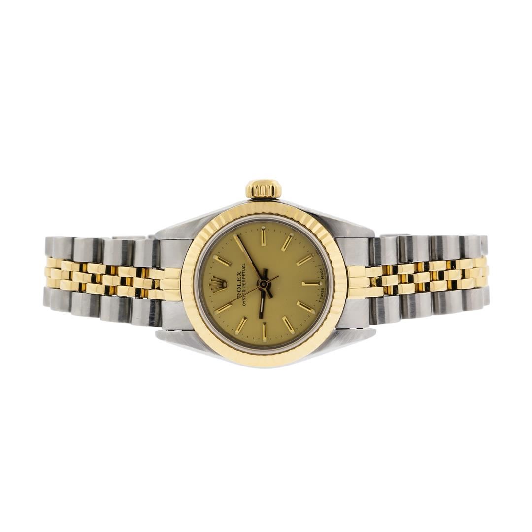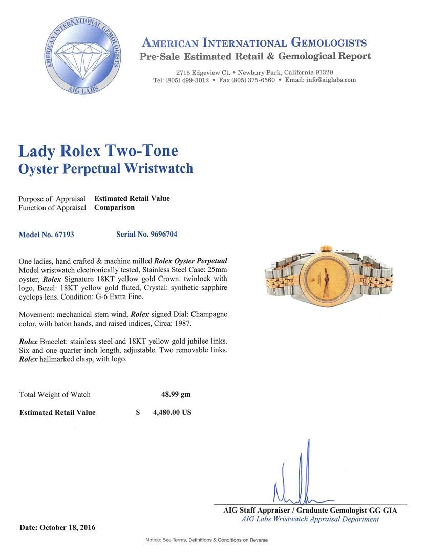One ladies, hand crafted & machine milled Rolex Oyster Perpetual Model wristwatch electronically tested, Stainless Steel Case: 25mm oyster, Rolex Signature 18KT yellow gold Crown: twin lock with logo, Bezel: 18KT yellow gold fluted, Crystal: synthetic sapphire cyclops lens. Condition: G-6 Extra Fine. Movement: mechanical stem wind, Rolex signed Dial: Champagne color, with baton hands, and raised indices, Circa: 1987.Rolex Bracelet: stainless steel and 18KT yellow gold jubilee links. Six and one quarter inch length, adjustable. Two removable links. Rolex hallmarked clasp, with logo. Total Weight of Watch 48.99gm. AIG Appraised at $4,480.00.