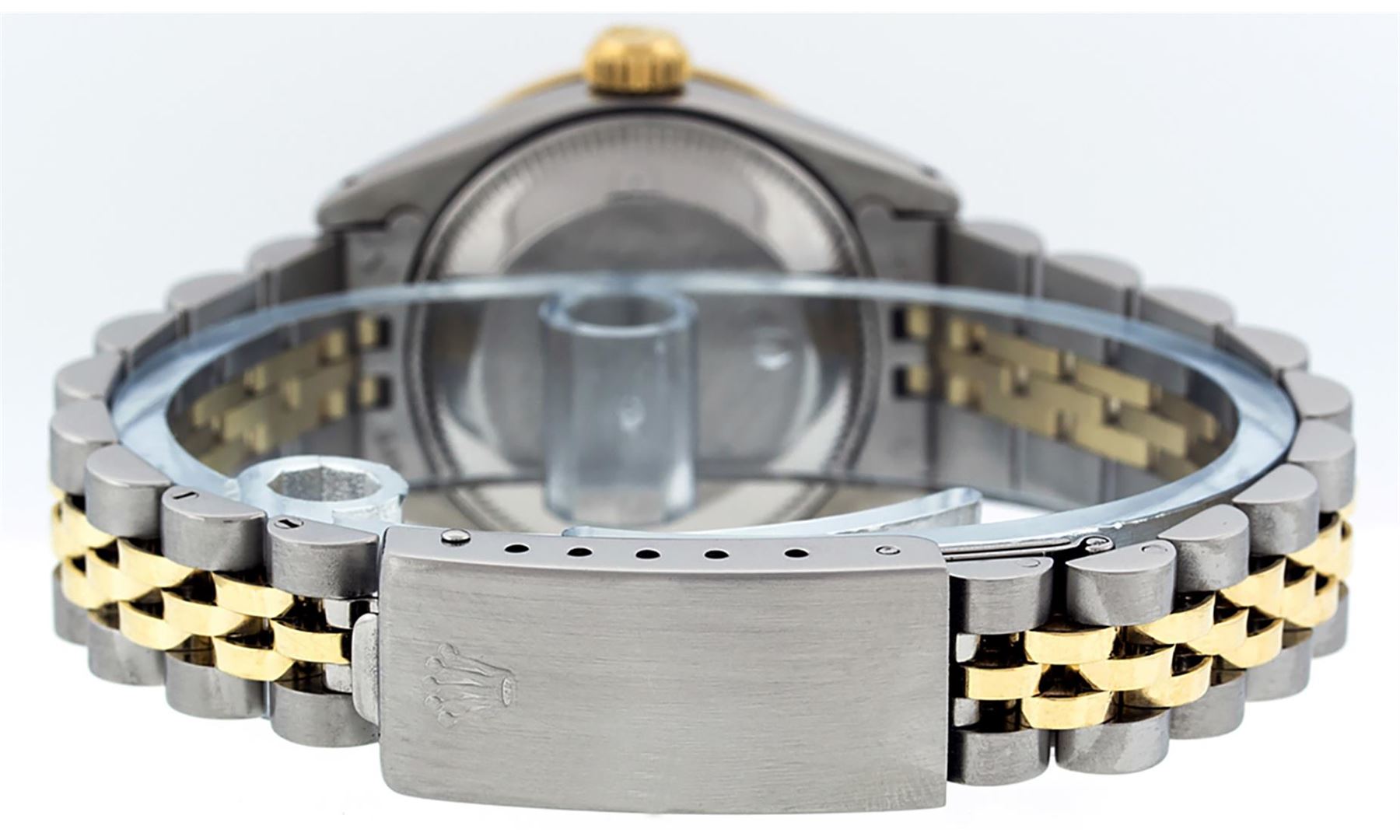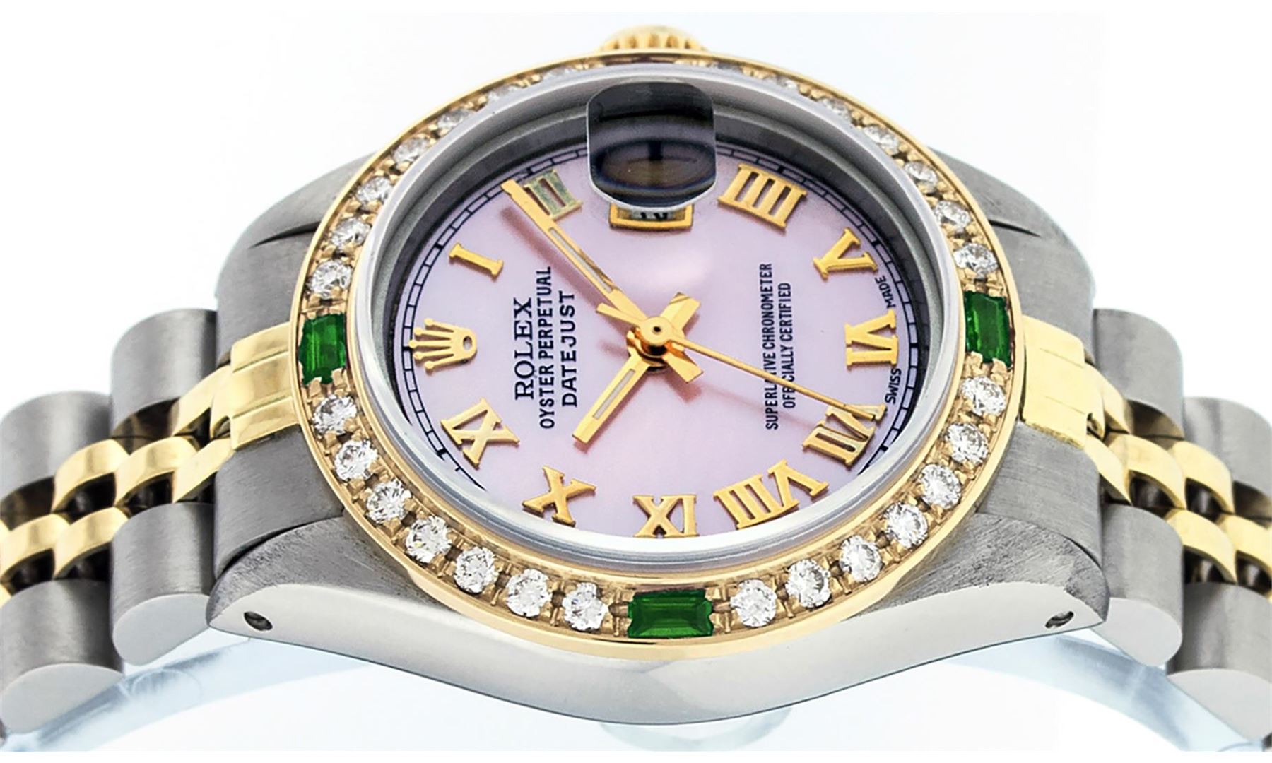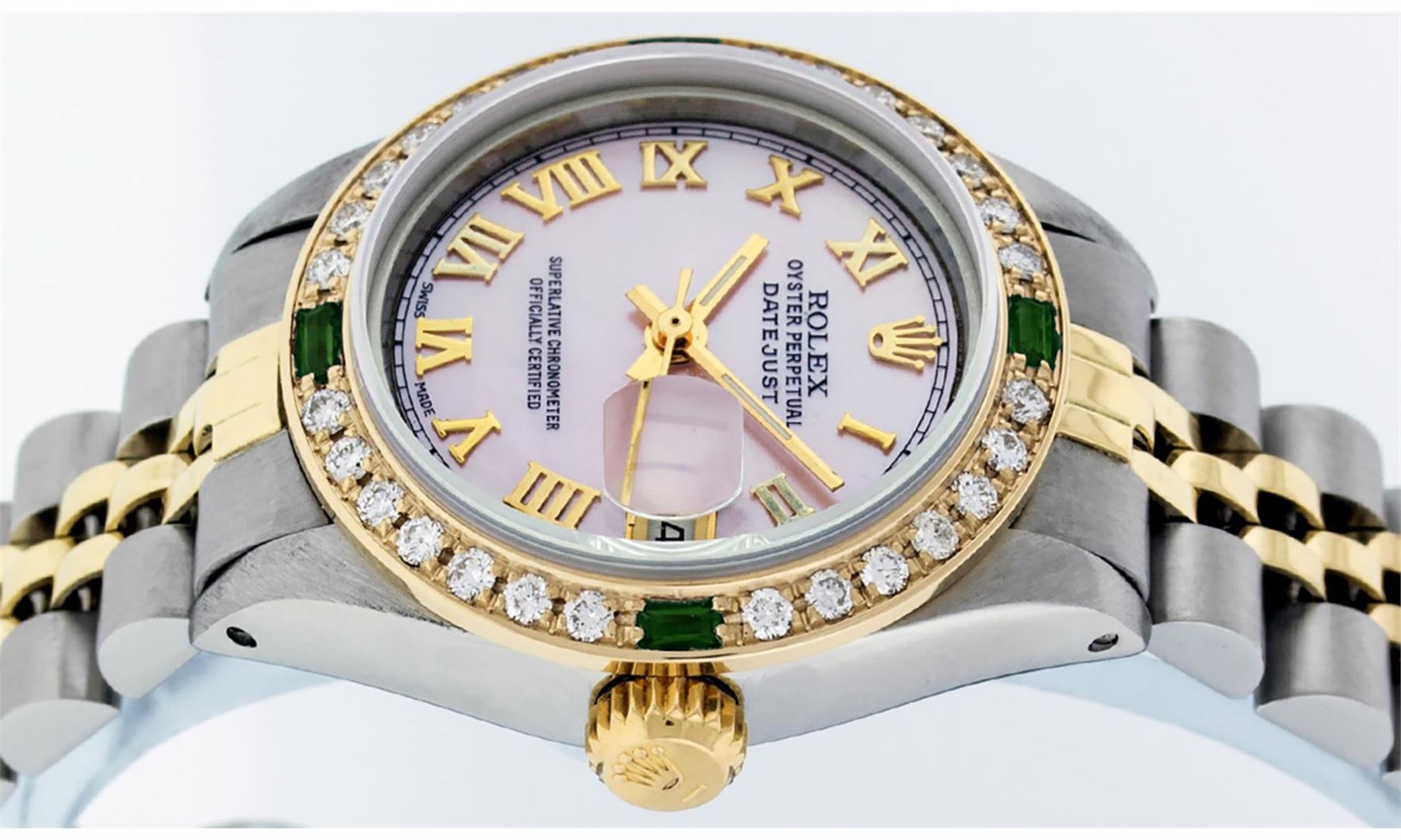 One Ladies Two Tone Rolex Datejust Polished, Serviced & Electronically Tested, Yellow Gold & Stainless Steel Case: 26mm, Yellow Gold Crown, Custom Bezel: New 18K Yellow Gold Emerald Beadset Diamond Bezel, Diamond + Gem Count: 28 Diamonds + 4 Emeralds Total Weight .70 Carat, Clarity: SI-VS, Color: G to H. Custom Crystal: New Scratch Resistant Synthetic Sapphire Cyclops Lens. Custom Hands: New Luminescent Hands. Movement: Automatic Winding Movement. Custom Dial: Pink Mother Of Pearl With Roman Hour Markers and Square Track. Date Window: 3 O'clock Position Date Display, Model: Datejust, Condition: G-6 Extra Fine. Bracelet: Two Tone Yellow Gold & Stainless Steel Jubilee Band. Bright Polish. 6.0 Inch Length, Adjustable. Standard Clasp, With Rolex Logo. This Watch Has Been Serviced Time Tested And Is In Excellent Condition It Is Free Of All Scratches And Dents.