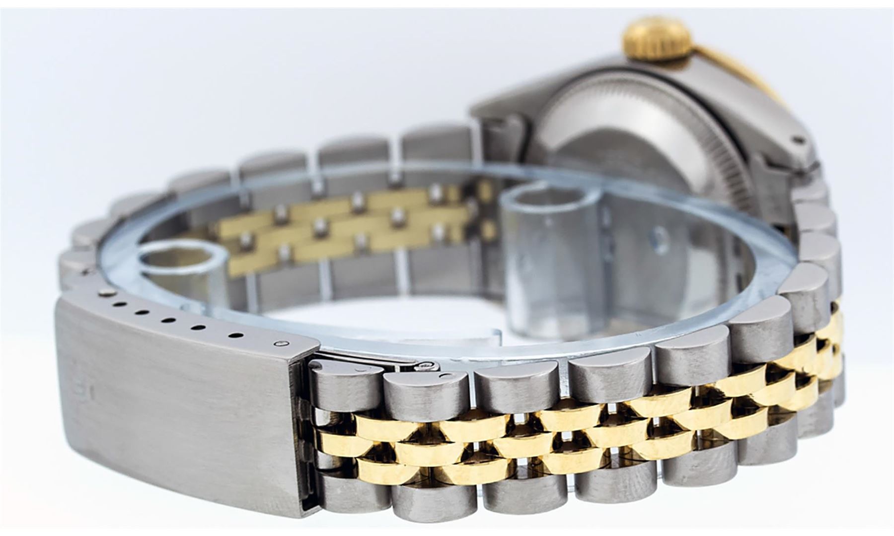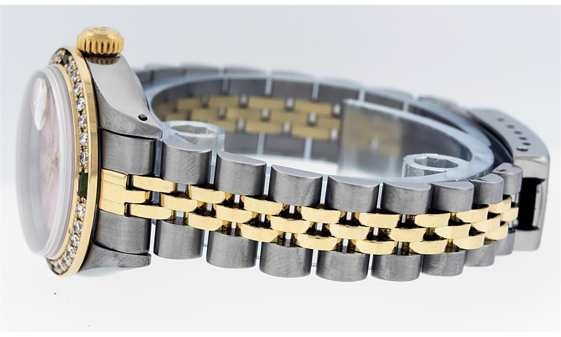 One Ladies Two Tone Rolex Datejust Polished, Serviced & Electronically Tested, Yellow Gold & Stainless Steel Case: 26mm, Yellow Gold Crown, Custom Bezel: New 18K Yellow Gold Emerald Beadset Diamond Bezel, Diamond + Gem Count: 28 Diamonds + 4 Emeralds Total Weight .70 Carat, Clarity: SI-VS, Color: G to H. Custom Crystal: New Scratch Resistant Synthetic Sapphire Cyclops Lens. Custom Hands: New Luminescent Hands. Movement: Automatic Winding Movement. Custom Dial: Pink Mother Of Pearl With Roman Hour Markers and Square Track. Date Window: 3 O'clock Position Date Display, Model: Datejust, Condition: G-6 Extra Fine. Bracelet: Two Tone Yellow Gold & Stainless Steel Jubilee Band. Bright Polish. 6.0 Inch Length, Adjustable. Standard Clasp, With Rolex Logo. This Watch Has Been Serviced Time Tested And Is In Excellent Condition It Is Free Of All Scratches And Dents.
