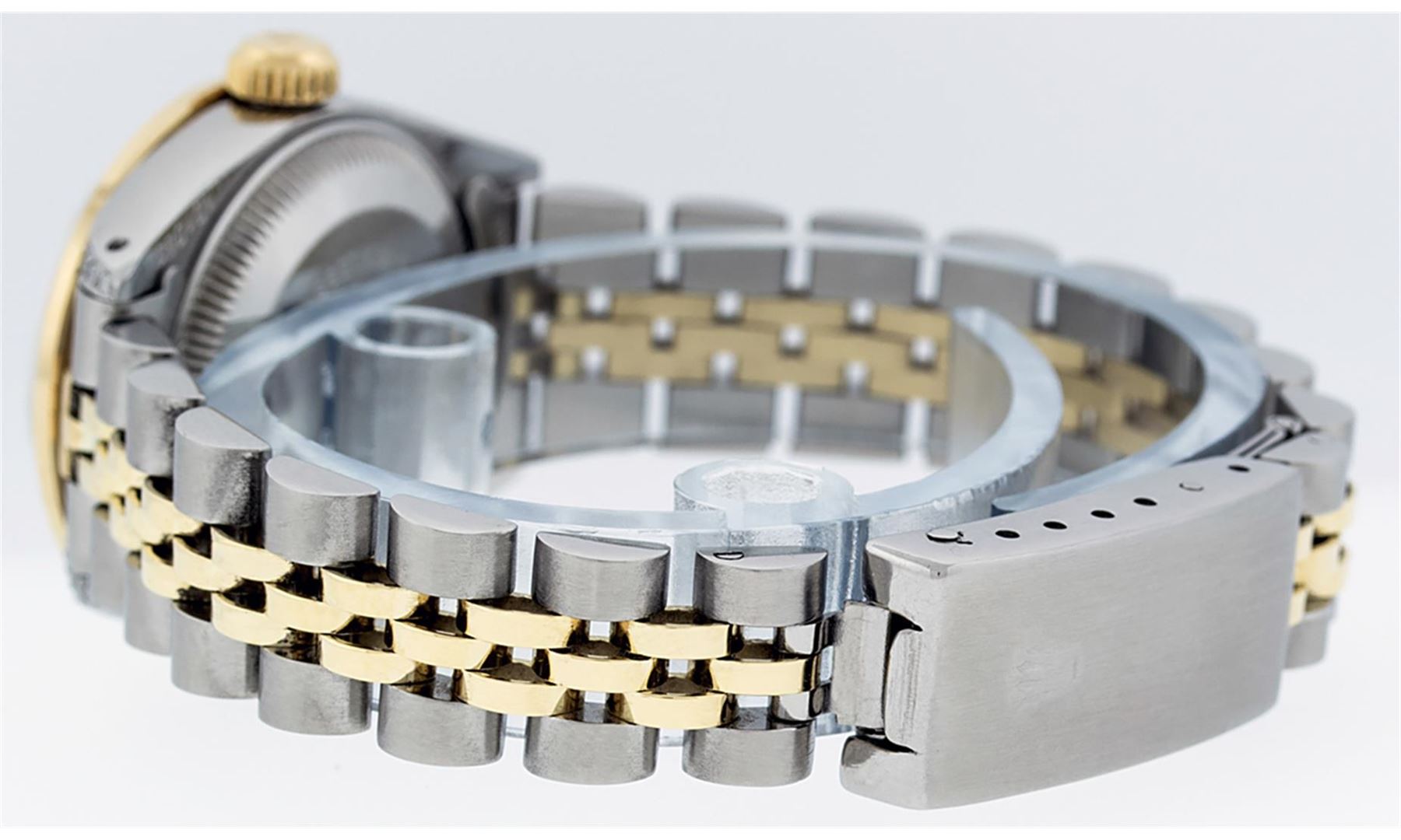 One Ladies Two Tone Rolex Datejust Polished, Serviced & Electronically Tested, Yellow Gold & Stainless Steel Case: 26mm, Yellow Gold Crown, Diamond Lugs: 24 Diamonds On Lugs, Clarity: SI-VS, Color: G to H. Custom Bezel: New 18K Yellow Gold Pyramid Diamond Bezel, Diamond Count: 24 Diamonds, Total Bezel Weight .50 Carat, Clarity: SI-VS, Color: G to H. Custom Crystal: New Scratch Resistant Synthetic Sapphire Cyclops Lens. Custom Hands: New Luminescent Hands. Movement: Automatic Winding Movement. Custom Dial: Pink Mother Of Pearl With Diamond Hour Markers, Diamond Count: 10 Diamonds In Dial, Clarity: SI-VS, Color: G to H. Date Window: 3 O'clock Position Date Display, Model: Datejust. Condition: G-6 Extra Fine. Bracelet: Two Tone Yellow Gold & Stainless Steel Jubilee Band. Bright Polish. 6.0 Inch Length, Adjustable. Standard Clasp, With Rolex Logo. This Watch Has Been Serviced Time Tested And Is In Excellent Condition It Is Free Of All Scratches And Dents.