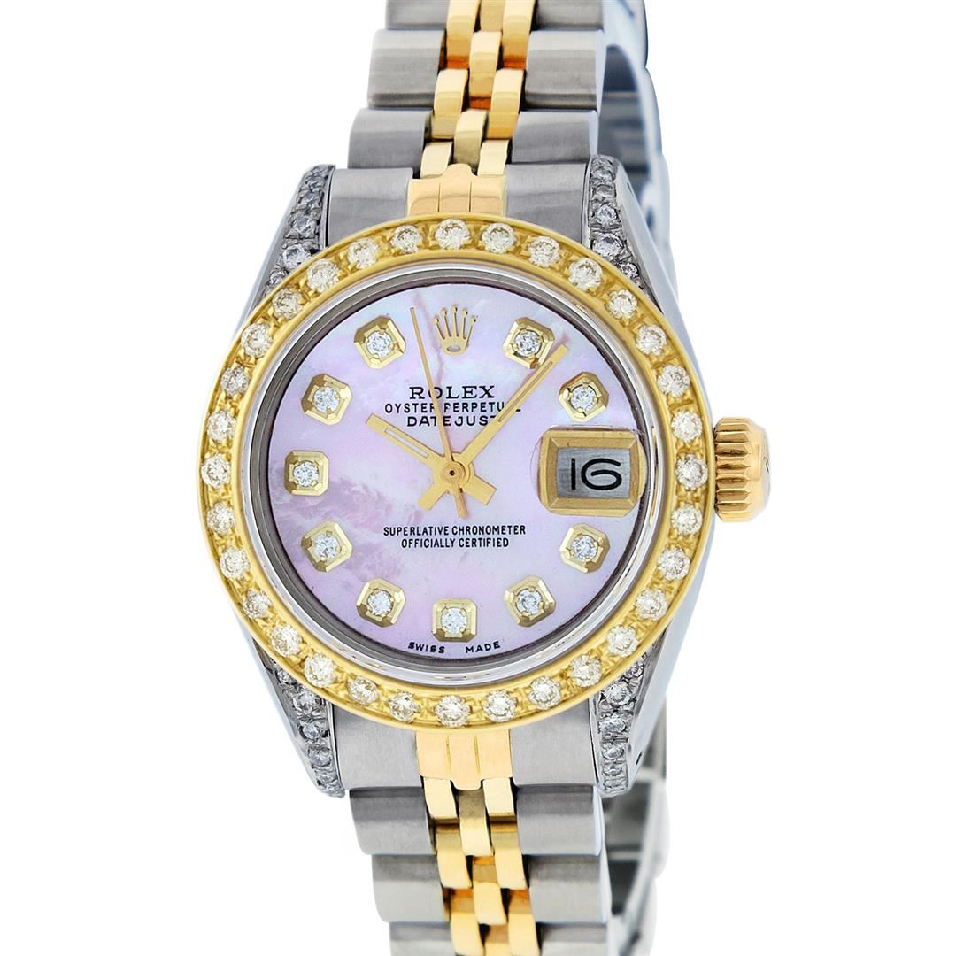 One Ladies Two Tone Rolex Datejust Polished, Serviced & Electronically Tested, Yellow Gold & Stainless Steel Case: 26mm, Yellow Gold Crown, Diamond Lugs: 24 Diamonds On Lugs, Clarity: SI-VS, Color: G to H, Clarity SI-VS. Custom Bezel: New 18K Yellow Gold Beadset Diamond Bezel, Diamond Count: 32 Diamonds In Bezel, Total Bezel Weight .70 Carat, Clarity: SI-VS, Color: G to H. Custom Crystal: New Scratch Resistant Synthetic Sapphire Cyclops Lens. Custom Hands: New Luminescent Hands. Movement: Automatic Winding Movement. Custom Dial: Pink Mother Of Pearl With Diamond Hour Markers, Diamond Count: 10 Diamonds In Dial, Clarity: SI-VS, Color: G to H. Date Window: 3 O'clock Position Date Display, Model: Datejust. Condition: G-6 Extra Fine. Bracelet: Two Tone Yellow Gold & Stainless Steel Jubilee Band. Bright Polish. 6.0 Inch Length, Adjustable. Standard Clasp, With Rolex Logo. This Watch Has Been Serviced Time Tested And Is In Excellent Condition It Is Free Of All Scratches And Dents.