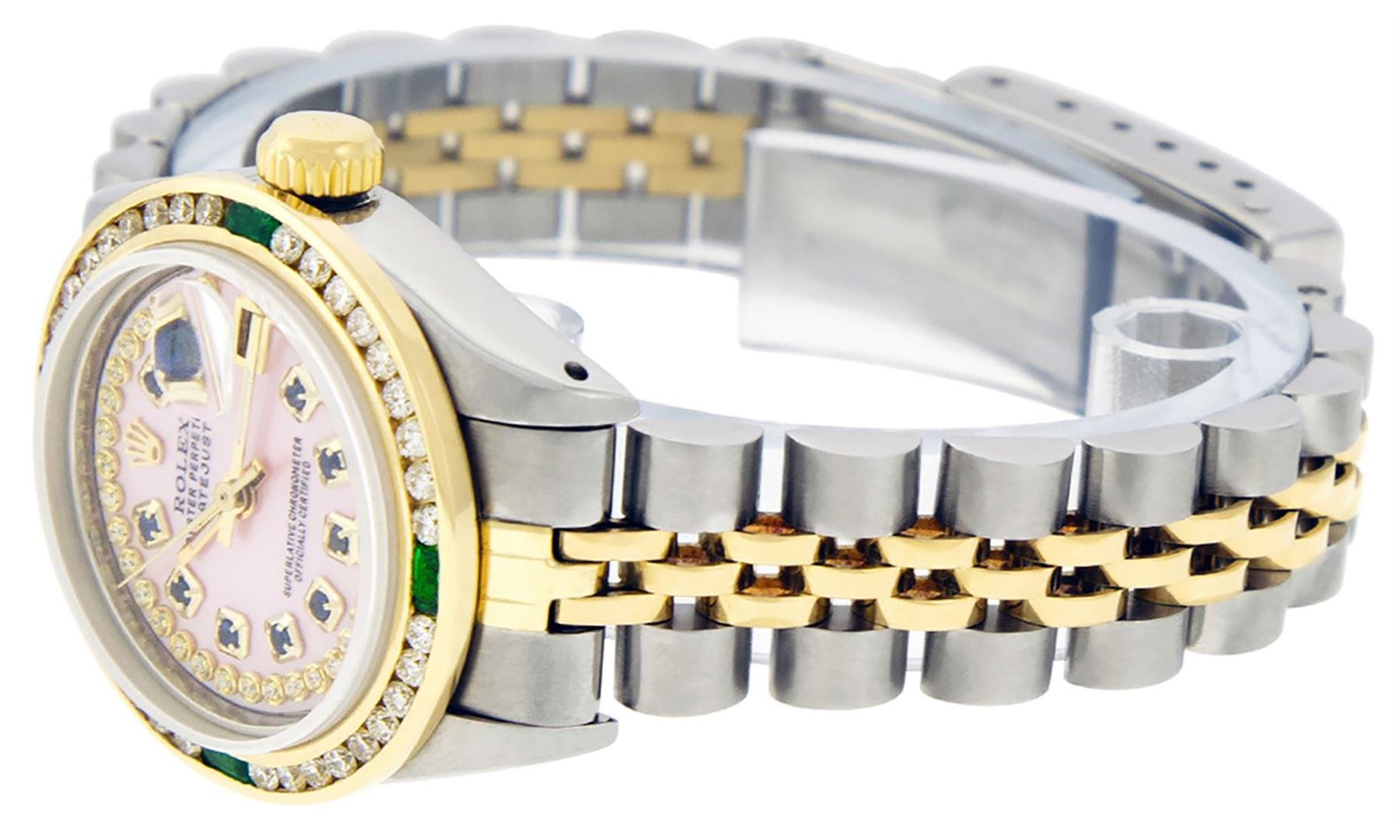 One Ladies Two Tone Rolex Oyster Perpetual Datejust Polished, Serviced & Electronically Tested, Yellow Gold & Stainless Steel Case: 26mm, Yellow Gold Crown, Custom Bezel: New 18K Yellow Gold Emerald Channel Set Diamond Bezel, Diamond + Gem Count: 36 Diamonds + 4 Emeralds, Total Weight 1.00 Carat, Clarity: SI-VS, Color: G to H. Custom Crystal: New Synthetic Sapphire Cyclops Lens. Custom Hands: New Luminescent Hands. Movement: Automatic Winding Movement. Custom Dial: Pink Mother Of Pearl with Sapphire Diamond Hour Markers, Stone Count: 10 Sapphires + 33 Diamonds In Dial. Date Window: 3 O'Clock Position Date Display, Model: Datejust, Condition: G-6 Extra Fine. Bracelet: Two Tone Yellow Gold & Stainless Steel Jubilee. Bright Polish. 6.0 Inch Length, Adjustable. Standard Clasp, With Rolex Logo. This Watch Has Been Serviced Time Tested And Is In Excellent Condition It Is Free Of All Scratches And Dents.