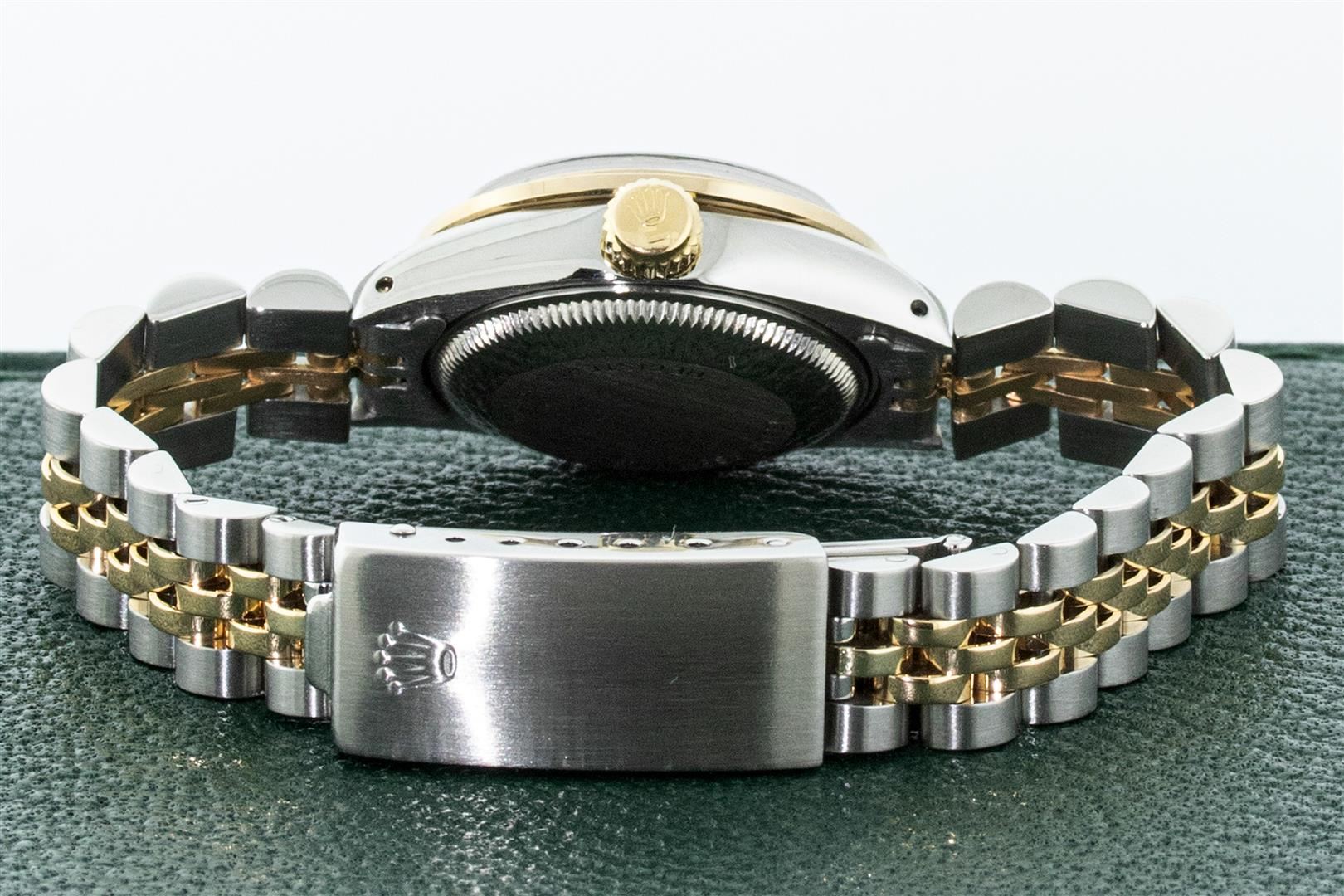 One Ladies Two Tone Rolex Datejust Polished, Serviced & Electronically Tested, Yellow Gold & Stainless Steel Case: 26mm, Yellow Gold Crown, Custom Bezel: New 18K New Yellow Gold Ruby Beadset Diamond Bezel, Stone Count: 28 Diamonds + 4 Rubies In Dial, Clarity: SI-VS, Color: G to H. Custom Crystal: New Sapphire With Date Window. Custom Hands: New Luminescent Hands. Rolex Movement: Automatic Winding Movement. Custom Dial: Pink Mother Of Pearl Emerald String Diamond Dial, Stone Count: 10 Emeralds + 33 Diamonds In Dial, Clarity: SI-VS, Color: G to H. Date Window: 3 O'Clock Position Date Display, Model: Datejust. Condition: G-6 Extra Fine. Rolex Bracelet: Two Tone Yellow Gold & Stainless Steel Jubilee Band. Bright Polish. 6.0 Inch Length, Adjustable. Standard Clasp, With Rolex Logo. This Watch Has Been Serviced Time Tested And Is In Excellent Condition It Is Free Of All Scratches And Dents. This Watch Comes With A Rolex Box.