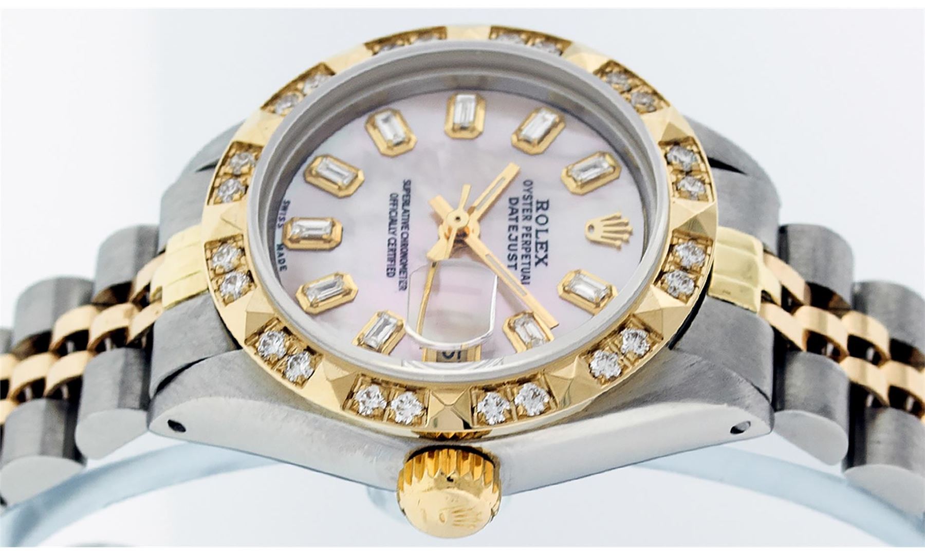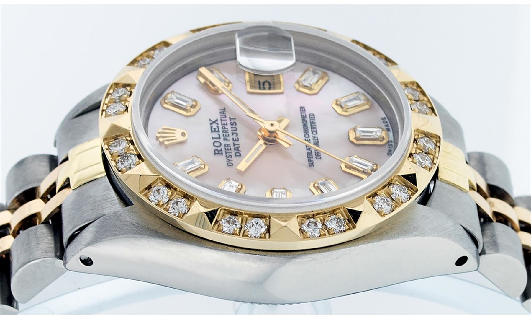 One Ladies Two Tone Rolex Datejust Polished, Serviced & Electronically Tested, Yellow Gold & Stainless Steel Case: 26mm, Yellow Gold Crown, Custom Bezel: 18K Yellow Gold Pyramid Diamond Bezel, Diamond Count: 24 Diamonds Total Weight .50 Carat, Clarity: Si-VS, Color: G to H. Custom Crystal: Synthetic Sapphire Cyclops Lens. Custom Hands: New Luminescent Hands. Movement: Automatic Winding Movement. Custom Dial: Pink Mother Of Pearl Baguette Diamond Hour Markers. 10 Baguette Diamonds In Dial, Clarity: SI-VS, Color: G to H. Date Window: 3 O'clock Position Date Display, Model: Datejust. Condition: G-6 Extra Fine. Bracelet: Two Tone Yellow Gold & Stainless Steel Jubilee. Bright Polish. 6.0 Inch Length, Adjustable. Standard Clasp, With Rolex Logo. This Watch Has Been Serviced Time Tested And Is In Excellent Condition It Is Free Of All Scratches And Dents.