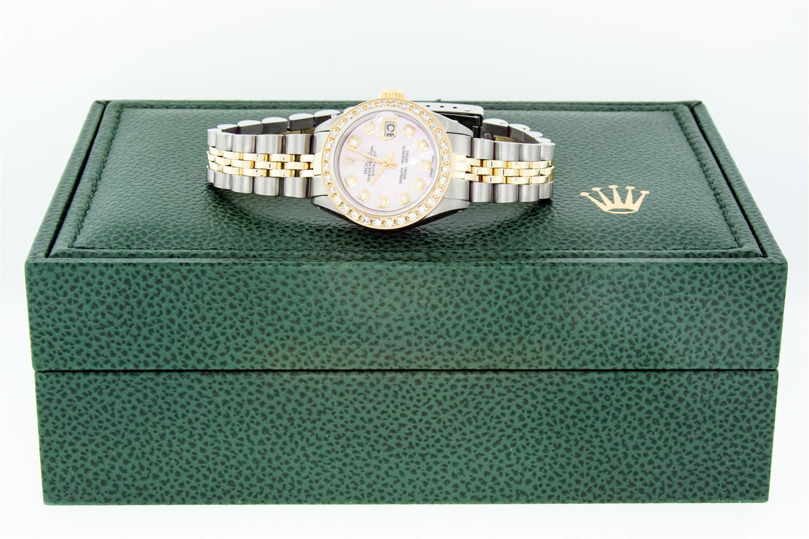 One Ladies Two Tone Rolex Datejust Polished, Serviced & Electronically Tested, Rolex Yellow Gold & Stainless Steel Case: 26mm, Rolex Yellow Gold Crown, Custom Bezel: New 18K Yellow Gold Beadset Diamond Bezel, Diamond Count: 32 Diamonds, Total Weight .70 Carat, Clarity: SI-VS, Color: G to H. Custom Crystal: New Sapphire With Magnified Date Window. Custom Hands: New Luminescent Hands. Rolex Movement: Automatic Winding Movement. Custom Dial: Pink Mother Of Pearl Diamond Dial, Diamond Count: 10 Diamonds in Dial, G To H In Color, VS Clarity. Date Window: 3 O'clock Position Date Display, Model: Datejust, Condition: G-6 Extra Fine. Rolex Bracelet: Two Tone Yellow Gold & Stainless Steel Jubilee Band. Bright Polish. 6.0 Inch Length, Adjustable. Standard Clasp, With Rolex Logo. This Pre Owned Watch Has Been Serviced Time Tested And Is In Excellent Condition It Is Free Of All Scratches And Dents. This Watch Comes With A Rolex Box.