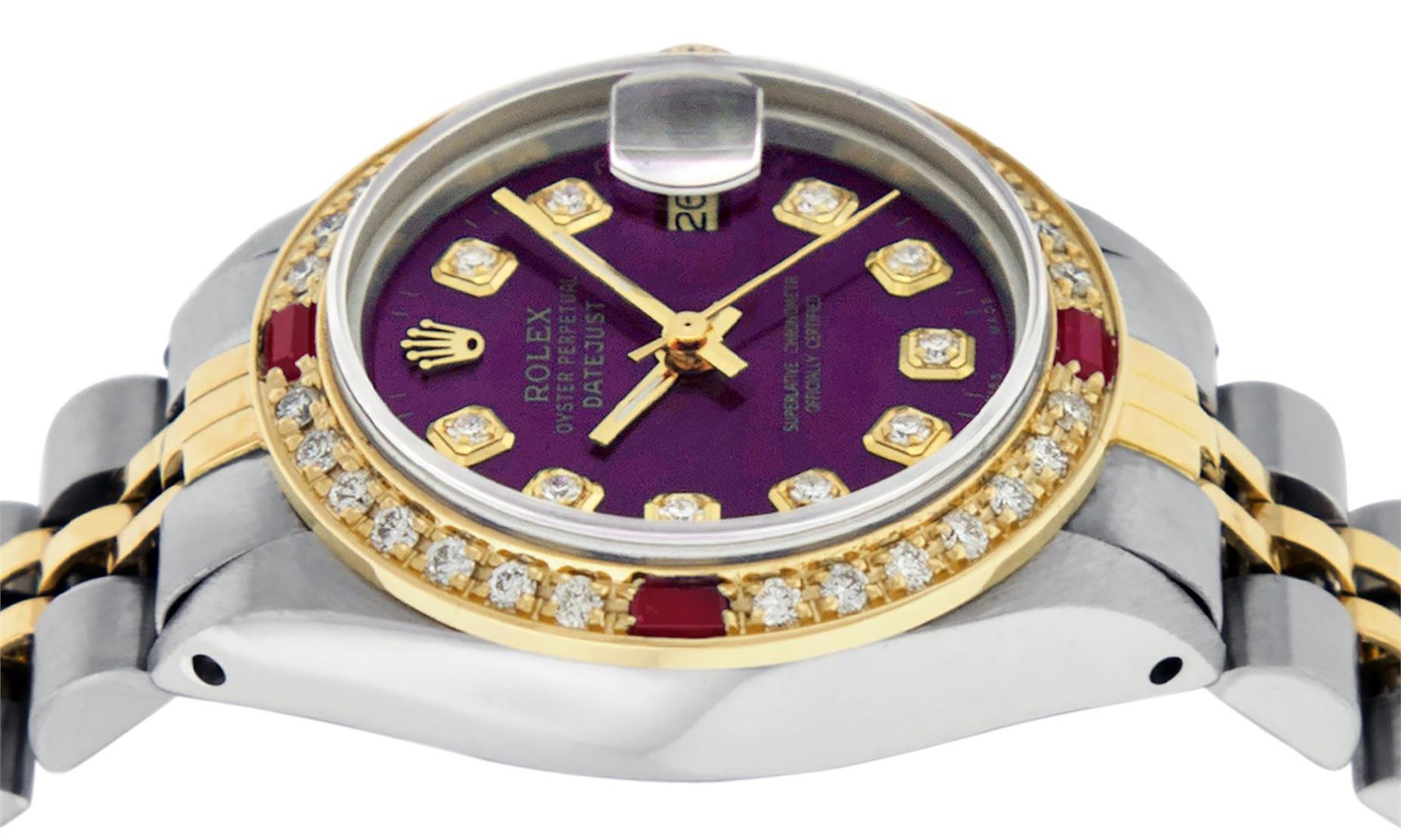 One Ladies 14K Two Tone Rolex Datejust Polished, Serviced & Electronically Tested, 14K Yellow Gold & Stainless Steel Case: 26mm, 14K Yellow Gold Crown, Custom Bezel: New 18K Yellow Gold Ruby Beadset Diamond Bezel, Diamond + Gem Count: 28 Diamonds + 4 Rubies Total Weight .70 Carat, Clarity: SI-VS, Color: G to H. Custom Crystal: New Scratch Resistant Synthetic Sapphire Cyclops Lens. Custom Hands: New Luminescent Hands. Movement: Automatic Winding Movement Caliber 2030. Custom Dial: Purple Dial Set With Single Cut Diamond Hour Markers & Dash Track, Diamond Count: 10 Diamond in Dial, G To H In Color, SI-VS Clarity. Date Window: 3 O'Clock Position Date Display, Model: Datejust, Condition: G-6 Extra Fine. Bracelet: Two Tone 14K Yellow Gold & Stainless Steel Jubilee Band. Bright Polish. 6.0 Inch Length, Adjustable. Standard Clasp, With Rolex Logo. This Watch Has Been Serviced Time Tested And Is In Excellent Condition It Is Free Of All Scratches And Dents.