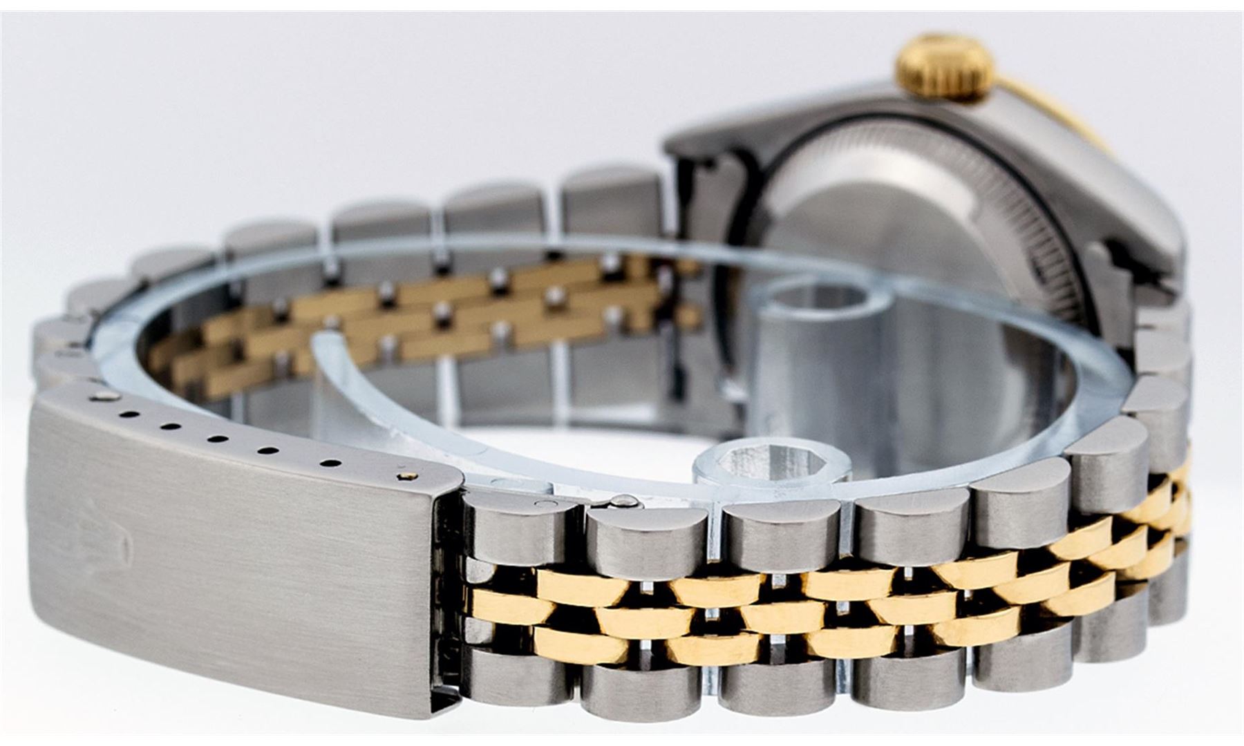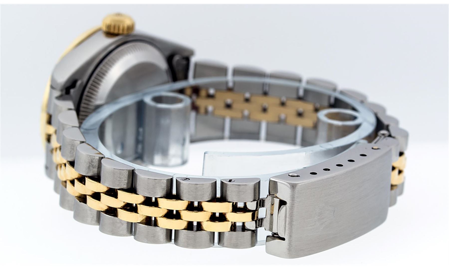 One Ladies 18K Two Tone Quickset Rolex Datejust Polished, Serviced & Electronically Tested, 18K Yellow Gold & Stainless Steel Case: 26mm, 18K Yellow Gold Crown, Custom Bezel: New 18K Yellow Gold Beadset Diamond Bezel, Diamond Count: 43 Diamonds in dial, Total Weight .70 Carat, Clarity: SI-VS, Color: G to H. Custom Crystal: New Synthetic Sapphire Cyclops Lens. Custom Hands: New Luminescent Hands. Movement: Automatic Winding Movement Caliber 2235. Custom Dial: Blue String VS Diamond Dial, Stone Count: 43 Diamonds, Clarity: VS, Color: G to H. Date Window: 3 O'Clock Position Date Display, Model: Datejust. Condition: G-6 Extra Fine. Bracelet: Two Tone 18K Yellow Gold & Stainless Steel Jubilee Band. Bright Polish. 6.0 Inch Length, Adjustable. Standard Clasp, With Rolex Logo. This Watch Has Been Serviced Time Tested And Is In Excellent Condition It Is Free Of All Scratches And Dents.