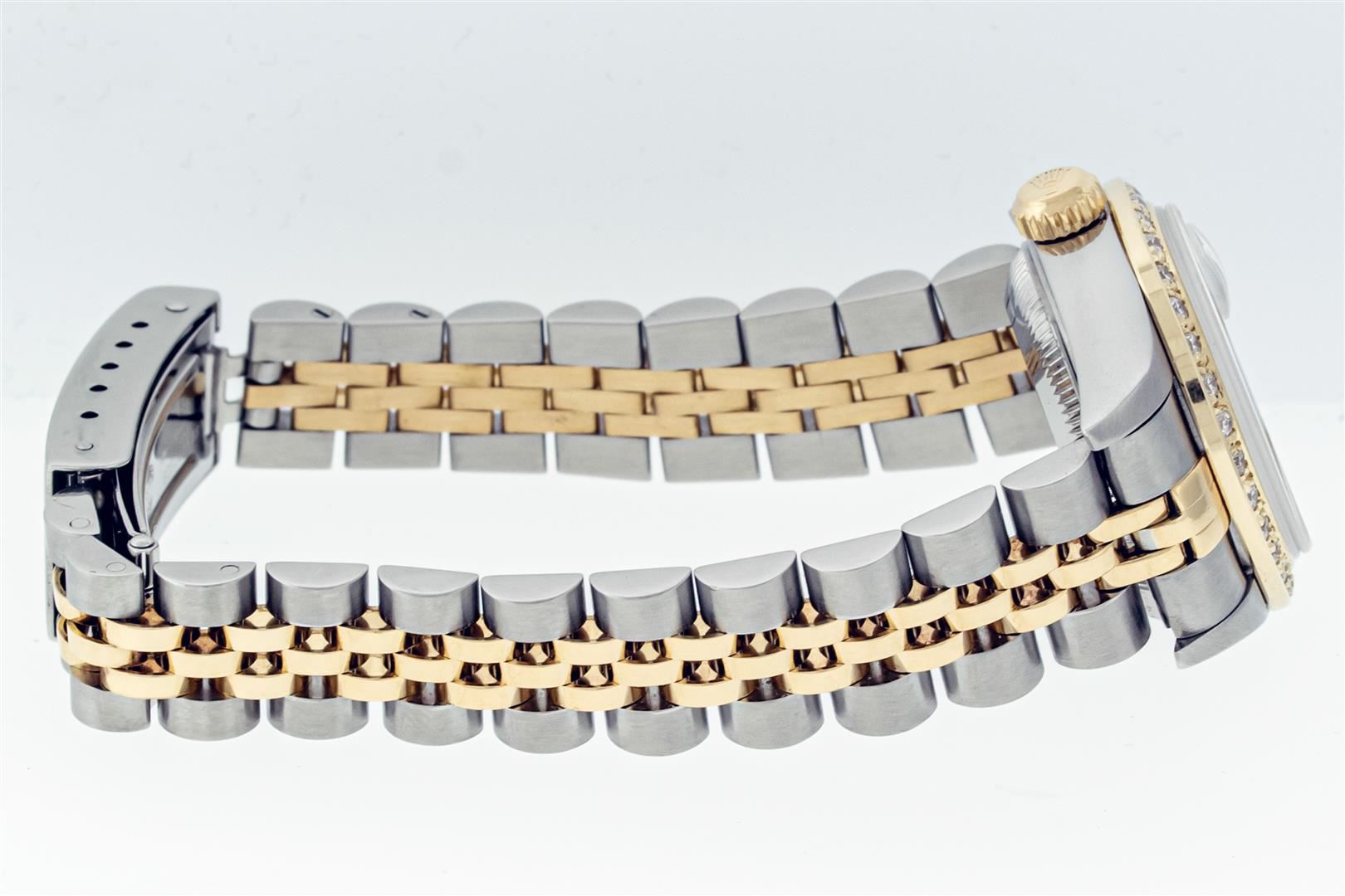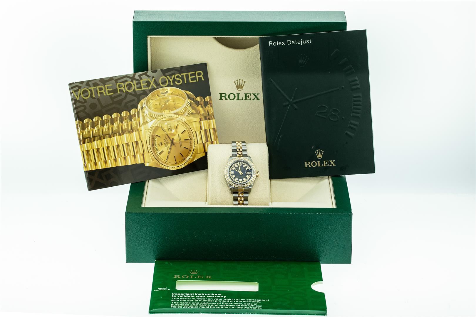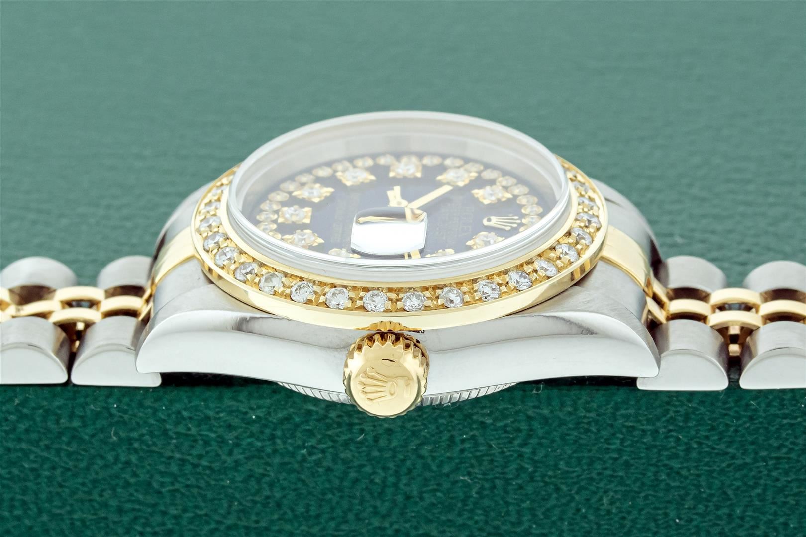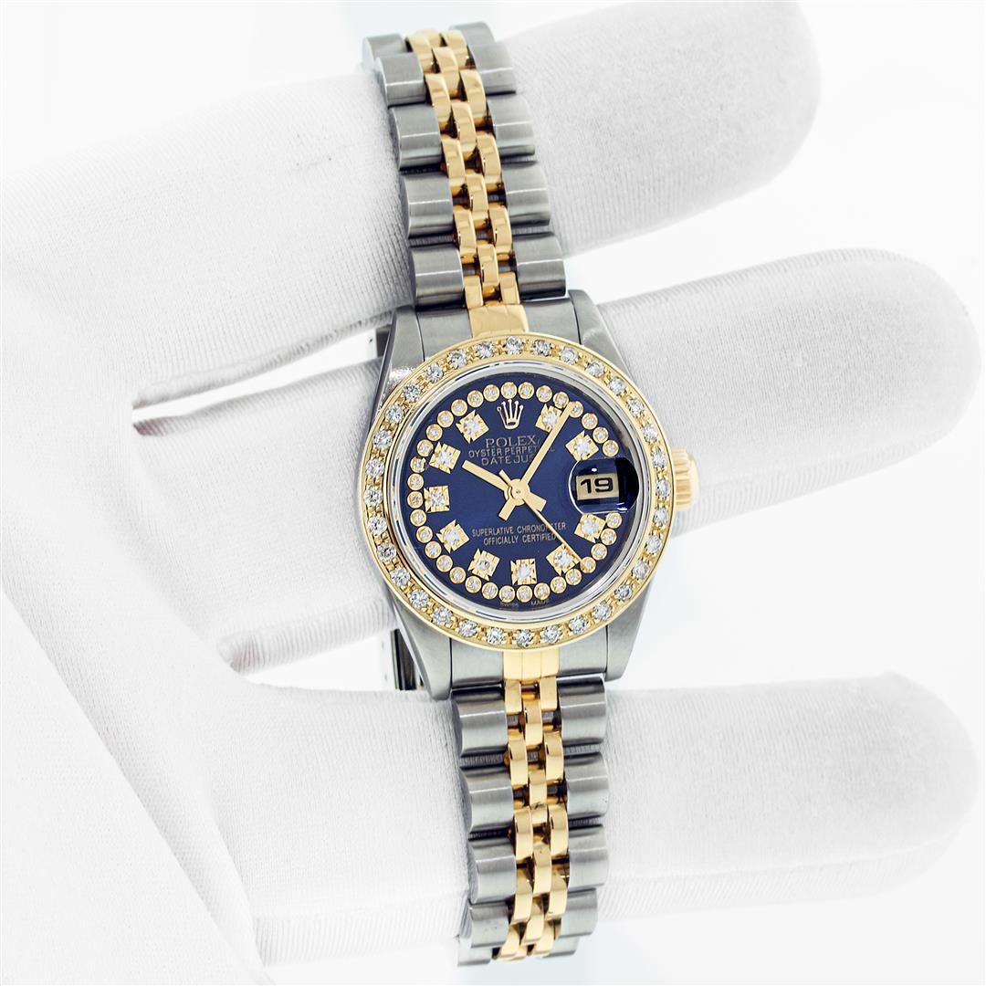 One Ladies 18K Two Tone Quickset Rolex Datejust Polished, Serviced & Electronically Tested, 18K Yellow Gold & Stainless Steel Case: 26mm, Rolex 18K Yellow Gold Crown, Custom Bezel: New 18K Yellow Gold Beadset Diamond Bezel, Diamond Count: 43 Diamonds in Dial, Total Weight .70 Carat, Clarity: SI-VS, Color: G to H. Custom Crystal: New Sapphire With Magnified Date Window. Custom Hands: New Luminescent Hands. Rolex Movement: Quickset Automatic Winding Movement. Custom Dial: Refinished To Blue With Custom Added Diamonds, Stone Count: 43 Diamonds, Clarity: VS, Color: G to H. Date Window: 3 O'clock Position Date Display, Model: Datejust. Condition: G-6 Extra Fine. Rolex Bracelet: Two Tone 18K Yellow Gold & Stainless Steel Jubilee Band. Bright Polish. 6.0 Inch Length, Adjustable. Standard Clasp, With Rolex Logo. This Pre Owned Watch Has Been Serviced Time Tested And Is In Excellent Condition It Is Free Of All Scratches And Dents. This Watch Comes With A Rolex Box and Booklets.