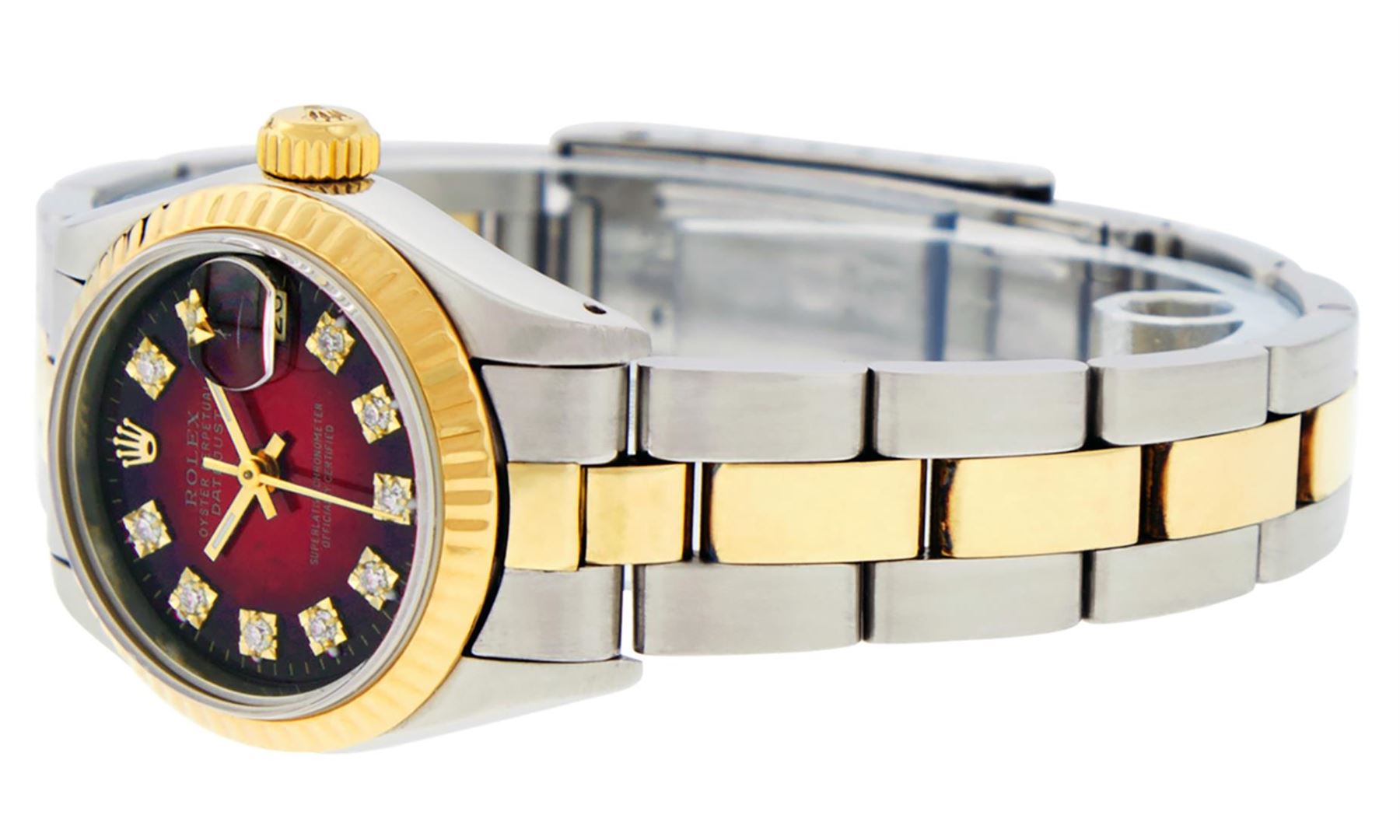 One Ladies Two Tone Rolex Datejust Polished, Serviced & Electronically Tested, Yellow Gold & Stainless Steel Case: 26mm, Yellow Gold Crown, Bezel: Yellow Gold Fluted Bezel. Custom Crystal: New Acrylic Cyclops Lens. Custom Hands: New Luminescent Hands. Movement: Automatic Winding Movement. Custom Dial: Red Vignette With Diamond Hour Markers Dash Track & Lumi Dots, Diamond Count: 10 Single Cut Diamonds, Color: G to H, Clarity: VS. Date Window: 3 O'clock Position Date Display, Model: Datejust. Condition: G-6 Extra Fine. Bracelet: Two Tone Yellow Gold & Stainless Steel Oyster Band. Bright Polish. 6.0 Inch Length, Adjustable. Standard Clasp, With Rolex Logo. This Watch Has Been Serviced Time Tested And Is In Excellent Condition It Is Free Of All Scratches And Dents.