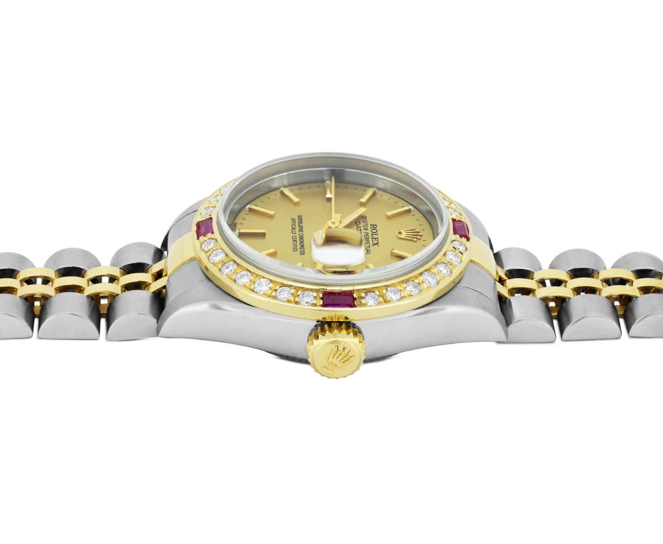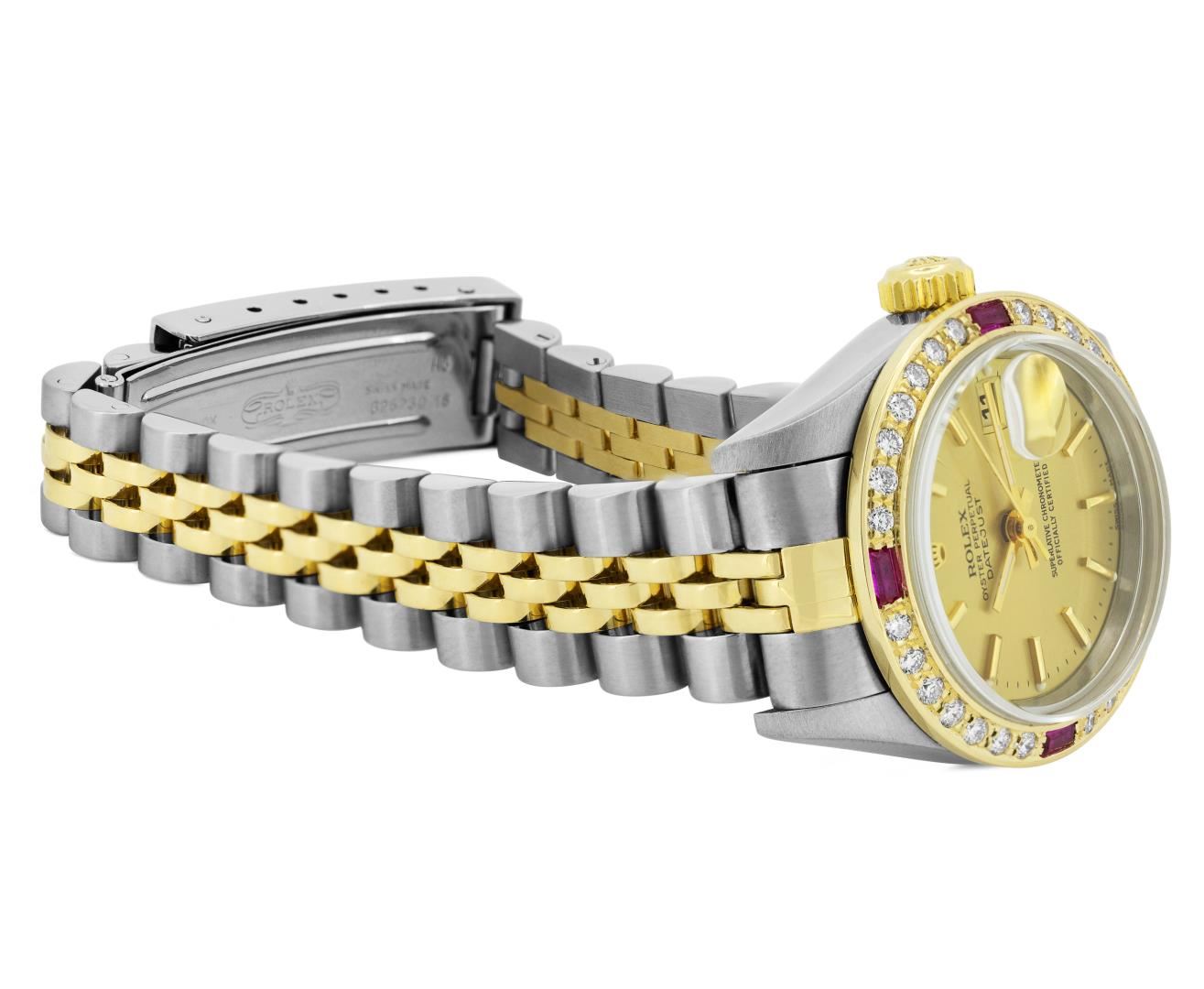 One Rolex Ladies Pre Owned Two Tone 18K Yellow Gold & Stainless Steel Rolex Datejust Polished, Serviced & Electronically Tested, Rolex Yellow Gold & Stainless Steel Case: 26mm, Rolex Yellow Gold Crown, Custom Bezel: New 18K Yellow Gold Ruby Beadset Diamond Bezel, Diamond + Gem Count: 36 Diamonds + 4 Rubies, Clarity: SI-VS, Color: G to H. Custom Crystal: New Sapphire With Magnifying Date Window. Hands: Luminescent Hands. Rolex Movement: 2235 Automatic Winding Quickset Movement. Rolex Factory Dial: Champagne Dial With Index Hour Markers, Dash Track, and Lumi Dots. Date Window: 3 O'Clock Position Date Display, Condition: G-6 Extra Fine. Rolex Bracelet: Two Tone 18K Yellow Gold & Stainless Steel Jubilee Band. Bright Polish & Satin Finish. 6.0 Inch Length, Adjustable. Fold Clasp, With Rolex Logo. This Watch Has Been Serviced And Time Tested. It Is In Excellent Condition, Free Of All Scratches And Dents. This Watch Comes With A Rolex Box.