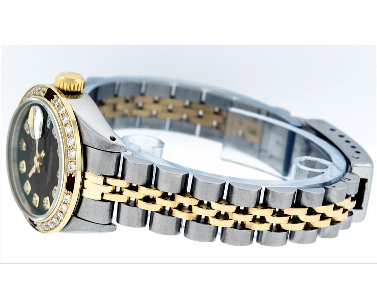 One Ladies Two Tone Rolex Datejust Polished, Serviced & Electronically Tested, 14K Yellow Gold & Stainless Steel Case:26mm, 14K Yellow Gold Crown, Custom Bezel: 18K Yellow Gold Ruby Beadset Diamond Bezel, Diamond Count: 28 Diamonds + 4 Rubies. Total Weight .70 Carat, Clarity: Si-VS, Color: G to H. Custom Crystal: Synthetic Sapphire Cyclops Lens. Movement: Automatic Winding Movement Caliber 2030. Custom Dial: Black With Diamond Hour Markers, Diamond Count: 10 Diamonds In Dial. Diamond Color: G To H, Clarity: SI-VS. Date Window: 3 O'Clock Position Date Display, Model: Datejust. Condition: G-6 Extra Fine. Bracelet: Two Tone 14K Yellow Gold & Stainless Steel Jubilee Band. Bright Polish. 5.5 Inch Length, Adjustable. Standard Clasp, With Rolex Logo.
