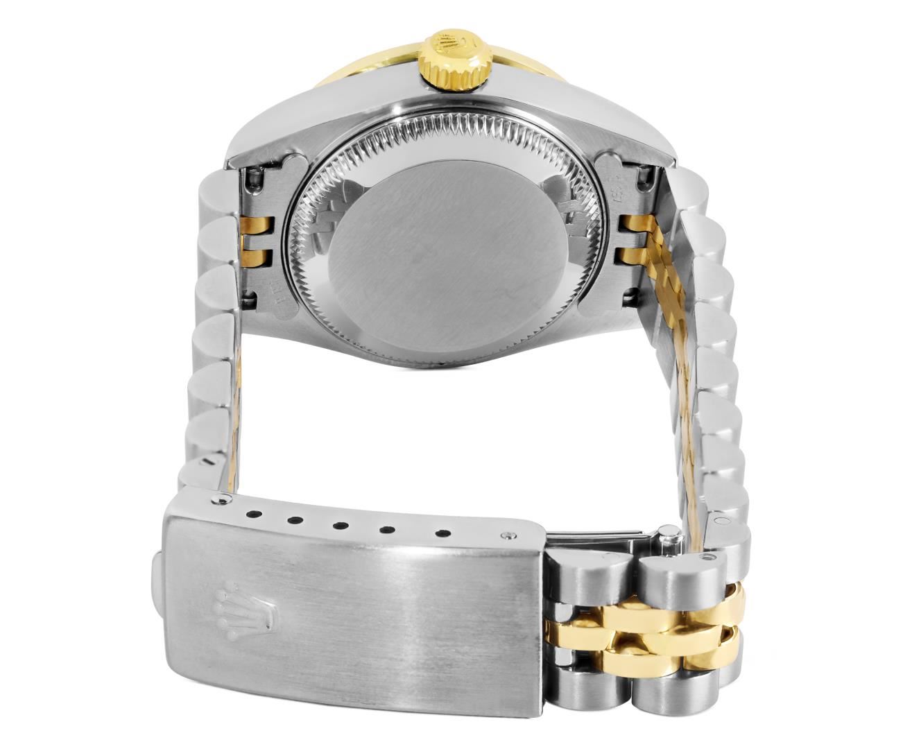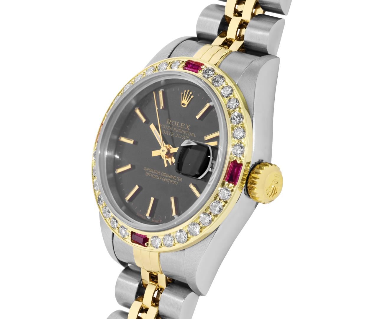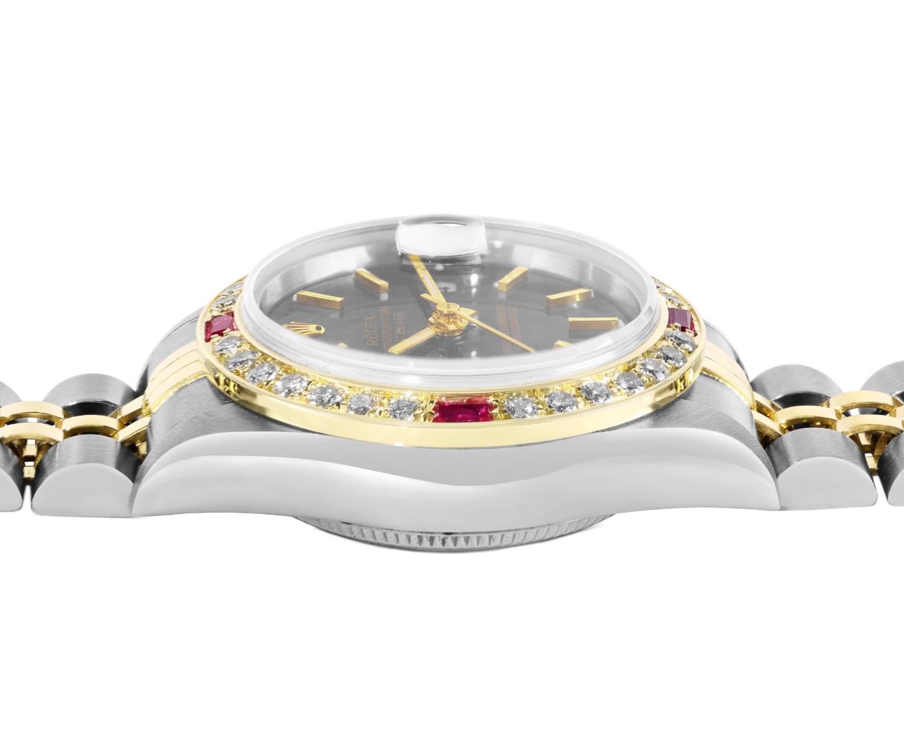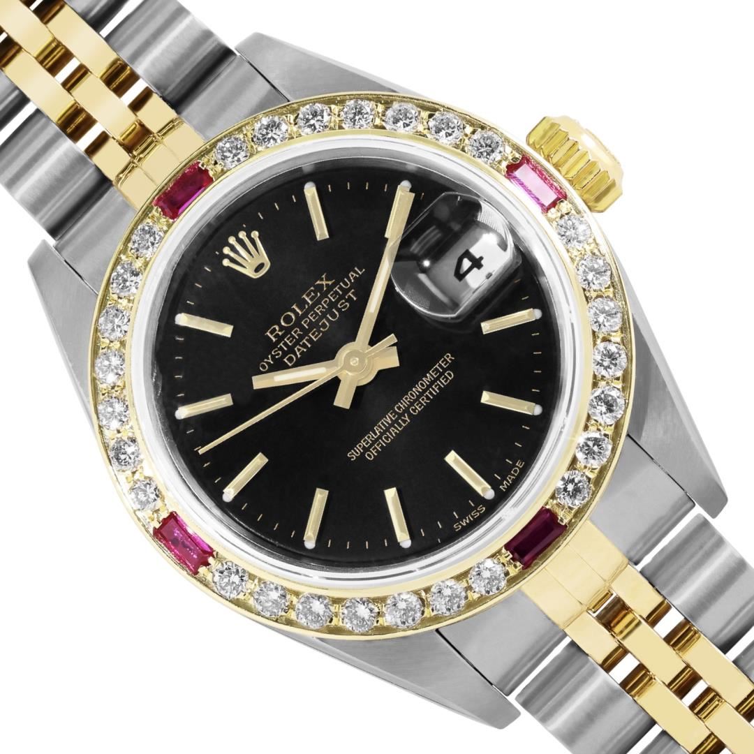 Rolex Ladies Pre Owned Quickset 18K Yellow Gold and Stainless Steel Two Tone Wristwatch Polished Bright with Satin Finish, Serviced & Electronically Tested, Rolex Case: 26mm, Rolex Yellow Gold Crown, Custom Bezel: New 18K Yellow Gold Beadset And Ruby Diamond Bezel, Stone Count: 28 Diamonds + 4 Rubies On Bezel. Crystal: Sapphire With Magnified Date Window. Hands: Luminicent Hands. Rolex Movement: 2235 Automatic Winding Movement. Rolex Dial: Black Dial With Dash Track & Lumi Dots, Date Window: 3 O'Clock Position Date Display, Model: Quickset Sapphire Datejust, Condition: G-6 Extra Fine. Rolex Bracelet: Stainless Steel and 18K Yellow Gold Jubilee Band. Bright Polish & Satin Finish. 6.0 Inch Length, Adjustable. Standard Clasp, With Rolex Logo. This Watch Has Been Serviced Time Tested And Is In Excellent Condition It Is Free Of All Scratches And Dents.