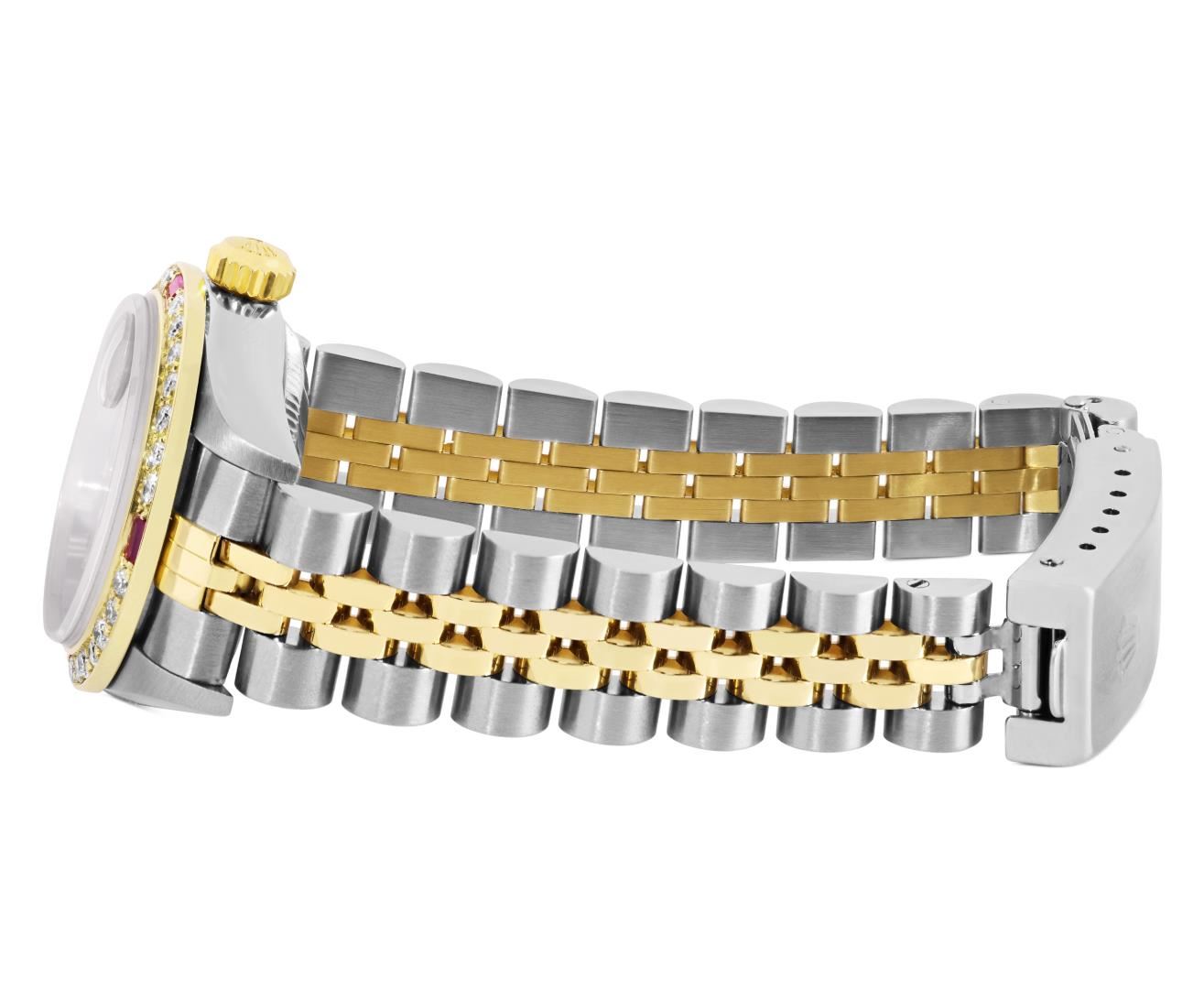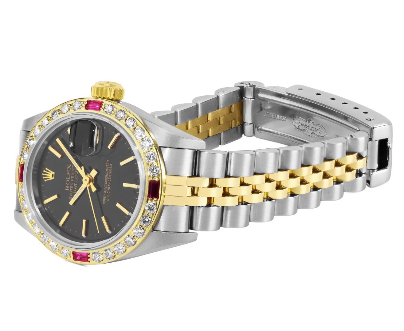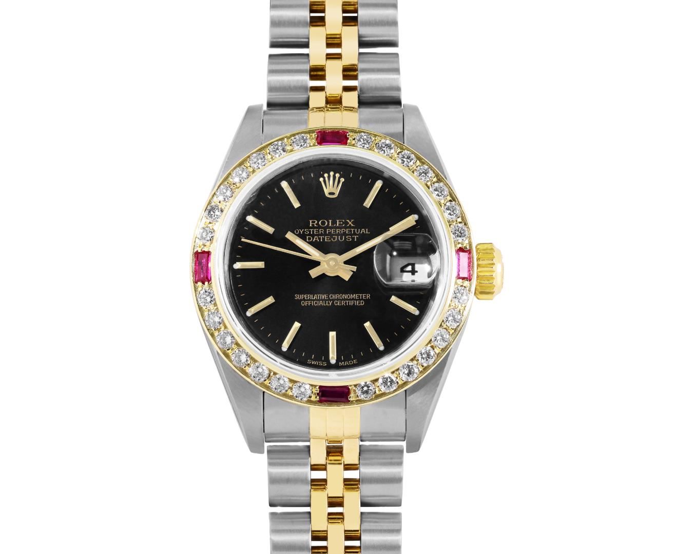 Rolex Ladies Pre Owned Quickset 18K Yellow Gold and Stainless Steel Two Tone Wristwatch Polished Bright with Satin Finish, Serviced & Electronically Tested, Rolex Case: 26mm, Rolex Yellow Gold Crown, Custom Bezel: New 18K Yellow Gold Beadset And Ruby Diamond Bezel, Stone Count: 28 Diamonds + 4 Rubies On Bezel. Crystal: Sapphire With Magnified Date Window. Hands: Luminicent Hands. Rolex Movement: 2235 Automatic Winding Movement. Rolex Dial: Black Dial With Dash Track & Lumi Dots, Date Window: 3 O'Clock Position Date Display, Model: Quickset Sapphire Datejust, Condition: G-6 Extra Fine. Rolex Bracelet: Stainless Steel and 18K Yellow Gold Jubilee Band. Bright Polish & Satin Finish. 6.0 Inch Length, Adjustable. Standard Clasp, With Rolex Logo. This Watch Has Been Serviced Time Tested And Is In Excellent Condition It Is Free Of All Scratches And Dents.