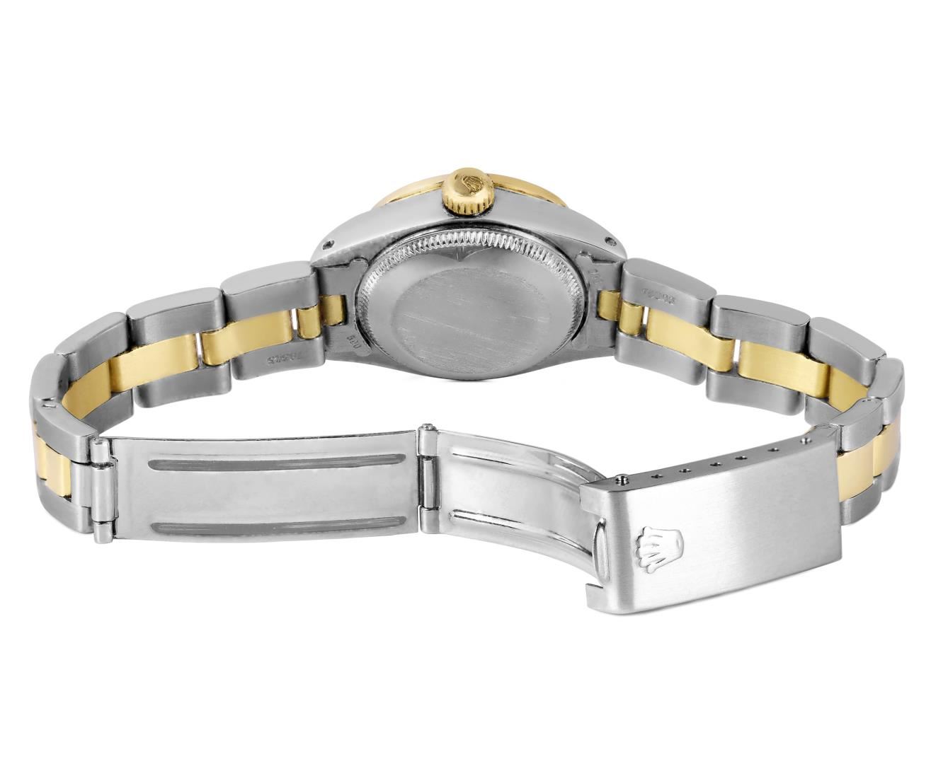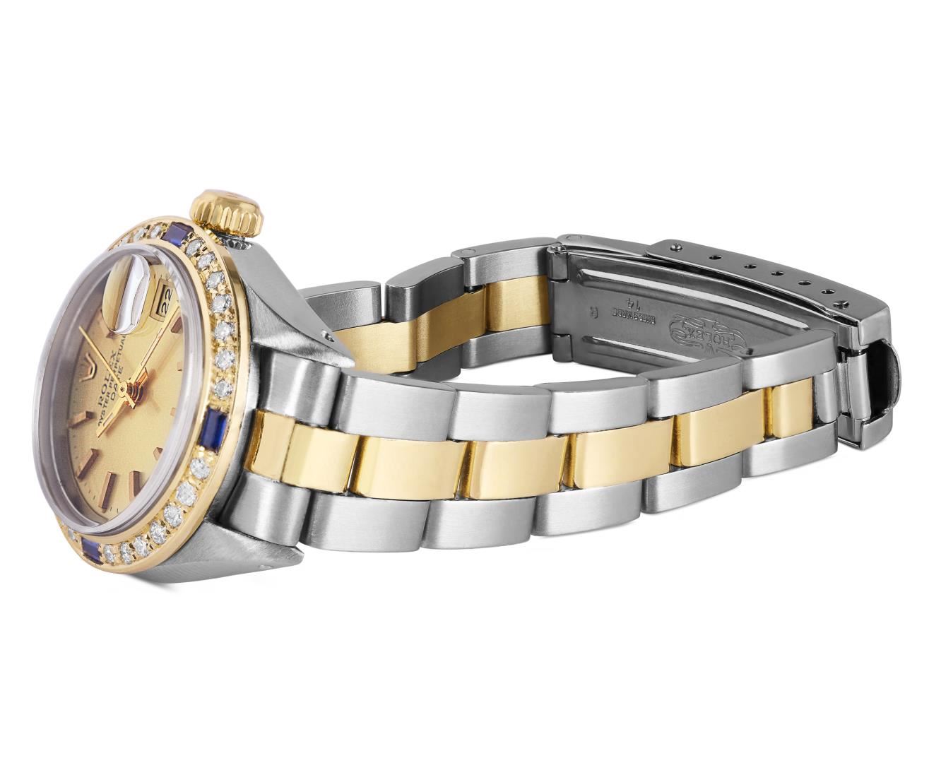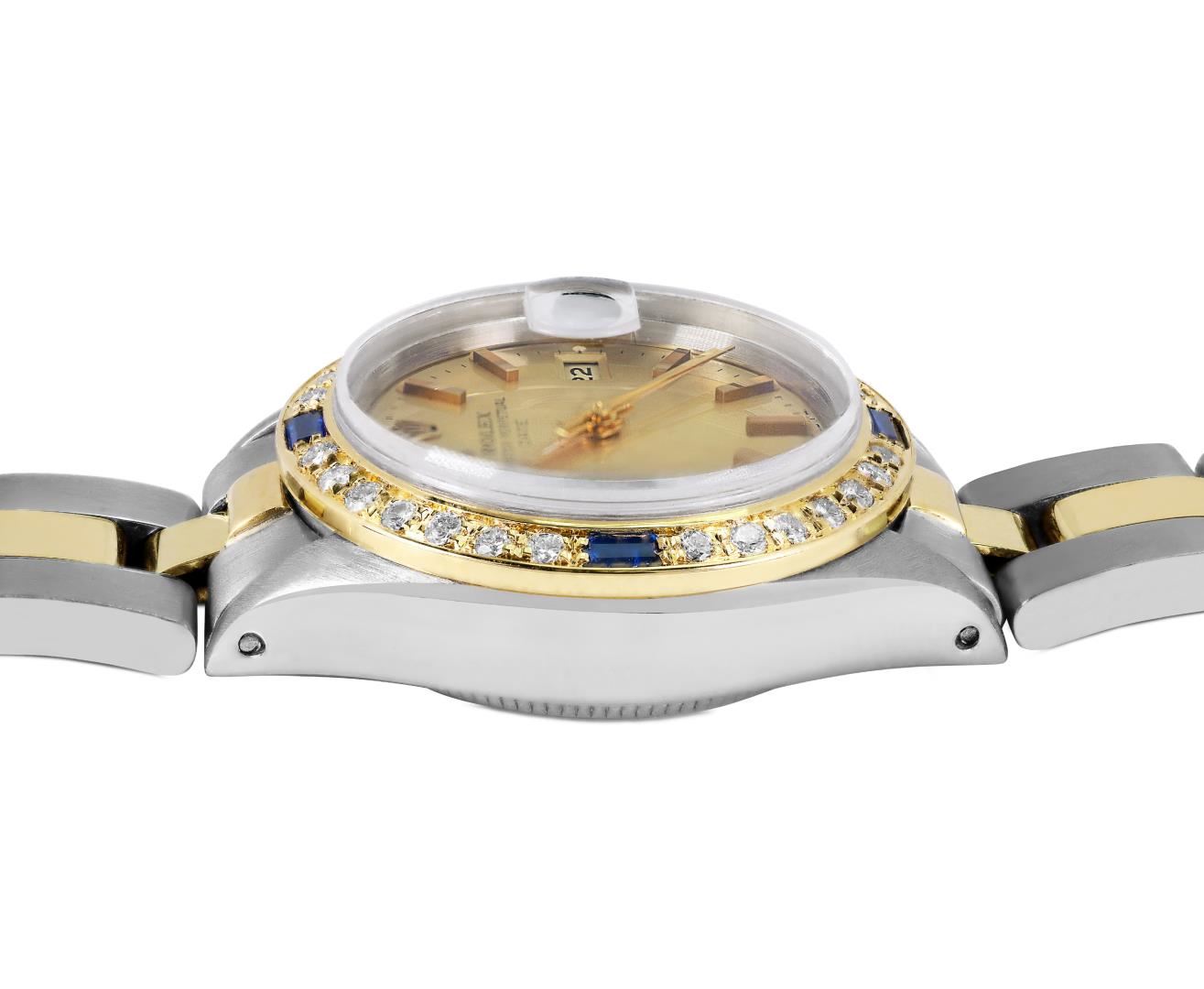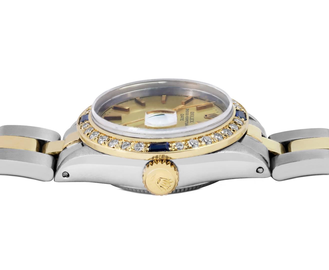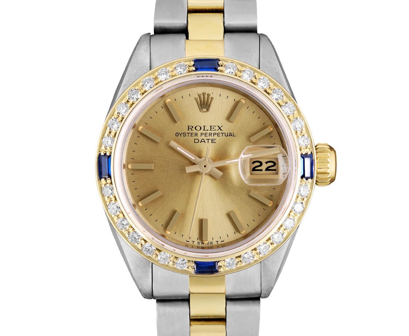 One Rolex Ladies Pre Owned Two Tone Yellow Gold And Stainless Steel Rolex Date Polished, Serviced & Electronically Tested, Rolex Yellow Gold And Stainless Steel Case: 26mm, Rolex Yellow Gold Crown. Custom Bezel: New 18K Yellow Gold Sapphire Diamond Bezel, Diamond Count: 28 Diamonds + 4 Sapphire. Crystal: Custom Sapphire Crystal With Date Window. Hands: Custom Luminescent Hands. Rolex Movement: 2035 Automatic Winding Movement. Rolex Factory Dial: Champagne Dial With Dash Track & Lumi Dots, Date Window: 3 O'clock Position Date Display, Condition: G-6 Extra Fine. Rolex Bracelet: Two Tone 14K Yellow Gold And Stainless Steel Oyster Band. Bright Polish. 6.0 Inch Length, Adjustable. Standard Clasp, With Rolex Logo. This Watch Has Been Serviced Time Tested And Is In Excellent Condition It Is Free Of All Scratches And Dents. This Watch Comes With A Rolex Box.