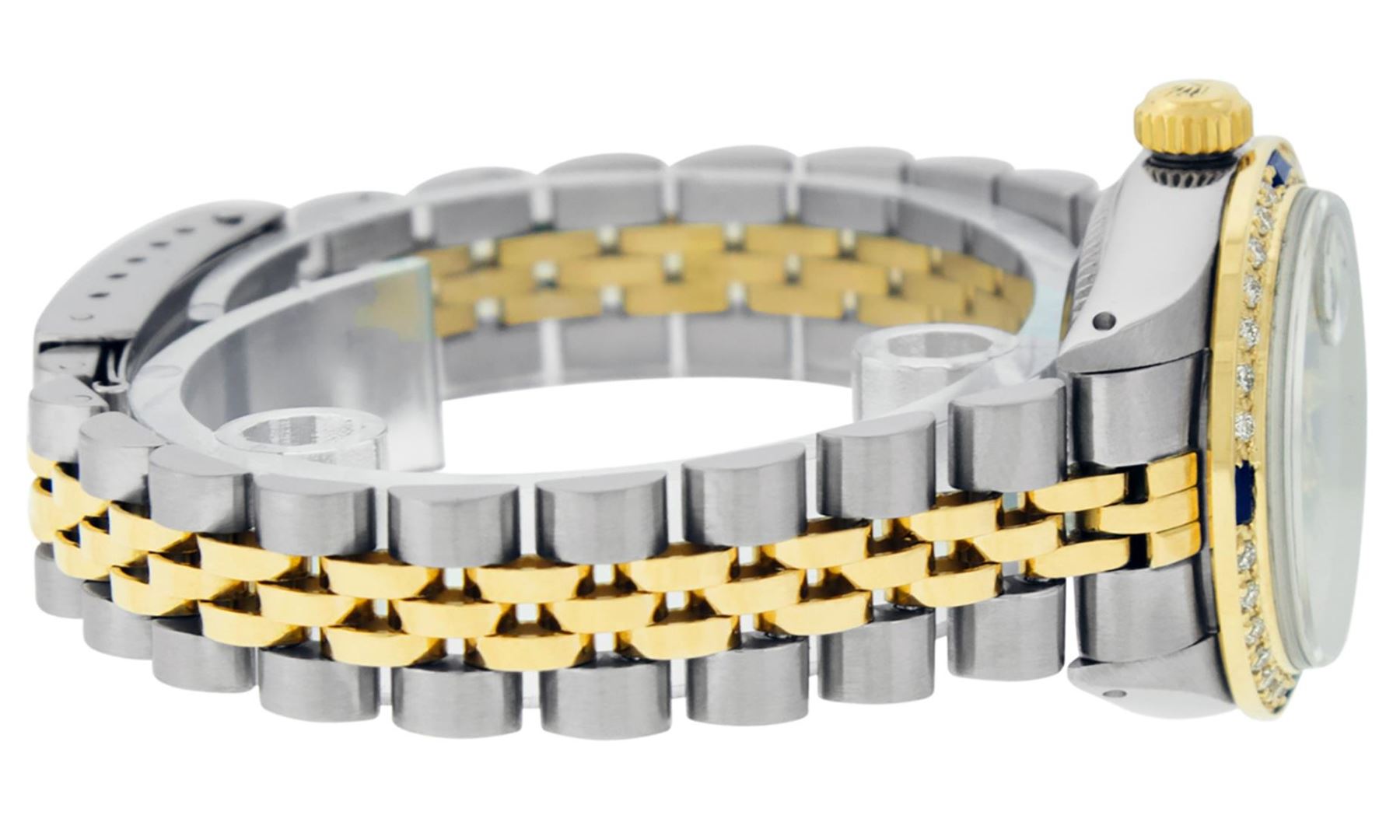 One Ladies Pre Owned Rolex Quickset Two Tone 18K Yellow Gold And Stainless Steel Datejust Polished, Serviced & Electronically Tested, Yellow Gold And Stainless Steel Case: 26mm, Yellow Gold Crown, Custom Bezel: New 18K Yellow Gold Sapphire Beadset Diamond Bezel, Diamond + Gem Count: 28 Diamonds + 4 Sapphires. Custom Crystal: New Sapphire With Date Window. Custom Hands: New Luminescent Hands. Rolex Movement: Automatic Winding Movement 2135. Custom Dial: Custom Black Dial With Added Diamonds, Diamond Count: 10 Diamond in Dial. Date Window: 3 O'Clock Position Date Display, Model: Quickset Datejust, Condition: G-6 Extra Fine. Rolex Bracelet: Two Tone 18K Yellow Gold & Stainless Steel Jubilee Band. Bright Polish. 6.0 Inch Length, Adjustable. Standard Clasp, With Rolex Logo. This Watch Has Been Serviced Time Tested And Is In Excellent Condition It Is Free Of All Scratches And Dents.