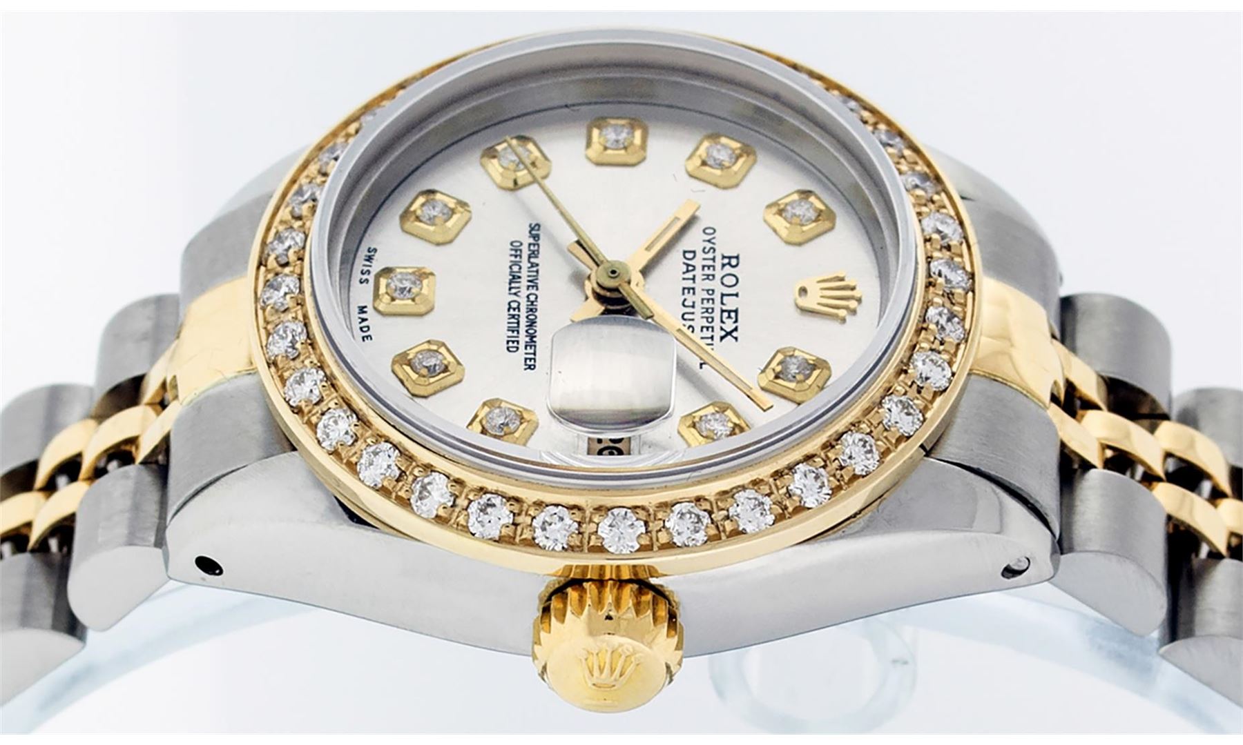 One Ladies Two Tone Rolex Datejust Polished, Serviced & Electronically Tested, Yellow Gold & Stainless Steel Case: 26mm, Yellow Gold Crown, Custom Bezel: 18K Yellow Gold Beadset Diamond Bezel, Diamond Count: 32 Diamonds Total Weight .70 Carat, Clarity: Si-VS, Color: G to H. Custom Crystal: Synthetic Sapphire Cyclops Lens. Custom Hands: New Luminescent Hands. Movement: Automatic Winding Movement. Custom Dial: Silver Dial Set With Diamond Hour Markers, 10 Diamond in Dial G To H In Color, Si-VS Clarity. Date Window: 3 O'Clock Position Date Display, Model: Datejust. Condition: G-6 Extra Fine. Bracelet: Two Tone Yellow Gold & Stainless Steel Jubilee. Bright Polish. 6.0 Inch Length, Adjustable. Standard Clasp, With Rolex Logo. This Watch Has Been Serviced Time Tested And Is In Excellent Condition It Is Free Of All Scratches And Dents.
