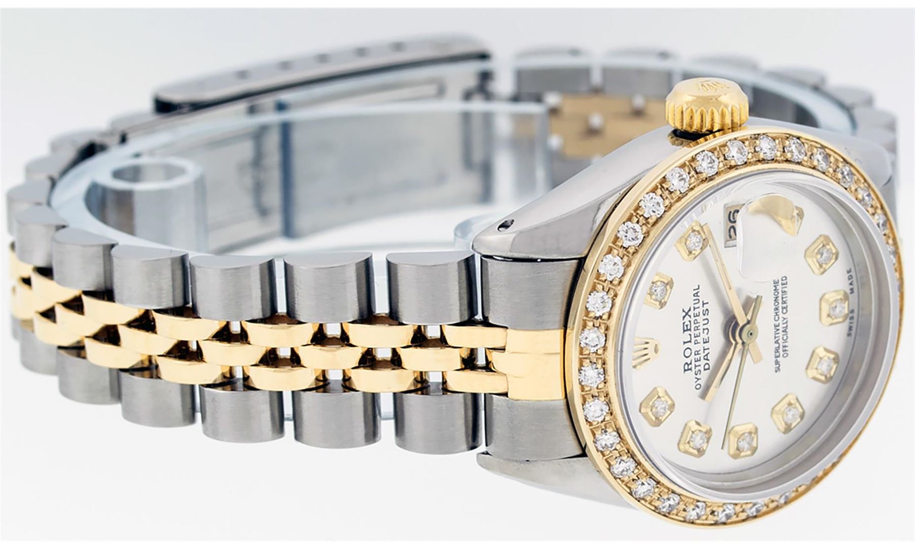 One Ladies Two Tone Rolex Datejust Polished, Serviced & Electronically Tested, Yellow Gold & Stainless Steel Case: 26mm, Yellow Gold Crown, Custom Bezel: 18K Yellow Gold Beadset Diamond Bezel, Diamond Count: 32 Diamonds Total Weight .70 Carat, Clarity: Si-VS, Color: G to H. Custom Crystal: Synthetic Sapphire Cyclops Lens. Custom Hands: New Luminescent Hands. Movement: Automatic Winding Movement. Custom Dial: Silver Dial Set With Diamond Hour Markers, 10 Diamond in Dial G To H In Color, Si-VS Clarity. Date Window: 3 O'Clock Position Date Display, Model: Datejust. Condition: G-6 Extra Fine. Bracelet: Two Tone Yellow Gold & Stainless Steel Jubilee. Bright Polish. 6.0 Inch Length, Adjustable. Standard Clasp, With Rolex Logo. This Watch Has Been Serviced Time Tested And Is In Excellent Condition It Is Free Of All Scratches And Dents.