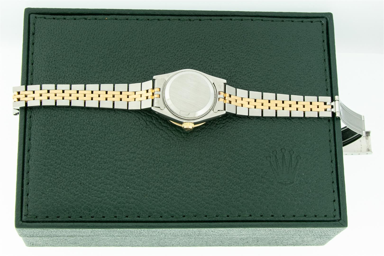 One Ladies Two Tone Rolex Datejust Polished, Serviced & Electronically Tested, Rolex Yellow Gold & Stainless Steel Case: 26mm, Rolex Yellow Gold Crown, Custom Bezel: New 18K Yellow Gold Beadset Diamond Bezel, Diamond Count: 32 Diamonds Total Weight .70 Carat, Clarity: Si-VS, Color: G to H. Custom Crystal: New Sapphire With Magnified Date Window. Custom Hands: New Luminescent Hands. Rolex Movement: Automatic Winding Movement. Custom Dial: Refinished To Silver With Added Diamond Hour Markers, 10 Diamond in Dial G To H In Color, Si-VS Clarity. Date Window: 3 O'clock Position Date Display, Model: Datejust. Condition: G-6 Extra Fine. Rolex Bracelet: Two Tone Yellow Gold & Stainless Steel Jubilee Band. Bright Polish. 6.0 Inch Length, Adjustable. Standard Clasp, With Rolex Logo. This Pre Owned Watch Has Been Serviced Time Tested And Is In Excellent Condition It Is Free Of All Scratches And Dents.