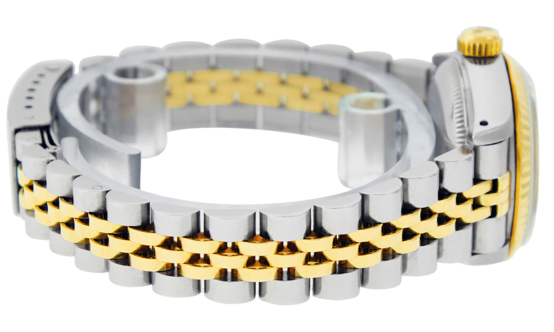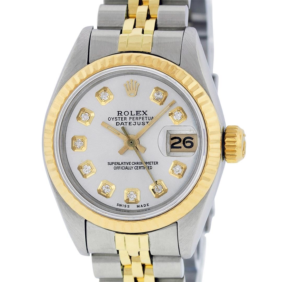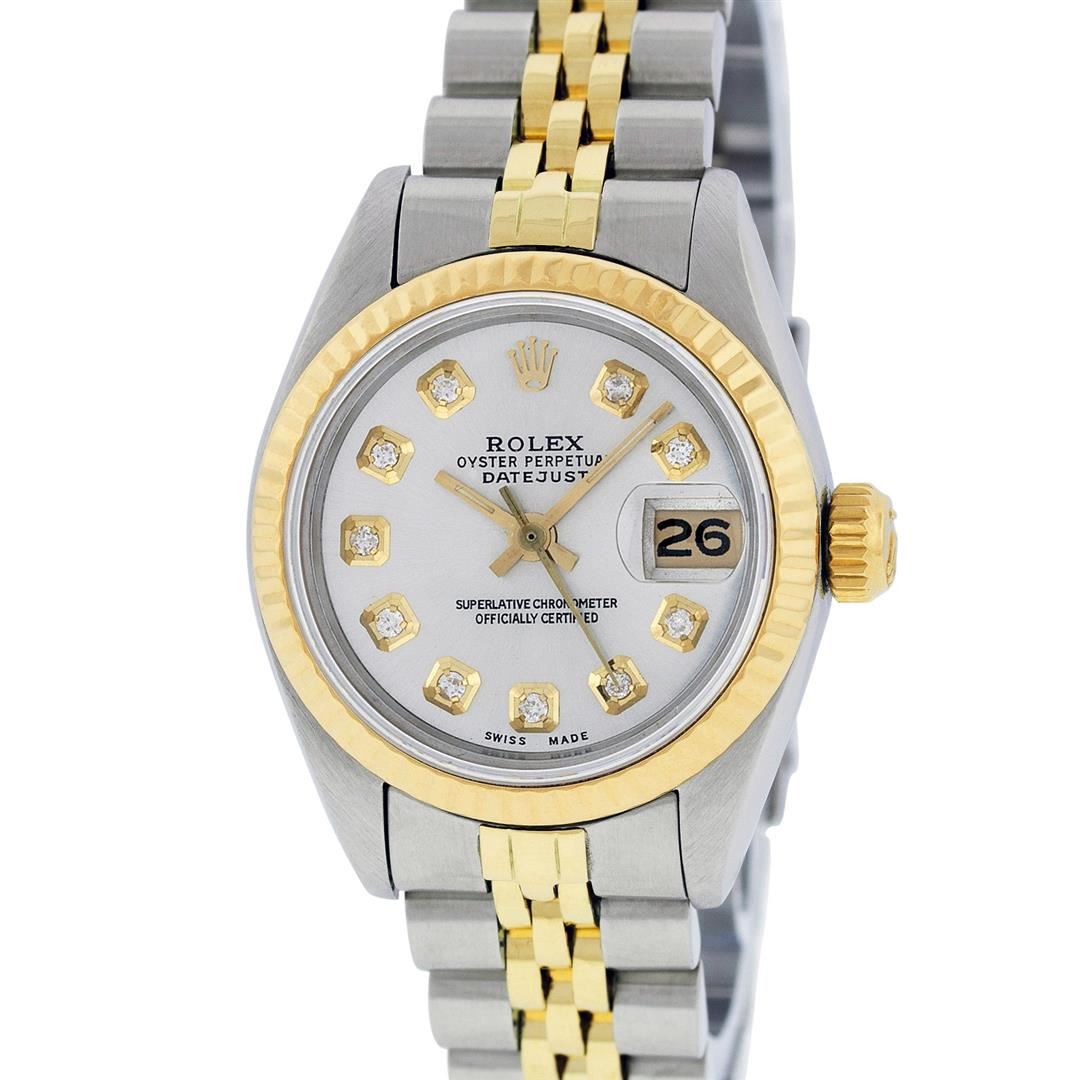 One Ladies Pre Owned Two Tone Rolex Datejust Polished, Serviced & Electronically Tested, Yellow Gold & Stainless Steel Case: 26mm, Yellow Gold Crown, Rolex Bezel: Yellow Gold Fluted Bezel. Custom Crystal: New Acrylic Cyclops Lens. Custom Hands: New Luminescent Hands. Rolex Movement: Automatic Winding Movement. Custom Dial: Refinished To Silver With Diamond Hour Markers, Diamond Count: 10 Diamonds, Color: G to H, Clarity: VS2-SI1. Date Window: 3 O'Clock Position Date Display, Model: Datejust. Condition: G-6 Extra Fine. Rolex Bracelet: Two Tone Yellow Gold & Stainless Steel Jubilee Band. Bright Polish. 6.0 Inch Length, Adjustable. Standard Clasp, With Rolex Logo. This Watch Has Been Serviced Time Tested And Is In Excellent Condition It Is Free Of All Scratches And Dents.