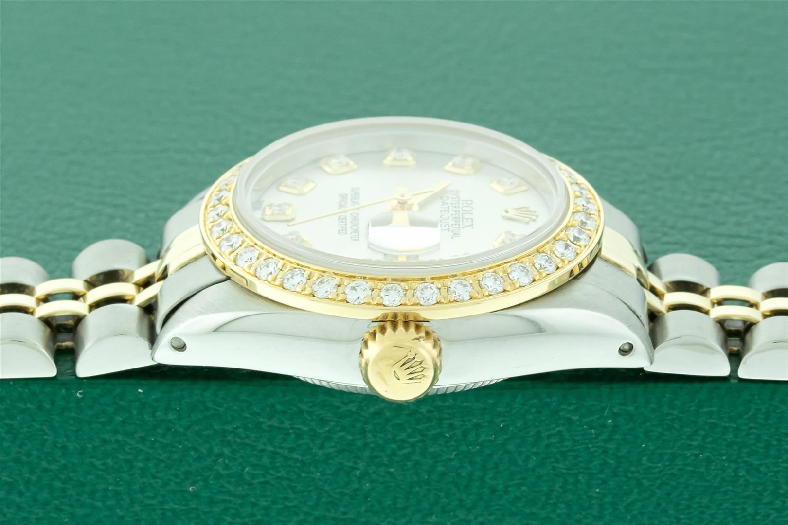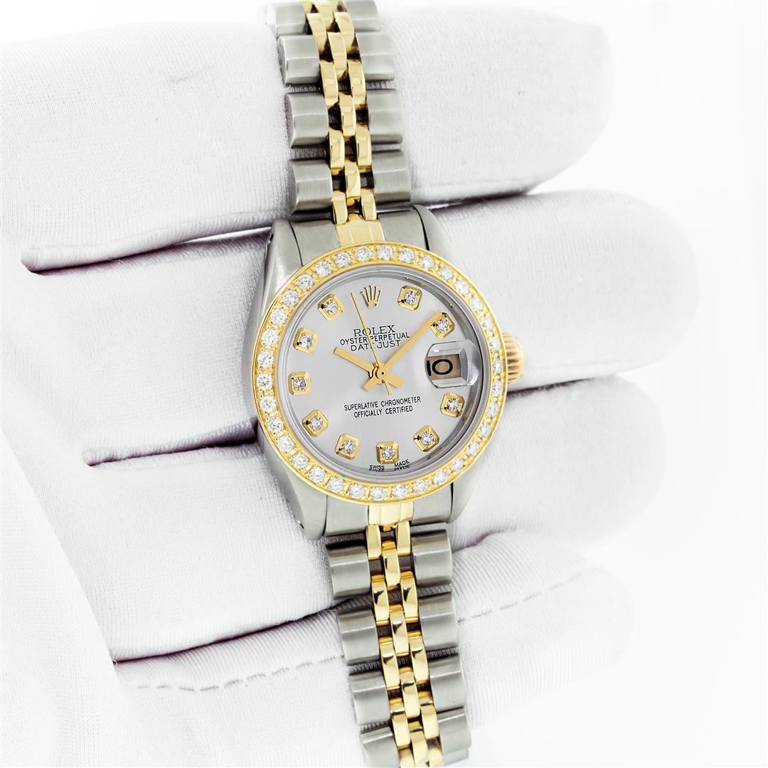One Ladies Two Tone Rolex Datejust Polished, Serviced & Electronically Tested, Yellow Gold & Stainless Steel Case: 26mm, Rolex Yellow Gold Crown, Custom Bezel: New 18K Yellow Gold Beadset Diamond Bezel, Diamond Count: 32 Diamonds, Total Weight .70 Carat, Clarity: SI-VS, Color: G to H. Custom Crystal: New Sapphire With Magnified Date Window. Custom Hands: New Hands. Rolex Movement: Automatic Winding Movement. Custom Dial: Refinished To Silver With Added Diamond Hour Markers, Diamond Count: 10 Diamonds in Dial, G To H In Color, VS Clarity. Date Window: 3 O'clock Position Date Display, Model: Datejust, Condition: G-6 Extra Fine. Rolex Bracelet: Two Tone Yellow Gold & Stainless Steel Jubilee Band. Bright Polish. 6.0 Inch Length, Adjustable. Standard Clasp, With Rolex Logo. This Pre Owned Watch Has Been Serviced Time Tested And Is In Excellent Condition It Is Free Of All Scratches And Dents. This Watch Comes With A Rolex Box And Booklets.