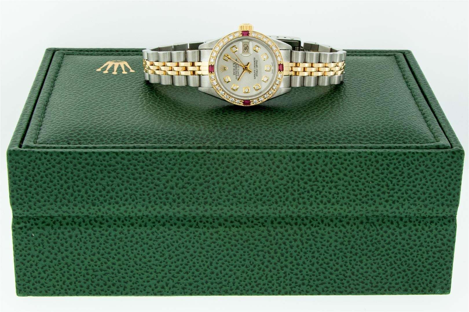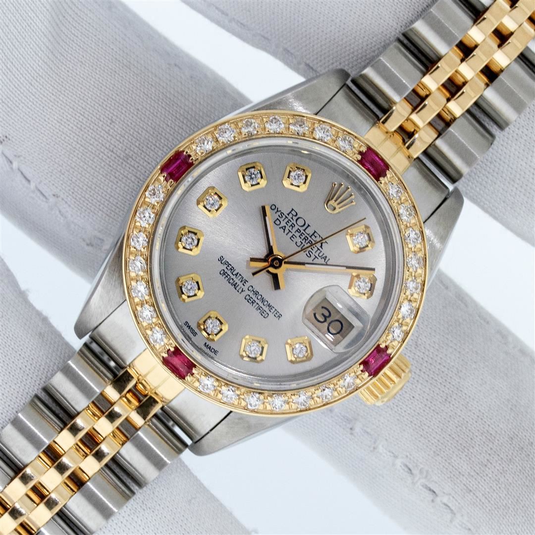 One Ladies Two Tone Rolex Datejust Polished, Serviced & Electronically Tested, Rolex Yellow Gold & Stainless Steel Case: 26mm, Rolex Yellow Gold Crown, Custom Bezel: New 18K Yellow Gold Ruby Beadset Diamond Bezel, Diamond + Gem Count: 28 Diamonds + 4 Rubies Total Weight .70 Carat, Clarity: SI-VS, Color: G to H. Custom Crystal: New Sapphire With Magnified Date Window. Custom Hands: New Luminescent Hands. Rolex Movement: Automatic Winding Movement. Custom Dial: Refinished To Silver With Added Diamond Hour Markers, Diamond Count: 10 Diamonds On Dial, G To H In Color, Si-VS Clarity. Date Window: 3 O'clock Position Date Display, Model: Datejust, Condition: G-6 Extra Fine. Rolex Bracelet: Two Tone Yellow Gold & Stainless Steel Jubilee Band. Bright Polish. 6.0 Inch Length, Adjustable. Standard Clasp, With Rolex Logo. This Pre Owned Watch Has Been Serviced Time Tested And Is In Excellent Condition It Is Free Of All Scratches And Dents.