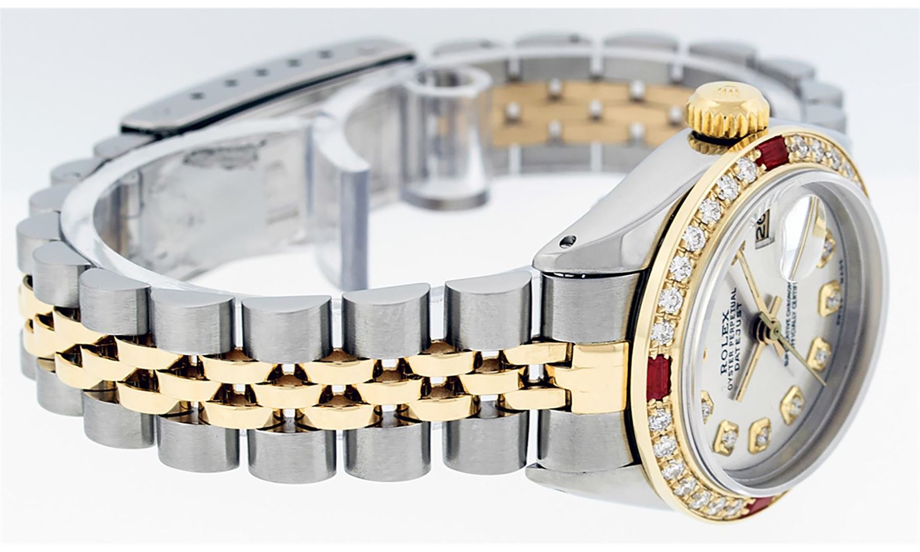 One Ladies Two Tone Rolex Datejust Polished, Serviced & Electronically Tested, Yellow Gold & Stainless Steel Case: 26mm, Yellow Gold Crown, Custom Bezel: New 18K Yellow Gold Ruby Beadset Diamond Bezel, Diamond + Gem Count: 28 Diamonds + 4 Rubies Total Weight .70 Carat, Clarity: Si-VS, Color: G to H. Custom Crystal: New Synthetic Sapphire Cyclops Lens. Custom Hands: New Luminescent Hands. Movement: Automatic Winding Movement. Custom Dial: Silver With Diamond Hour Markers, Diamond Count: 10 Diamonds On Dial, G To H In Color, Si-VS Clarity. Date Window: 3 O'clock Position Date Display, Model: Datejust, Condition: G-6 Extra Fine. Bracelet: Two Tone Yellow Gold & Stainless Steel Jubilee. Bright Polish. 6.0 Inch Length, Adjustable. Standard Clasp, With Rolex Logo. This Watch Has Been Serviced Time Tested And Is In Excellent Condition It Is Free Of All Scratches And Dents.