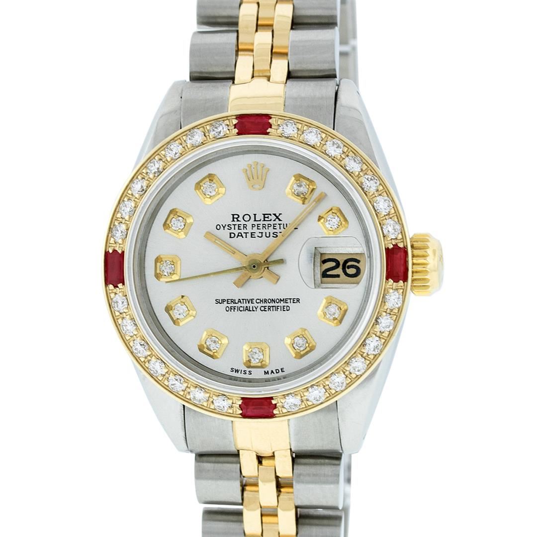 One Ladies Two Tone Rolex Datejust Polished, Serviced & Electronically Tested, Yellow Gold & Stainless Steel Case: 26mm, Yellow Gold Crown, Custom Bezel: New 18K Yellow Gold Ruby Beadset Diamond Bezel, Diamond + Gem Count: 28 Diamonds + 4 Rubies Total Weight .70 Carat, Clarity: Si-VS, Color: G to H. Custom Crystal: New Synthetic Sapphire Cyclops Lens. Custom Hands: New Luminescent Hands. Movement: Automatic Winding Movement. Custom Dial: Silver With Diamond Hour Markers, Diamond Count: 10 Diamonds On Dial, G To H In Color, Si-VS Clarity. Date Window: 3 O'clock Position Date Display, Model: Datejust, Condition: G-6 Extra Fine. Bracelet: Two Tone Yellow Gold & Stainless Steel Jubilee. Bright Polish. 6.0 Inch Length, Adjustable. Standard Clasp, With Rolex Logo. This Watch Has Been Serviced Time Tested And Is In Excellent Condition It Is Free Of All Scratches And Dents.