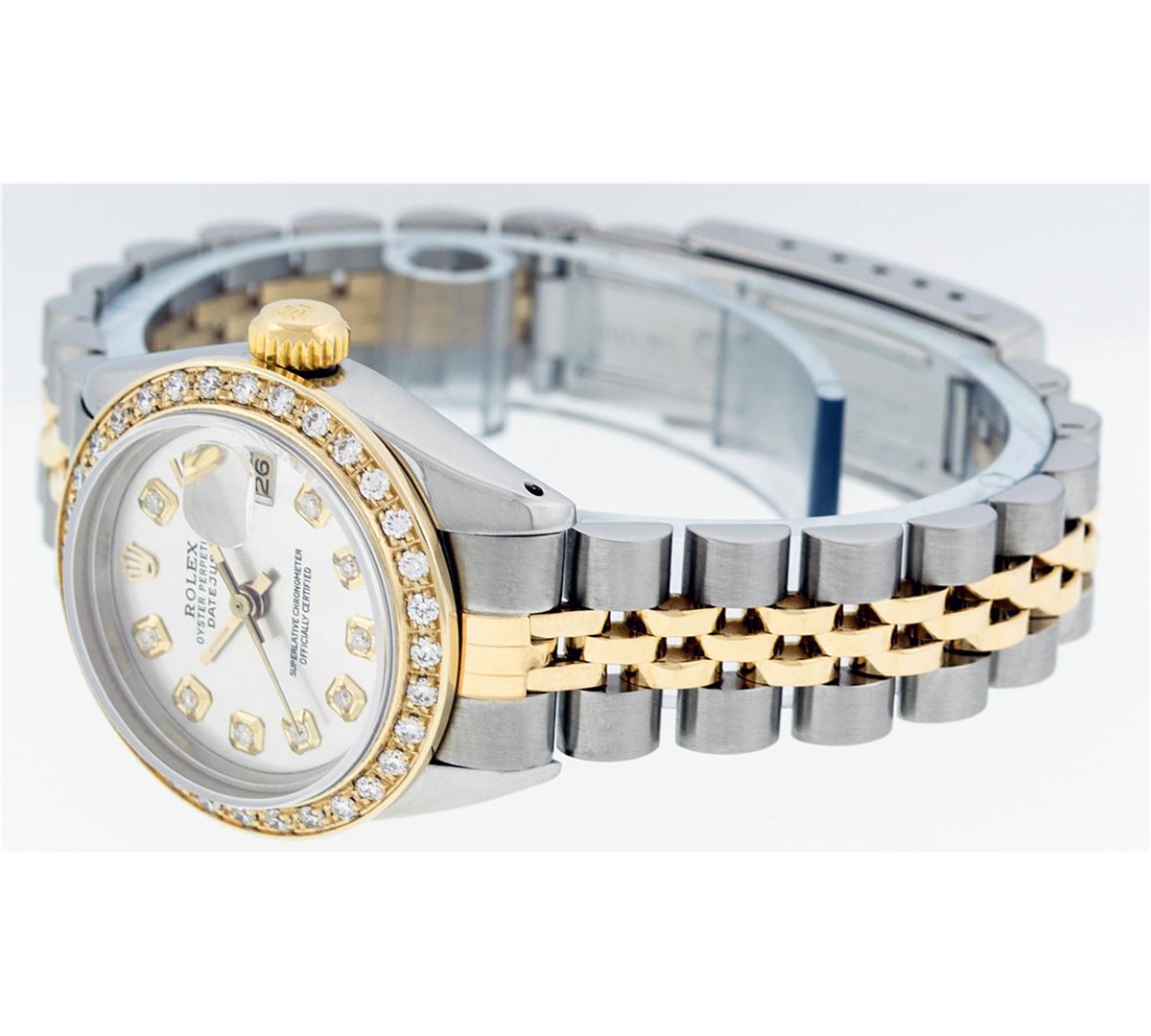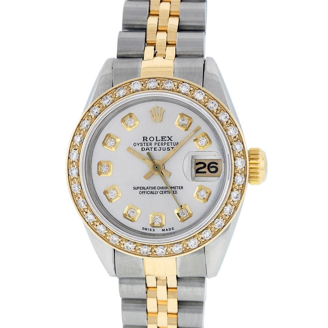 One Ladies Two Tone Rolex Datejust Polished, Serviced & Electronically Tested, 14K Yellow Gold & Stainless Steel Case: 26mm, 14K Yellow Gold Crown, Custom Bezel: 18K Yellow Gold Beadset Diamond Bezel, Diamond Count: 32 Diamonds Total Weight .70 Carat, Clarity: Si-VS, Color: G to H. Custom Crystal: Synthetic Sapphire Cyclops Lens. Movement: Automatic Winding Movement Caliber 2030. Custom Dial: Silver Dial Set With Diamond Hour Markers, 10 Diamond in Dial G To H In Color, Si-VS Clarity. Date Window: 3 O'Clock Position Date Display, Model: Datejust. Condition: G-6 Extra Fine. Bracelet: Two Tone 14K Yellow Gold & Stainless Steel Jubilee. Bright Polish. 6.0 Inch Length, Adjustable. Standard Clasp, With Rolex Logo.