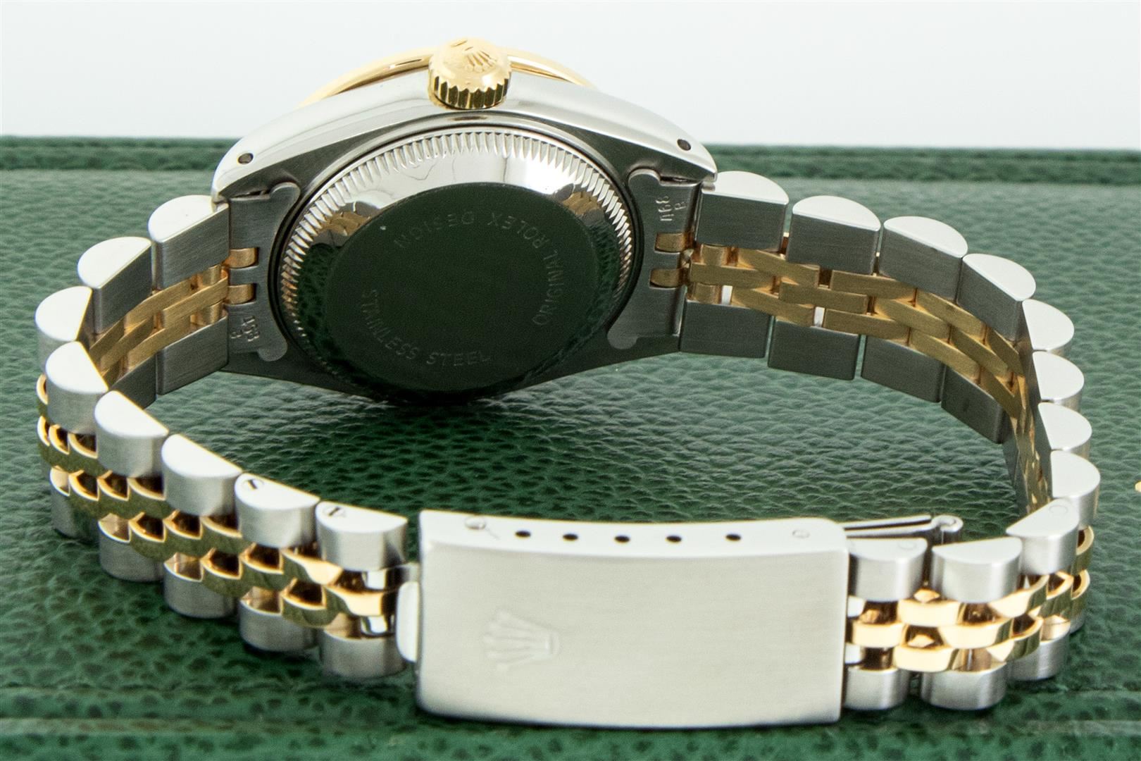 One Ladies Two Tone Rolex Datejust Polished, Serviced & Electronically Tested, Yellow Gold & Stainless Steel Case: 26mm, Rolex Yellow Gold Crown, Custom Bezel: New 18K Yellow Gold Sapphire Bead-set Diamond Bezel, Diamond + Gem Count: 28 Diamonds + 4 Sapphires, Clarity: SI-VS, Color: G to H. Custom Crystal: New Sapphire with Magnified Date Window. Custom Hands: New Luminescent Hands. Rolex Movement: Automatic Winding Movement. Custom Dial: Refinished To Silver Set with Added Diamond Hour Markers, Diamond Count: 10 Diamonds in Dial, G To H In Color, SI-VS Clarity. Date Window: 3 O'Clock Position Date Display, Model: Datejust, Condition: G-6 Extra Fine. Rolex Bracelet: Two Tone Yellow Gold & Stainless Steel Jubilee Band. Bright Polish. 6.0 Inch Length, Adjustable. Standard Clasp, with Rolex Logo. This Preowned Watch Has Been Serviced Time Tested And Is In Excellent Condition It Is Free Of All Scratches And Dents. This Watch Comes with A Rolex Box.
