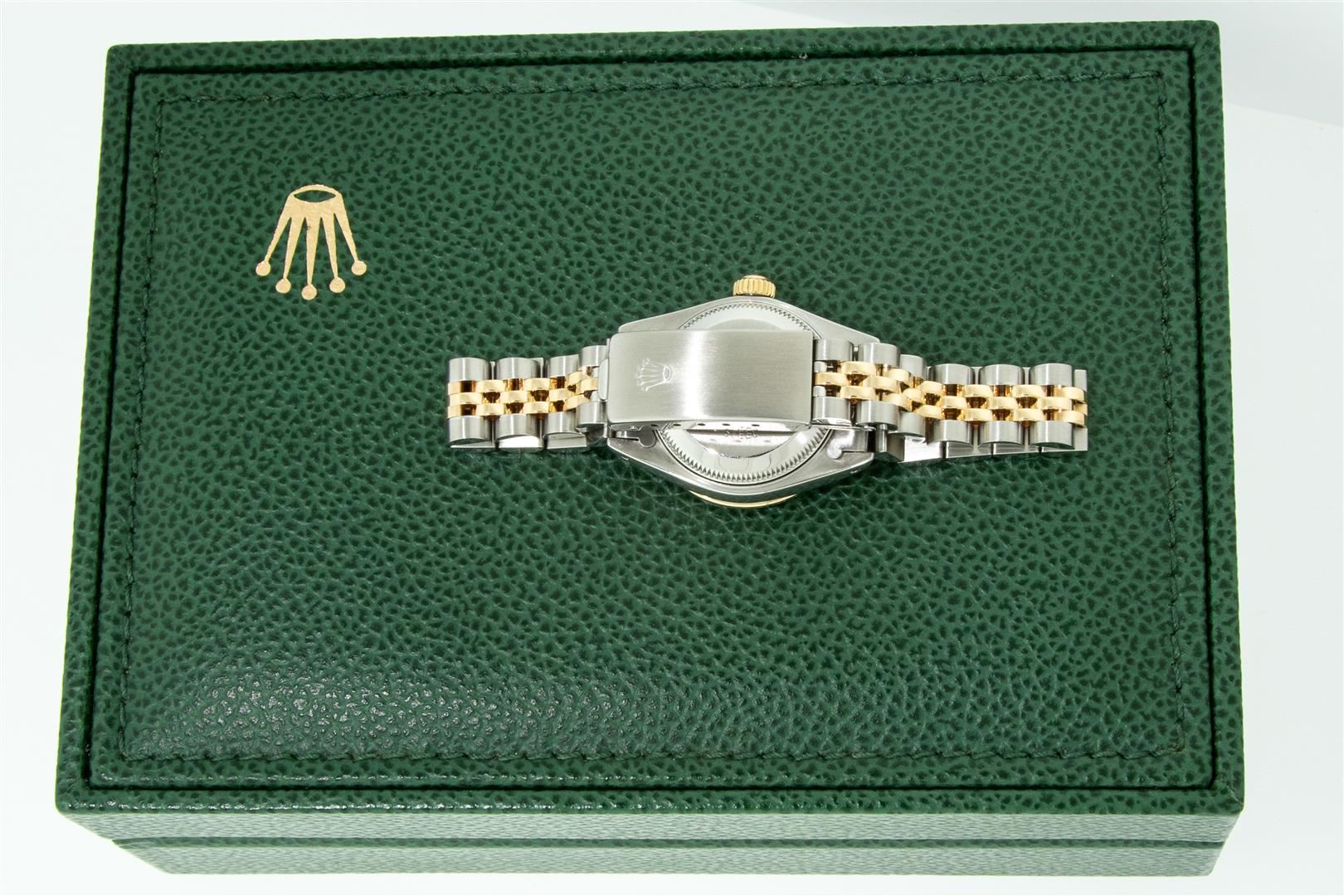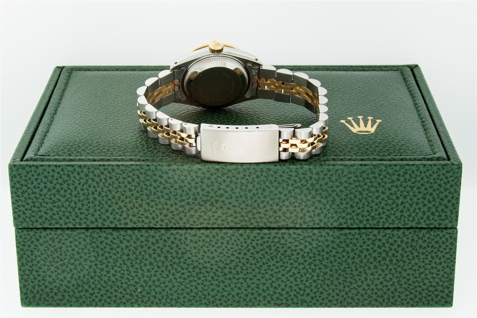 One Ladies Two Tone Rolex Datejust Polished, Serviced & Electronically Tested, Yellow Gold & Stainless Steel Case: 26mm, Rolex Yellow Gold Crown, Custom Bezel: New 18K Yellow Gold Sapphire Bead-set Diamond Bezel, Diamond + Gem Count: 28 Diamonds + 4 Sapphires, Clarity: SI-VS, Color: G to H. Custom Crystal: New Sapphire with Magnified Date Window. Custom Hands: New Luminescent Hands. Rolex Movement: Automatic Winding Movement. Custom Dial: Refinished To Silver Set with Added Diamond Hour Markers, Diamond Count: 10 Diamonds in Dial, G To H In Color, SI-VS Clarity. Date Window: 3 O'Clock Position Date Display, Model: Datejust, Condition: G-6 Extra Fine. Rolex Bracelet: Two Tone Yellow Gold & Stainless Steel Jubilee Band. Bright Polish. 6.0 Inch Length, Adjustable. Standard Clasp, with Rolex Logo. This Preowned Watch Has Been Serviced Time Tested And Is In Excellent Condition It Is Free Of All Scratches And Dents. This Watch Comes with A Rolex Box.