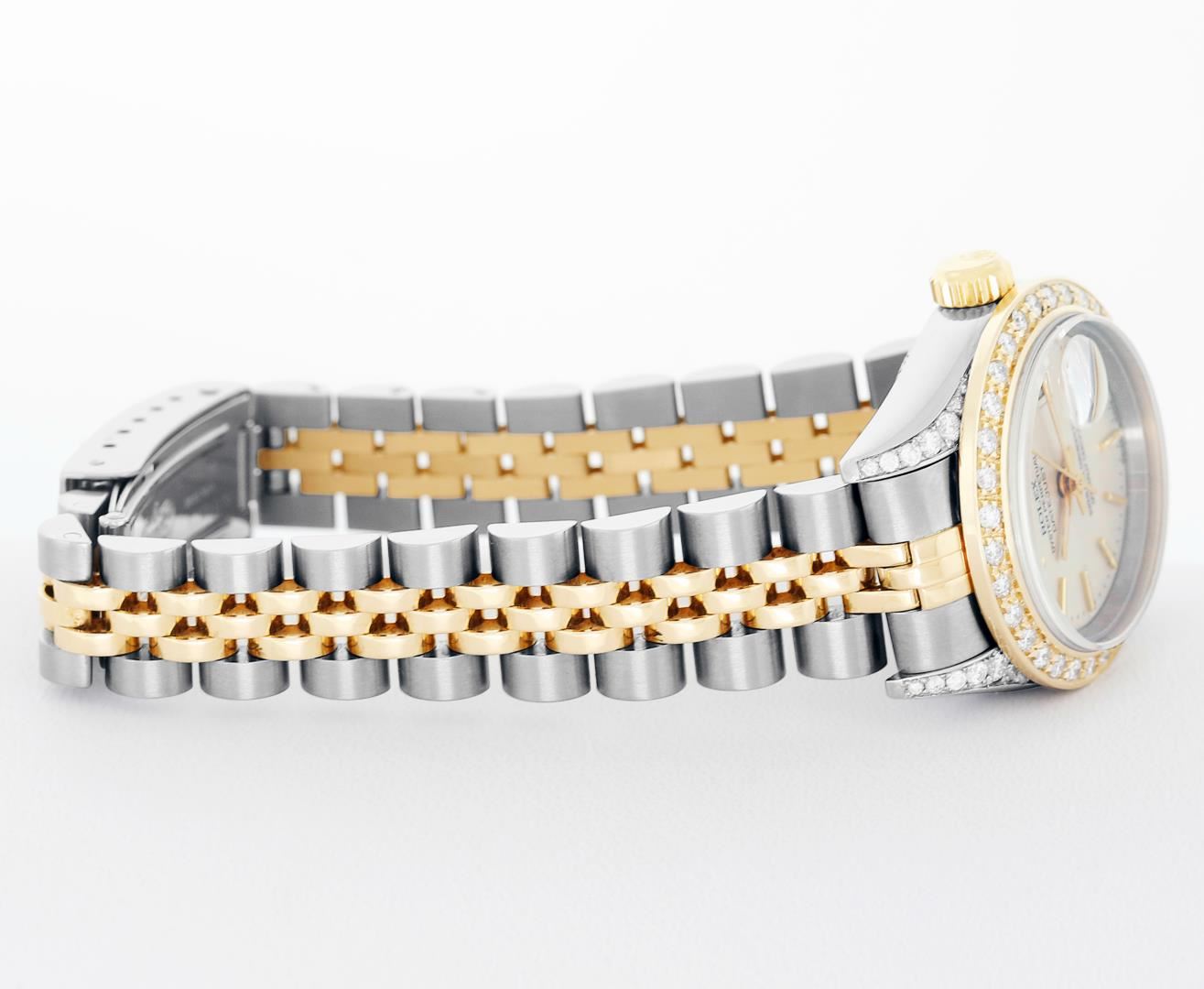 One Pre Owned Quickset Ladies Two Tone 18K Yellow Gold & Stainless Rolex Polished, Serviced & Electronically Tested, Rolex 18K Yellow Gold & Stainless Steel Case: 26mm, Custom Diamond Lugs: Added Diamonds On Lugs, Diamond Count: 24 Diamonds On Lugs. Rolex Yellow Gold Crown, Custom Bezel: New 18K Yellow Gold Diamond Bezel, Diamond Count: 32 Diamonds, Clarity: SI-VS, Color: G to H. Custom Crystal: New Sapphire With Magnified Date Window. Custom Hands: New Lumi Hands. Rolex Movement: Automatic Quickset Winding Movement 2235. Rolex Dial: Silver Index With Lumi Dots And Dash Track. Date Window: 3 O'Clock Position Date Display, Model: Quickset Datejust, Condition: G-6 Extra Fine. Rolex Bracelet: Two Tone 18K Yellow Gold & Stainless Steel Jubilee Band. Bright Polish. 6.0 Inch Length, Adjustable. Standard Clasp, With Rolex Logo. This Watch Has Been Serviced Time Tested And Is In Excellent Condition It Is Free Of All Scratches And Dents.
