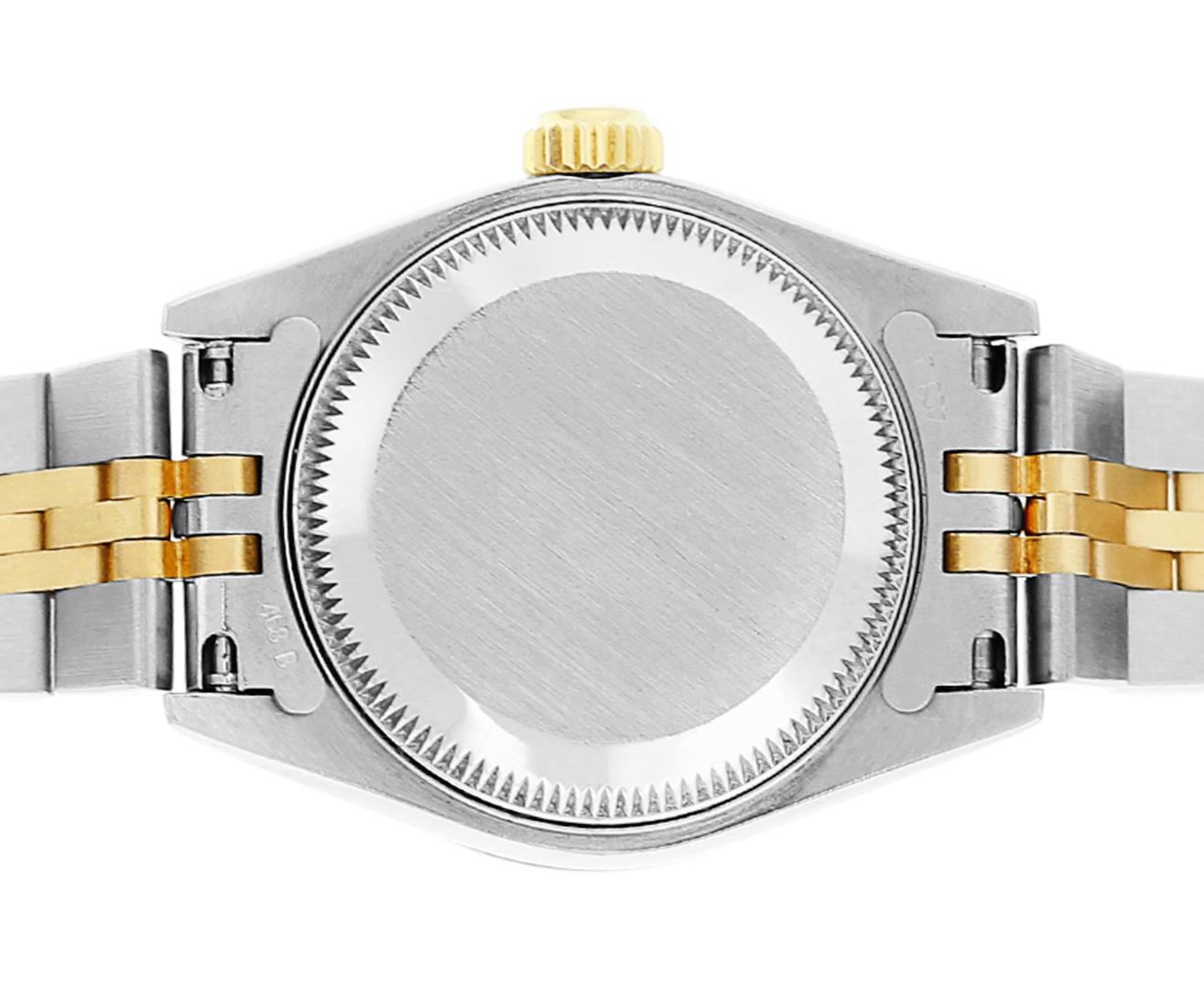 One Pre Owned Quickset Ladies Two Tone 18K Yellow Gold & Stainless Rolex Polished, Serviced & Electronically Tested, Rolex 18K Yellow Gold & Stainless Steel Case: 26mm, Custom Diamond Lugs: Added Diamonds On Lugs, Diamond Count: 24 Diamonds On Lugs. Rolex Yellow Gold Crown, Custom Bezel: New 18K Yellow Gold Diamond Bezel, Diamond Count: 32 Diamonds, Clarity: SI-VS, Color: G to H. Custom Crystal: New Sapphire With Magnified Date Window. Custom Hands: New Lumi Hands. Rolex Movement: Automatic Quickset Winding Movement 2235. Rolex Dial: Silver Index With Lumi Dots And Dash Track. Date Window: 3 O'Clock Position Date Display, Model: Quickset Datejust, Condition: G-6 Extra Fine. Rolex Bracelet: Two Tone 18K Yellow Gold & Stainless Steel Jubilee Band. Bright Polish. 6.0 Inch Length, Adjustable. Standard Clasp, With Rolex Logo. This Watch Has Been Serviced Time Tested And Is In Excellent Condition It Is Free Of All Scratches And Dents.