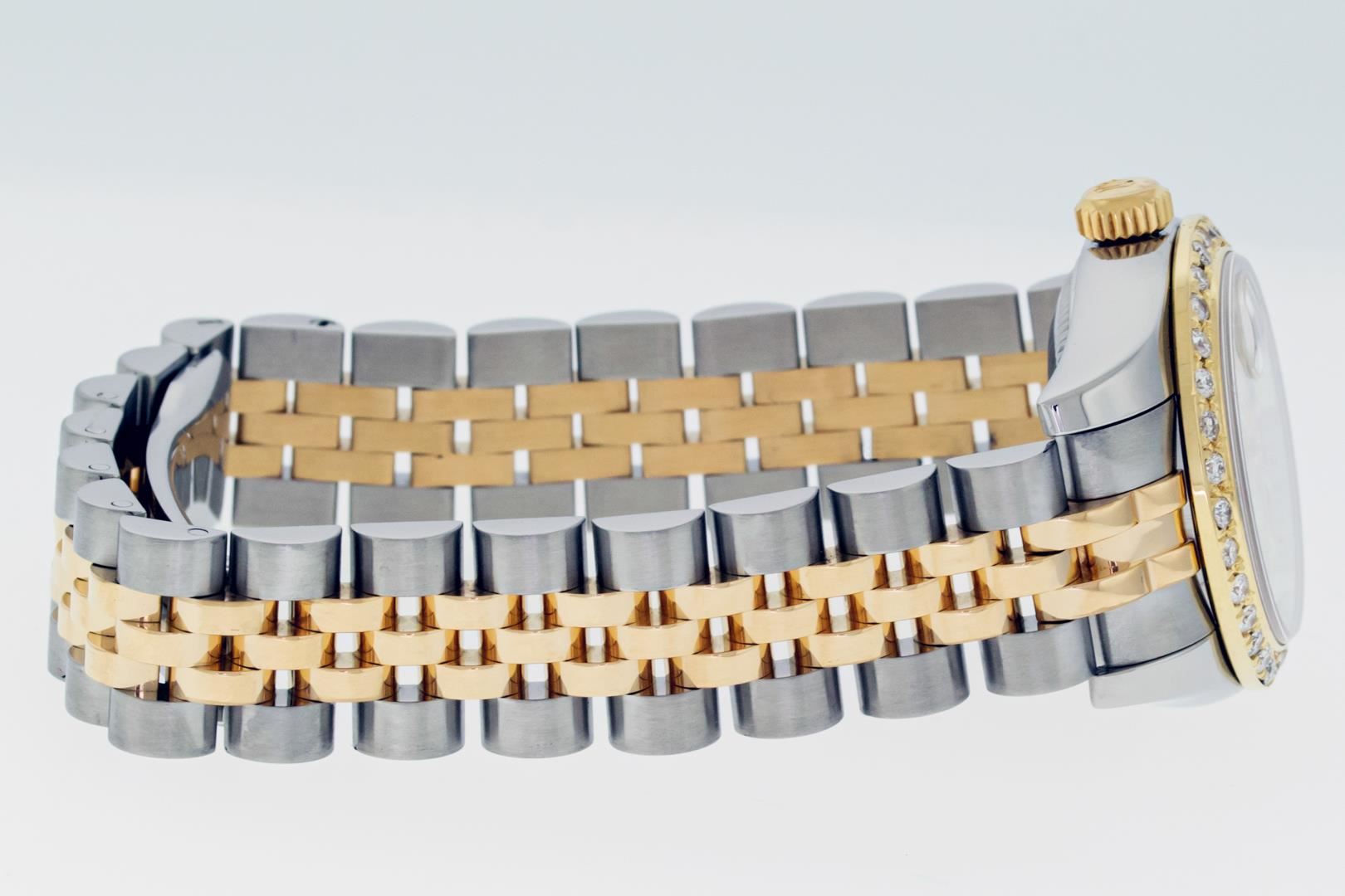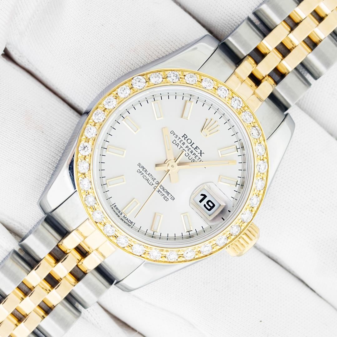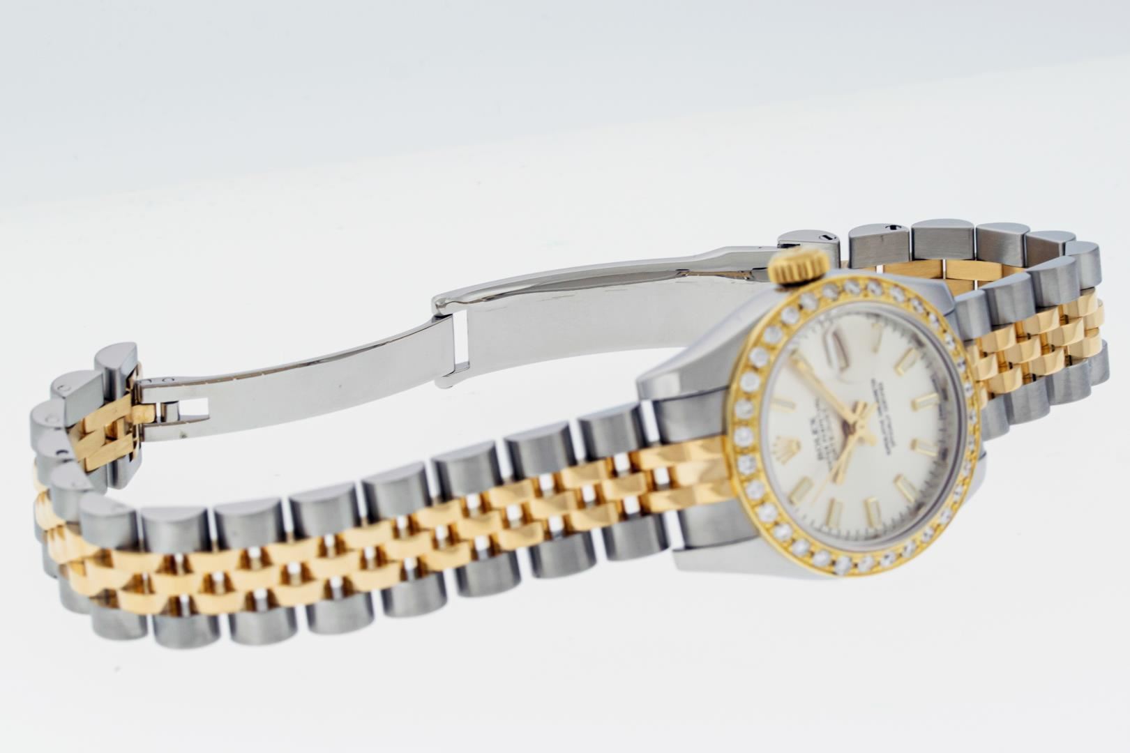 One Ladies Pre Owned Quickset Sapphire 2T 18K Yellow Gold & Stainless Steel Rolex Datejust Polished Bright with Satin Finish, Serviced & Electronically Tested, Rolex Stainless Steel Case: 26mm, Rolex 18K Yellow Gold Crown, Custom Bezel: New 18K Yellow Gold Beadset Diamond Bezel, Diamond Count: 32 Diamonds On Bezel, Diamond Color: G To H, Clarity: SI-VS. Crystal: Sapphire With Magnified Date Window. Hands: Luminescent Hands. Rolex Movement: Automatic Winding Movement 2235. Rolex Dial: Silver Index With Dash Track. Date Window: 3 O'Clock Position Date Display, Model: Sapphire Quickset Datejust. Condition: G-6 Extra Fine. Rolex Bracelet: 18K Yellow Gold & Stainless Steel Jubilee Band. Bright Polish & Satin Finish. 6.0 Inch Length, Adjustable. Hidden Clap, With Rolex Logo. This Watch Has Been Serviced Time Tested And Is In Excellent Condition It Is Free Of All Scratches And Dents.