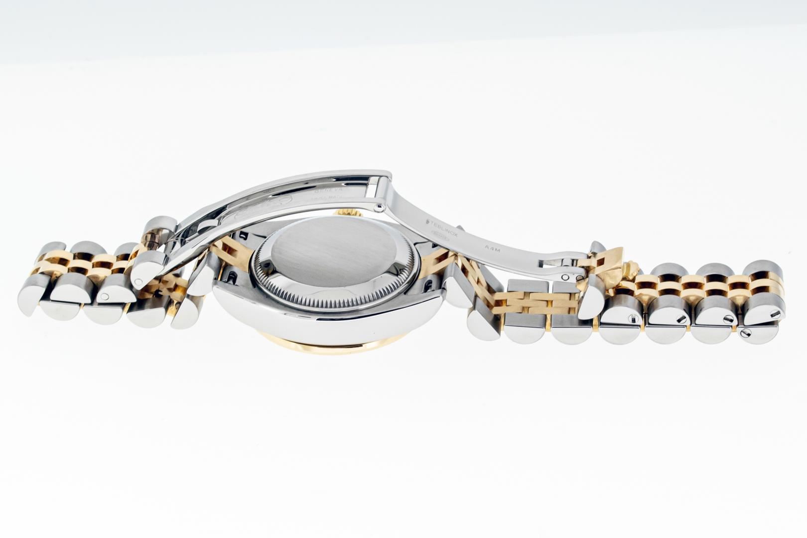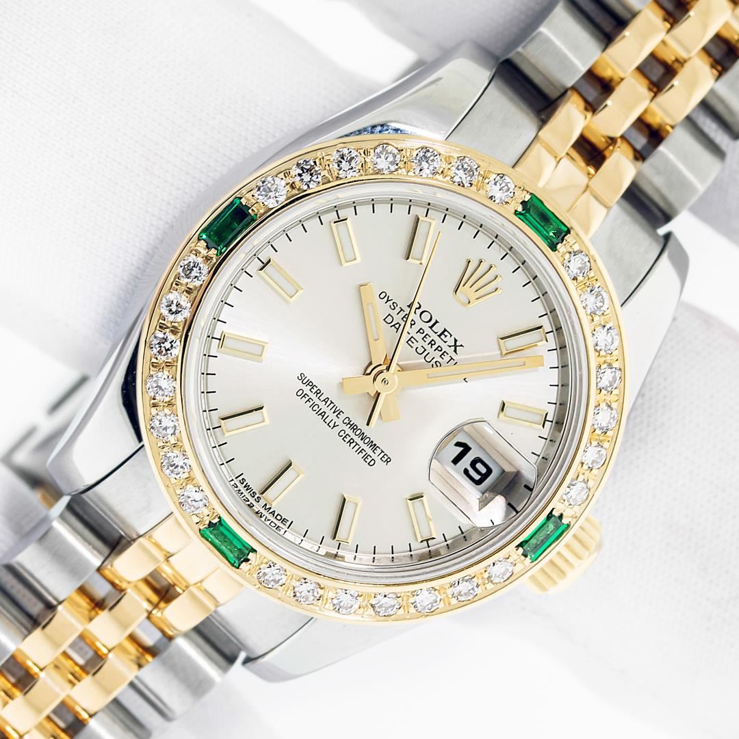 One Ladies Pre Owned Quickset Sapphire 2T 18K Yellow Gold & Stainless Steel Rolex Datejust Polished Bright with Satin Finish, Serviced & Electronically Tested, Rolex Stainless Steel Case: 26mm, Rolex 18K Yellow Gold Crown, Custom Bezel: New 18K Yellow Gold Emerald Beadset Diamond Bezel, Stone Count: 28 Diamonds + 4 Emeralds, Diamond Color: G To H, Clarity: SI-VS. Crystal: Sapphire With Magnified Date Window. Hands: Luminescent Hands. Rolex Movement: Automatic Winding Movement 2235. Rolex Dial: Silver Index With Dash Track. Date Window: 3 O'Clock Position Date Display, Model: Sapphire Quickset Datejust. Condition: G-6 Extra Fine. Rolex Bracelet: 18K Yellow Gold & Stainless Steel Jubilee Band. Bright Polish & Satin Finish. 6.0 Inch Length, Adjustable. Hidden Clap, With Rolex Logo. This Watch Has Been Serviced Time Tested And Is In Excellent Condition It Is Free Of All Scratches And Dents.