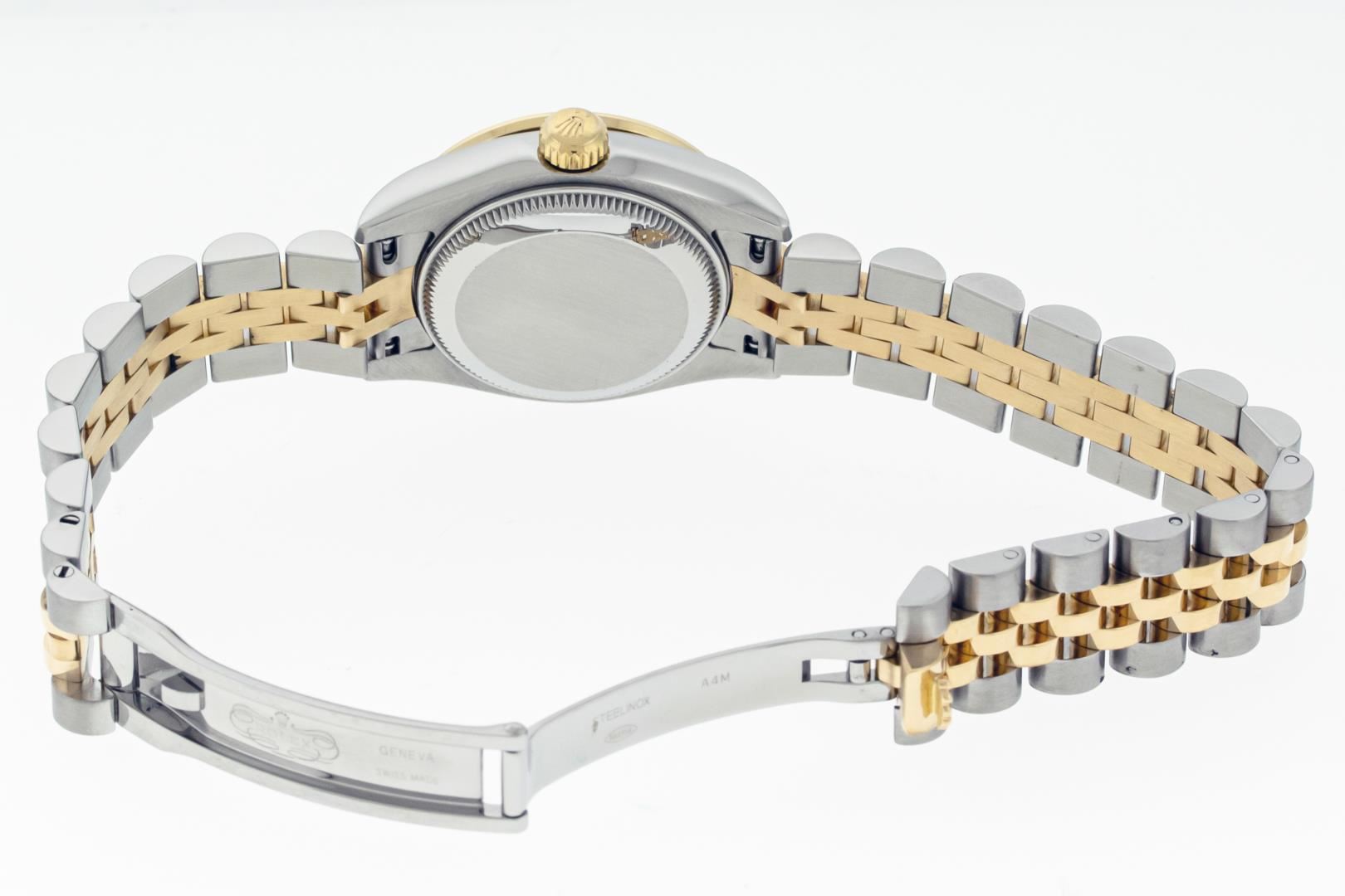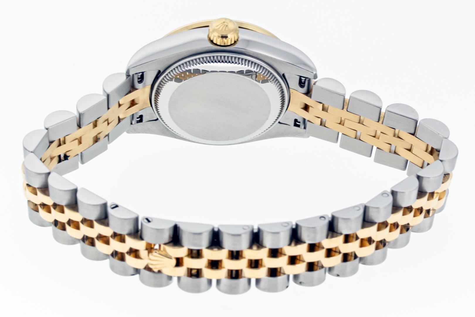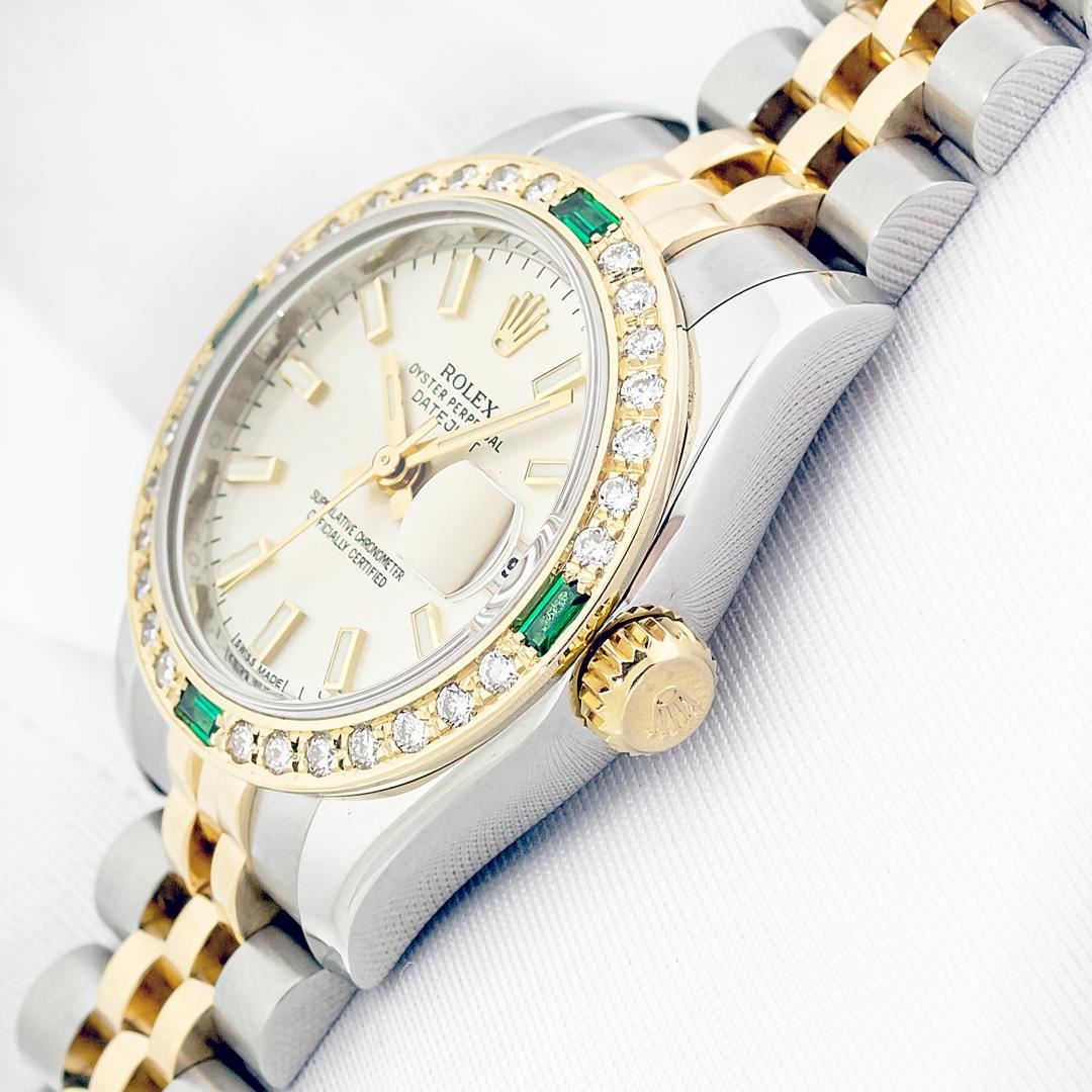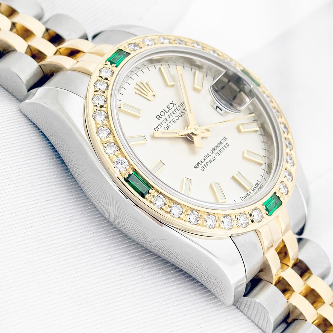 One Ladies Pre Owned Quickset Sapphire 2T 18K Yellow Gold & Stainless Steel Rolex Datejust Polished Bright with Satin Finish, Serviced & Electronically Tested, Rolex Stainless Steel Case: 26mm, Rolex 18K Yellow Gold Crown, Custom Bezel: New 18K Yellow Gold Emerald Beadset Diamond Bezel, Stone Count: 28 Diamonds + 4 Emeralds, Diamond Color: G To H, Clarity: SI-VS. Crystal: Sapphire With Magnified Date Window. Hands: Luminescent Hands. Rolex Movement: Automatic Winding Movement 2235. Rolex Dial: Silver Index With Dash Track. Date Window: 3 O'Clock Position Date Display, Model: Sapphire Quickset Datejust. Condition: G-6 Extra Fine. Rolex Bracelet: 18K Yellow Gold & Stainless Steel Jubilee Band. Bright Polish & Satin Finish. 6.0 Inch Length, Adjustable. Hidden Clap, With Rolex Logo. This Watch Has Been Serviced Time Tested And Is In Excellent Condition It Is Free Of All Scratches And Dents.