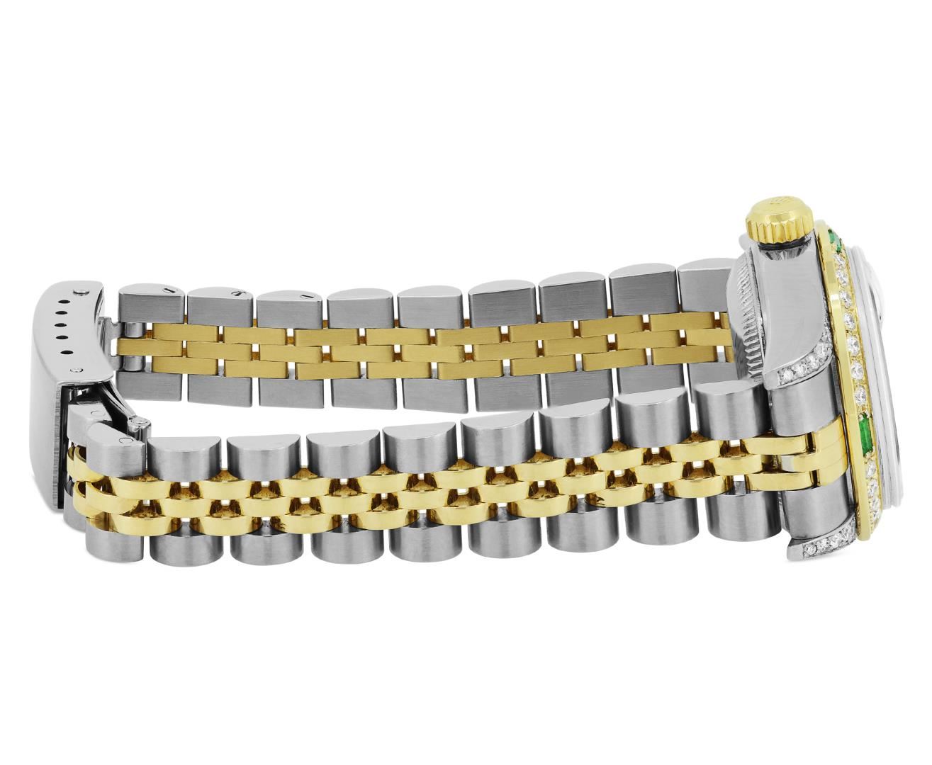 One Ladies Pre Owned Sapphire Rolex Two Tone 18K Yellow Gold And Stainless Steel Rolex Datejust Polished, Serviced & Electronically Tested, Rolex Yellow Gold And Stainless Steel Case: 26mm, Custom Diamond Lugs: 24 Added Diamonds On Lugs. Rolex Yellow Gold Crown. Custom Bezel: New 18K Yellow Gold Emerald Beadset Diamond Bezel, Diamond + Gem Count: 36 Diamonds + 4 Emeralds. Crystal: Sapphire Crystal With Date Window. Custom Hands: New Luminescent Hands. Rolex Movement: Automatic Winding Movement 2235. Rolex Factory Dial: Silver With Index Markers And Dash Track and Lumi Dots. Date Window: 3 O'clock Position Date Display, Condition: G-6 Extra Fine. Rolex Bracelet: Two Tone 18K Yellow Gold And Stainless Steel Jubilee Band. Bright Polish & Satin Finish. 6.0 Inch Length, Adjustable. Standard Clasp, With Rolex Logo. This Watch Has Been Serviced And Time Tested. It Is In Excellent Condition, Free Of All Scratches And Dents.