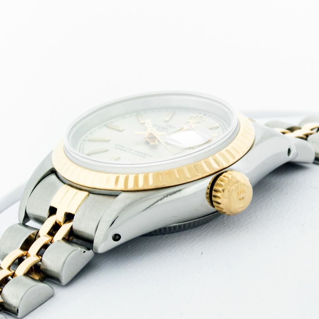 One Ladies Pre Owned Two Tone 14K Yellow Gold & Stainless Steel Rolex Polished, Serviced & Electronically Tested, Rolex 14K Yellow Gold & Stainless Steel Case: 26mm, Rolex Yellow Gold Crown, Rolex Bezel: 14K Yellow Gold Fluted Bezel. Crystal: Plastic With Magnified Date Window. Hands: Luminescent Hands. Rolex Movement: Automatic Winding Movement 2030. Rolex Dial: Silver Index Tapestry With Square Track. Date Window: 3 O'Clock Position Date Display, Model: Datejust. Condition: G-6 Extra Fine. Rolex Bracelet: Two Tone 14K Yellow Gold & Stainless Steel Jubilee Band. Bright Polish. 6.0 Inch Length, Adjustable. Standard Clasp, With Rolex Logo. This Watch Has Been Serviced Time Tested And Is In Excellent Condition It Is Free Of All Scratches And Dents.