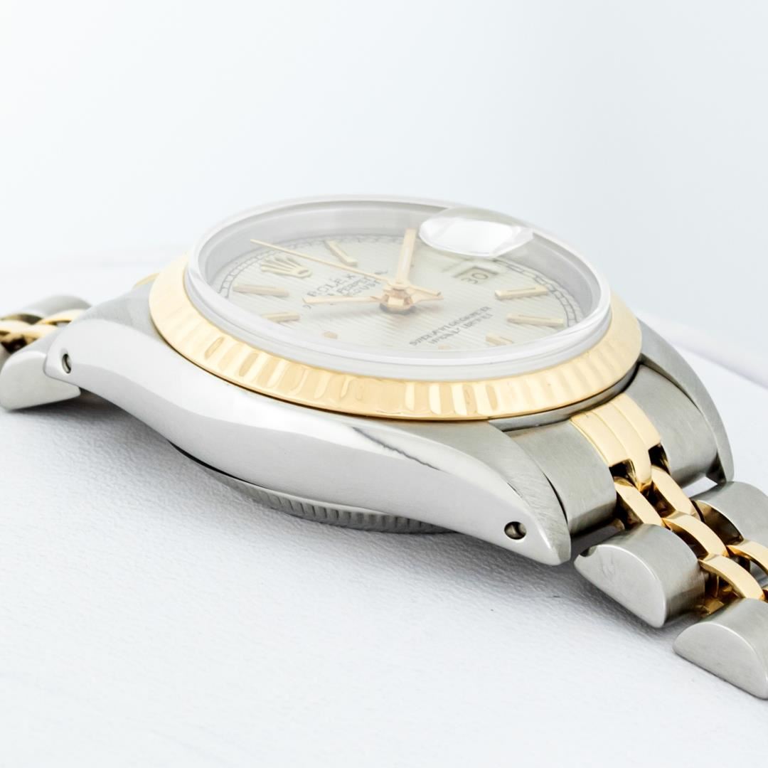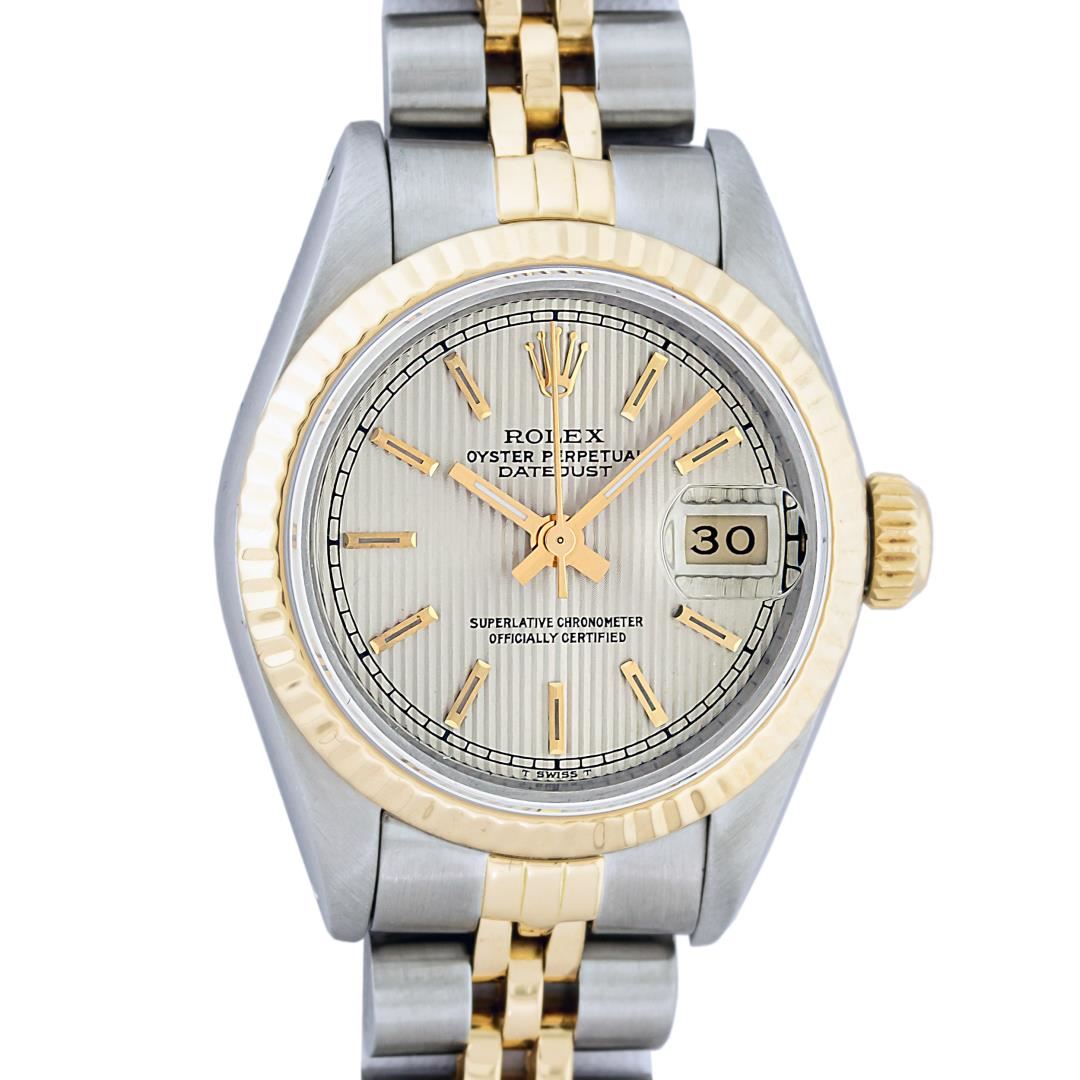 One Ladies Pre Owned Two Tone 14K Yellow Gold & Stainless Steel Rolex Polished, Serviced & Electronically Tested, Rolex 14K Yellow Gold & Stainless Steel Case: 26mm, Rolex Yellow Gold Crown, Rolex Bezel: 14K Yellow Gold Fluted Bezel. Crystal: Plastic With Magnified Date Window. Hands: Luminescent Hands. Rolex Movement: Automatic Winding Movement 2030. Rolex Dial: Silver Index Tapestry With Square Track. Date Window: 3 O'Clock Position Date Display, Model: Datejust. Condition: G-6 Extra Fine. Rolex Bracelet: Two Tone 14K Yellow Gold & Stainless Steel Jubilee Band. Bright Polish. 6.0 Inch Length, Adjustable. Standard Clasp, With Rolex Logo. This Watch Has Been Serviced Time Tested And Is In Excellent Condition It Is Free Of All Scratches And Dents.