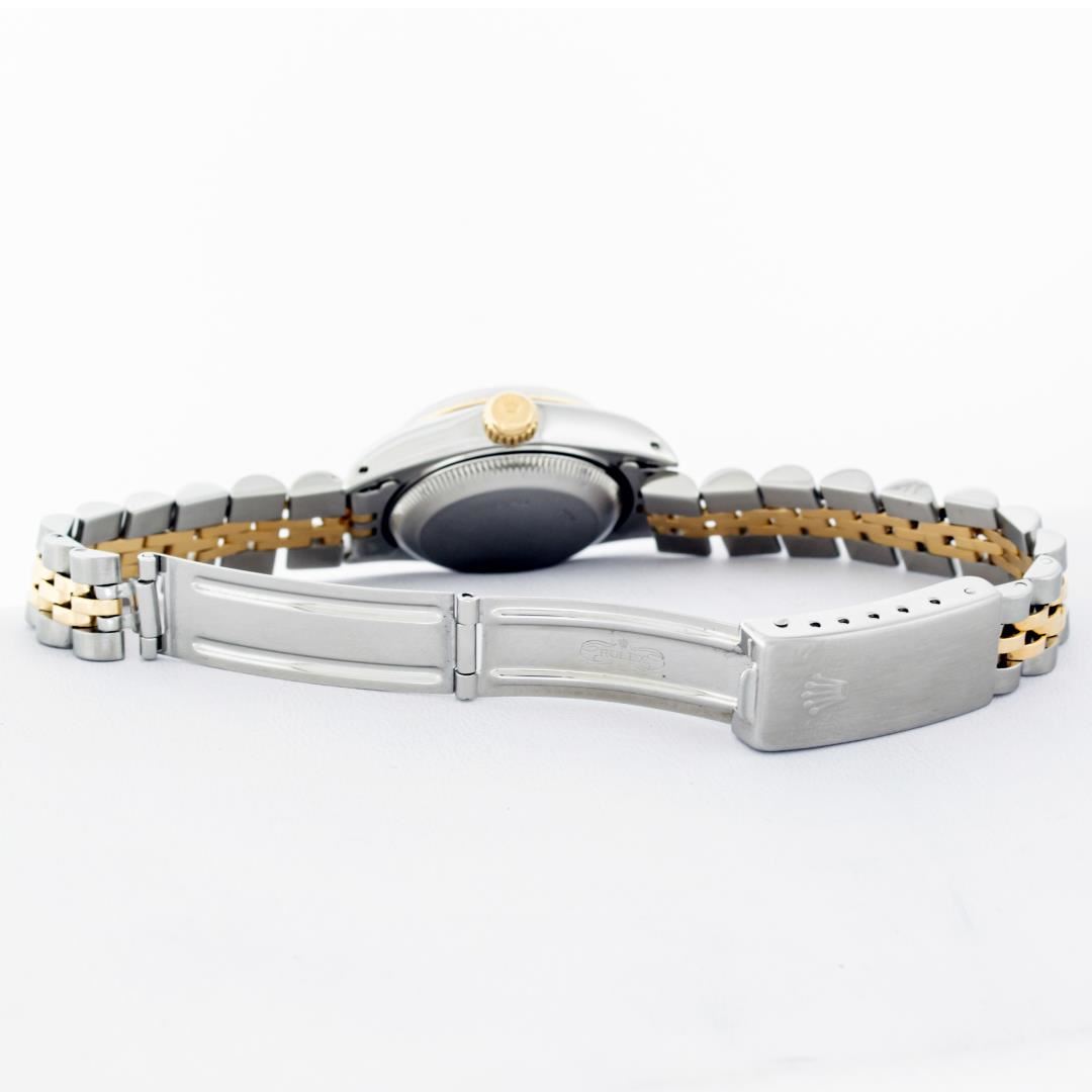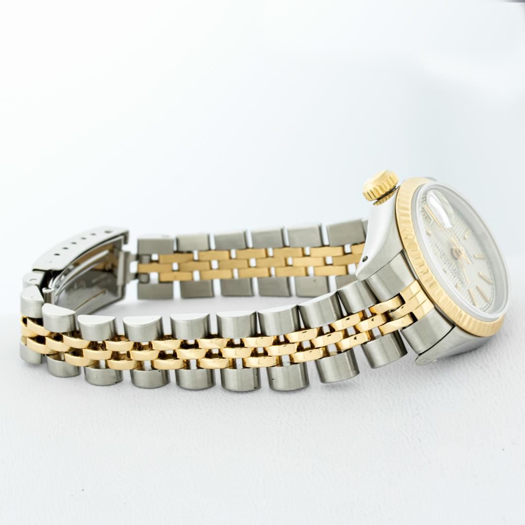 One Ladies Pre Owned Two Tone 14K Yellow Gold & Stainless Steel Rolex Polished, Serviced & Electronically Tested, Rolex 14K Yellow Gold & Stainless Steel Case: 26mm, Rolex Yellow Gold Crown, Rolex Bezel: 14K Yellow Gold Fluted Bezel. Crystal: Plastic With Magnified Date Window. Hands: Luminescent Hands. Rolex Movement: Automatic Winding Movement 2030. Rolex Dial: Silver Index Tapestry With Square Track. Date Window: 3 O'Clock Position Date Display, Model: Datejust. Condition: G-6 Extra Fine. Rolex Bracelet: Two Tone 14K Yellow Gold & Stainless Steel Jubilee Band. Bright Polish. 6.0 Inch Length, Adjustable. Standard Clasp, With Rolex Logo. This Watch Has Been Serviced Time Tested And Is In Excellent Condition It Is Free Of All Scratches And Dents.