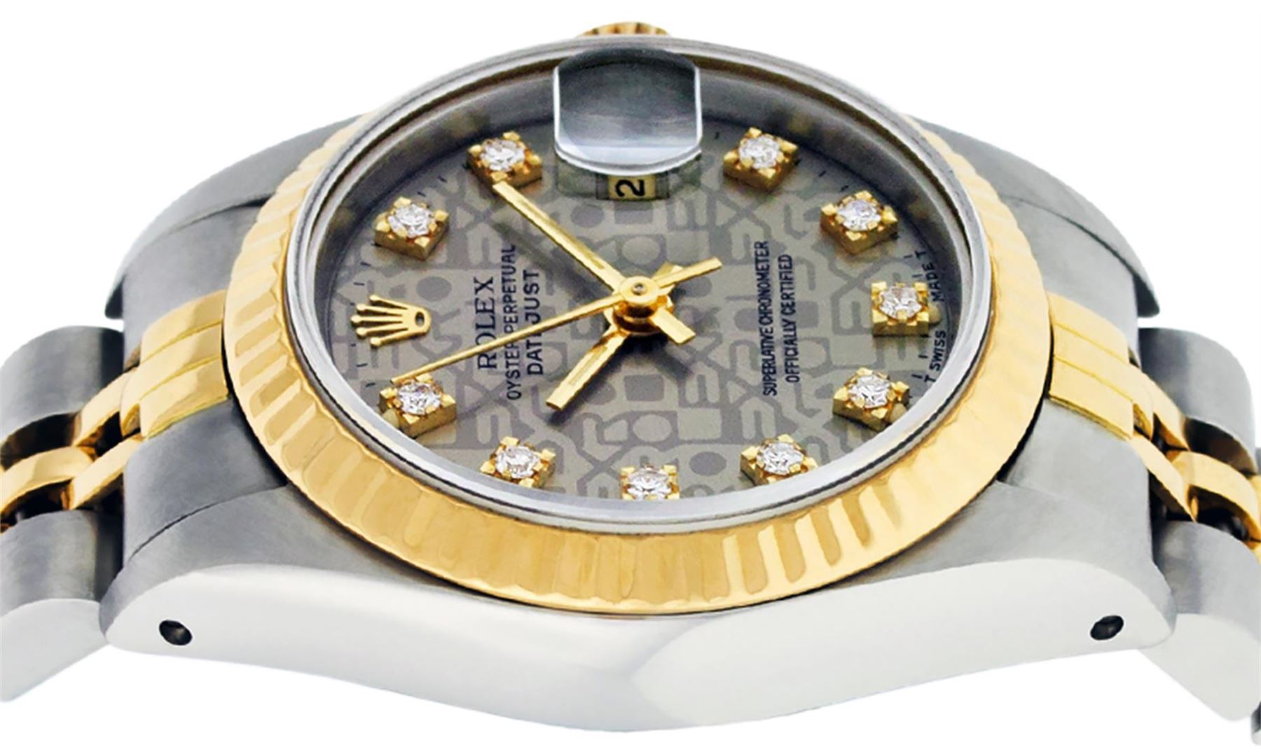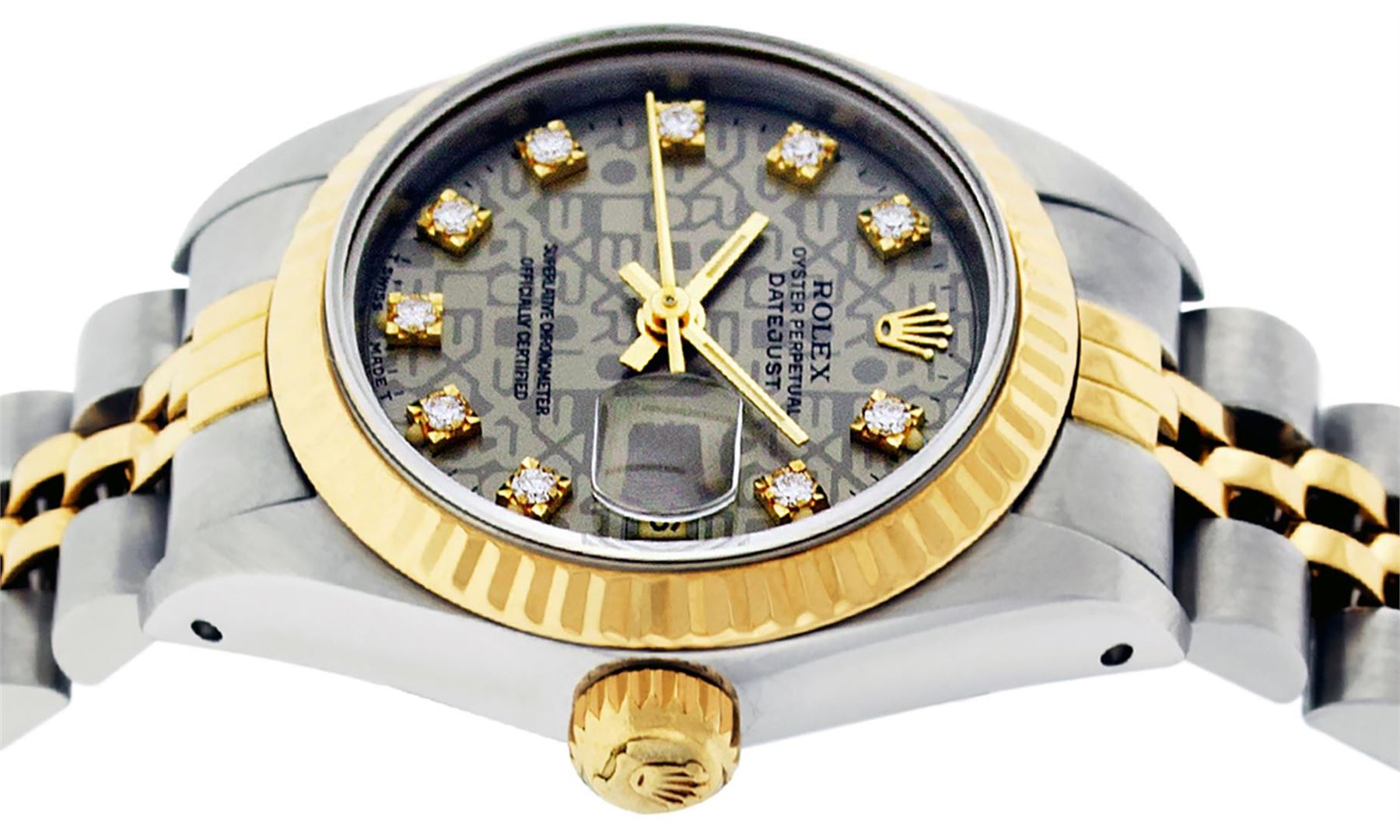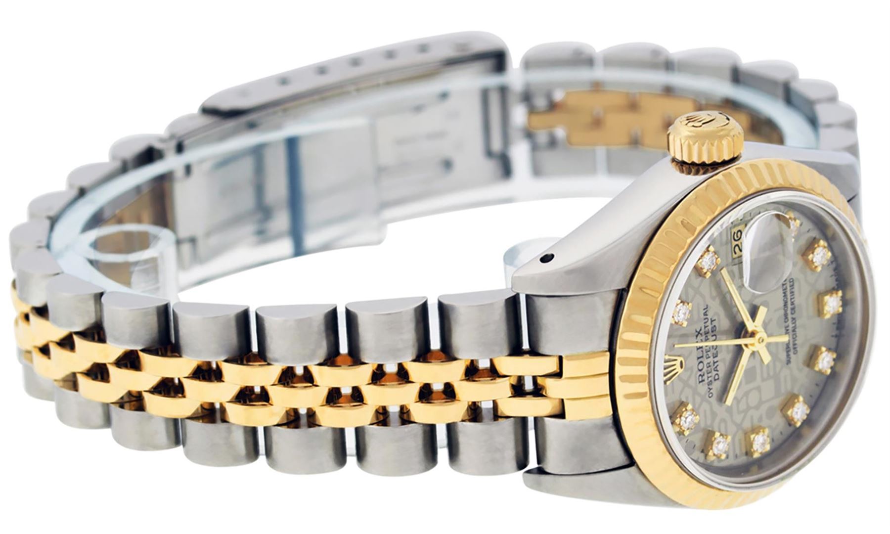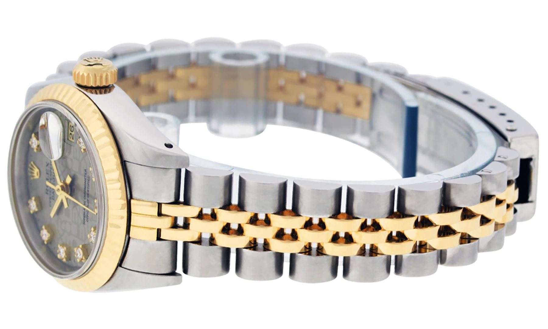 One Ladies Two Tone Rolex Datejust Polished, Serviced & Electronically Tested, Yellow Gold & Stainless Steel Case: 26mm, Yellow Gold Crown, Bezel: Yellow Gold Fluted Bezel. Custom Crystal: New Acrylic Cyclops Lens. Custom Hands: New Luminescent Hands. Movement: Automatic Winding Movement. Custom Dial: Slate Grey Jubilee With Single Cut Diamond Hour Markers, Diamond Count: 10 Diamonds On Dial, Color: G to H, Clarity: VS2-SI1. Date Window: 3 O'clock Position Date Display, Model: Datejust. Condition: G-6 Extra Fine. Bracelet: Two Tone Yellow Gold & Stainless Steel Jubilee. Bright Polish. 6.0 Inch Length, Adjustable. Standard Clasp, With Rolex Logo. This Watch Has Been Serviced Time Tested And Is In Excellent Condition It Is Free Of All Scratches And Dents.