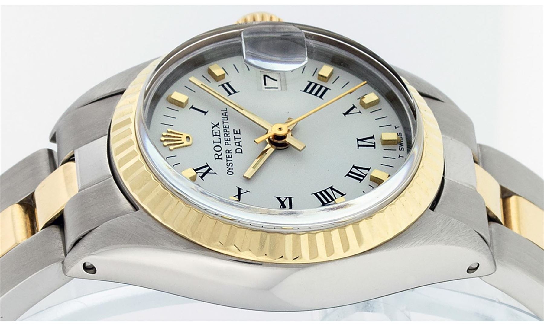 One Ladies Two Tone Rolex Datejust Polished, Serviced & Electronically Tested, Yellow Gold & Stainless Steel Case: 26mm, Yellow Gold Crown, Bezel: Yellow Gold Fluted Bezel. Custom Crystal: New Acrylic Cyclops Lens. Custom Hands: New Luminescent Hands. Movement: Automatic Winding Movement. Custom Dial: White Dial With Dash Track & Lumi Dots. Date Window: 3 O'clock Position Date Display, Model: Datejust. Condition: G-6 Extra Fine. Bracelet: Two Tone Yellow Gold & Stainless Steel Oyster Band. Bright Polish. 6.0 Inch Length, Adjustable. Standard Clasp, With Rolex Logo. This Watch Has Been Serviced Time Tested And Is In Excellent Condition It Is Free Of All Scratches And Dents.