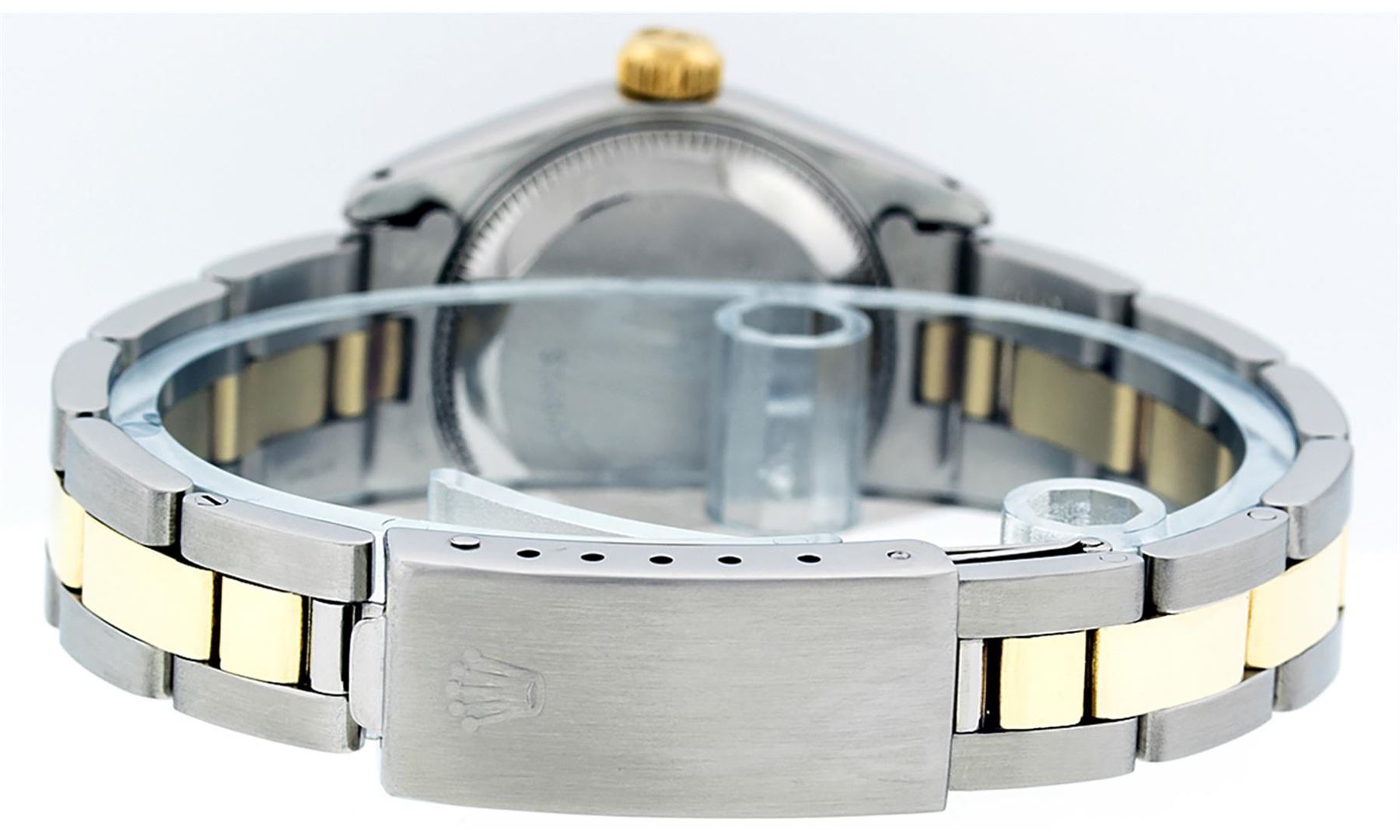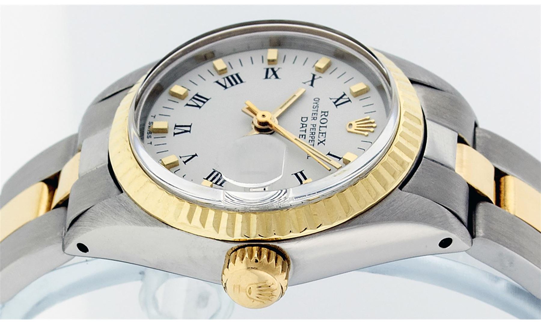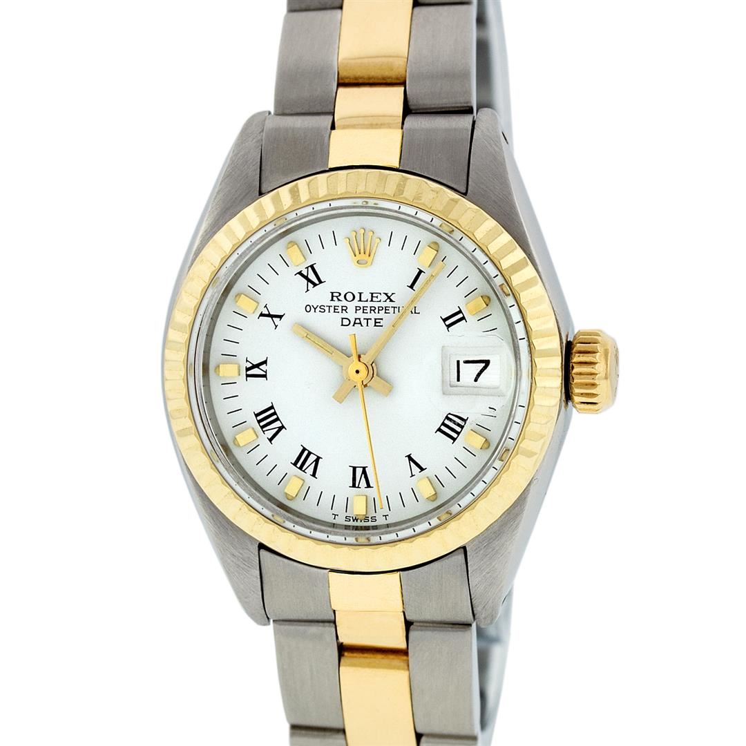 One Ladies Two Tone Rolex Datejust Polished, Serviced & Electronically Tested, Yellow Gold & Stainless Steel Case: 26mm, Yellow Gold Crown, Bezel: Yellow Gold Fluted Bezel. Custom Crystal: New Acrylic Cyclops Lens. Custom Hands: New Luminescent Hands. Movement: Automatic Winding Movement. Custom Dial: White Dial With Dash Track & Lumi Dots. Date Window: 3 O'clock Position Date Display, Model: Datejust. Condition: G-6 Extra Fine. Bracelet: Two Tone Yellow Gold & Stainless Steel Oyster Band. Bright Polish. 6.0 Inch Length, Adjustable. Standard Clasp, With Rolex Logo. This Watch Has Been Serviced Time Tested And Is In Excellent Condition It Is Free Of All Scratches And Dents.