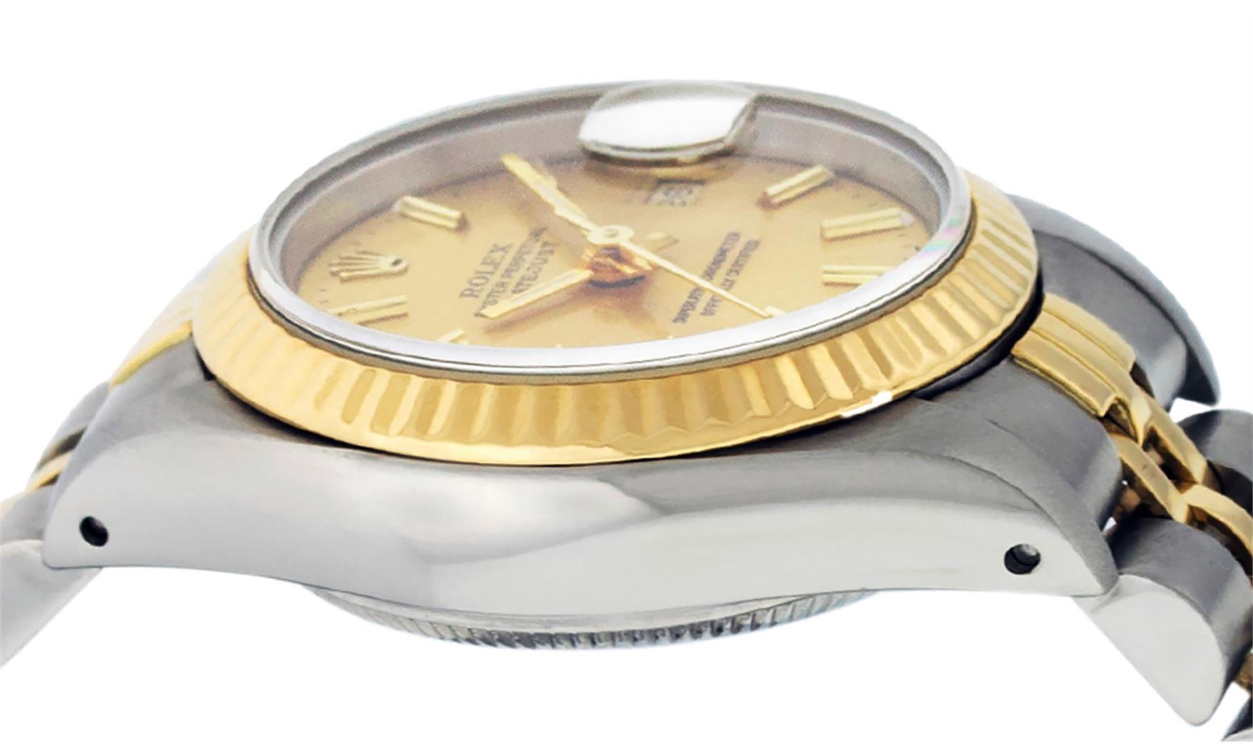 One Ladies Two Tone Rolex Datejust Polished, Serviced & Electronically Tested, Yellow Gold & Stainless Steel Case: 26mm, Yellow Gold Crown, Bezel: Yellow Gold Fluted Bezel. Custom Crystal: Acrylic Cyclops Lens. Custom Hands: New Luminescent Hands. Movement: Automatic Winding Movement. Dial: Champagne Index With Luminescent Dots. Date Window: 3 O'clock Position Date Display, Model: Datejust. Condition: G-6 Extra Fine. Bracelet: Two Tone Yellow Gold & Stainless Steel Jubilee. Bright Polish. 6.0 Inch Length, Adjustable. Standard Clasp, With Rolex Logo. This Watch Has Been Serviced Time Tested And Is In Excellent Condition It Is Free Of All Scratches And Dents.