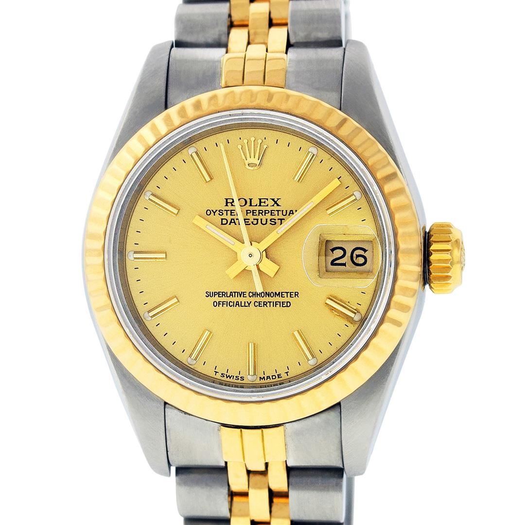 One Ladies Two Tone Rolex Datejust Polished, Serviced & Electronically Tested, Yellow Gold & Stainless Steel Case: 26mm, Yellow Gold Crown, Bezel: Yellow Gold Fluted Bezel. Custom Crystal: Acrylic Cyclops Lens. Custom Hands: New Luminescent Hands. Movement: Automatic Winding Movement. Dial: Champagne Index With Luminescent Dots. Date Window: 3 O'clock Position Date Display, Model: Datejust. Condition: G-6 Extra Fine. Bracelet: Two Tone Yellow Gold & Stainless Steel Jubilee. Bright Polish. 6.0 Inch Length, Adjustable. Standard Clasp, With Rolex Logo. This Watch Has Been Serviced Time Tested And Is In Excellent Condition It Is Free Of All Scratches And Dents.