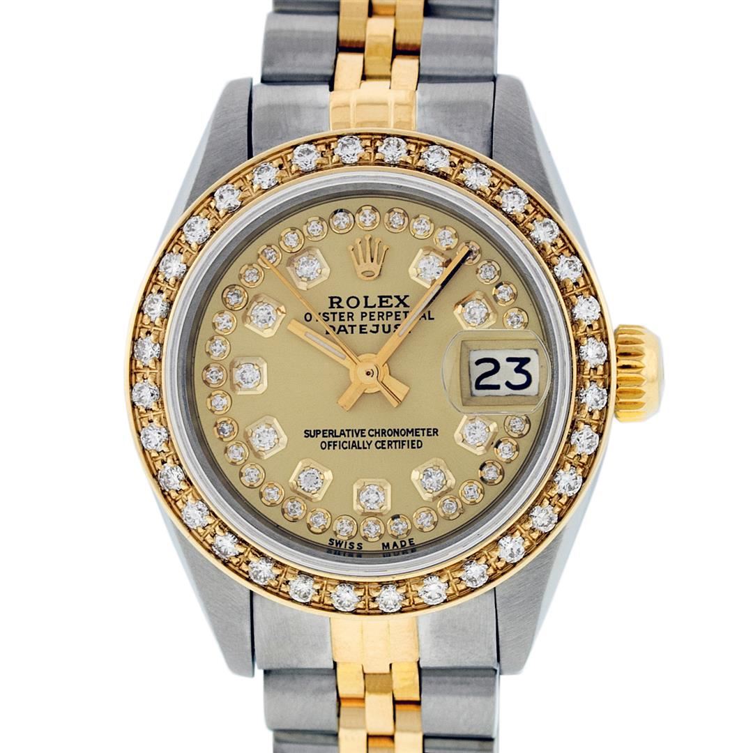 One Ladies Two Tone Rolex Datejust Polished, Serviced & Electronically Tested, Yellow Gold & Stainless Steel Case: 26mm, Yellow Gold Crown, Custom Bezel: New 18K Yellow Gold Beadset Diamond Bezel, Diamond Count: 32 Diamonds Total Weight .70 Carat, Clarity: SI-VS, Color: G to H. Custom Crystal: New Synthetic Sapphire Cyclops Lens. Custom Hands: New Luminescent Hands. Movement: Automatic Winding Movement.. Custom Dial: Champagne String Diamond Dial, Diamond Count: 43 Diamonds, Clarity: SI-VS, Color: G to H. Date Window: 3 O'clock Position Date Display, Model: Datejust. Condition: G-6 Extra Fine. Bracelet: Two Tone Yellow Gold & Stainless Steel Jubilee. Bright Polish. 6.0 Inch Length, Adjustable. Standard Clasp, With Rolex Logo. This Watch Has Been Serviced Time Tested And Is In Excellent Condition It Is Free Of All Scratches And Dents.