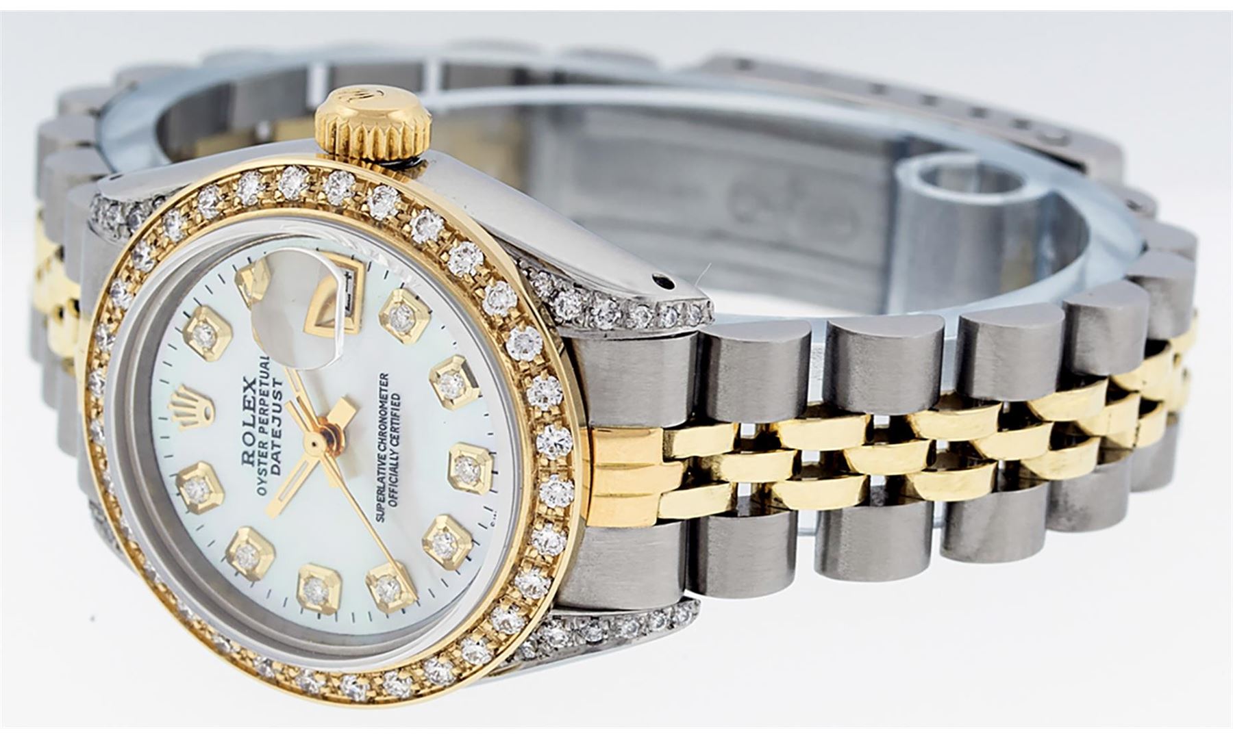 One Ladies Two Tone Rolex Datejust Polished, Serviced & Electronically Tested, Yellow Gold & Stainless Steel Case: 26mm, Yellow Gold Crown, Diamond Lugs: 24 Diamonds On Lugs, Clarity: SI-VS, Color: G to H, Clarity SI-VS. Custom Bezel: New 18K Yellow Gold Beadset Diamond Bezel, Diamond Count: 32 Diamonds, Total Weight .70 Carat, Clarity: SI-VS, Color: G to H. Custom Crystal: New Synthetic Sapphire Cyclops Lens. Custom Hands: New Luminescent Hands. Movement: Automatic Winding Movement.. Custom Dial: Mother Of Pearl With Diamond Hour Markers and Dash Track, Diamond Count: 10 Diamonds, Clarity: SI-VS, Color: G to H. Date Window: 3 O'clock Position Date Display, Model: Datejust. Condition: G-6 Extra Fine. Bracelet: Two Tone Yellow Gold & Stainless Steel Jubilee. Bright Polish. 6.0 Inch Length, Adjustable. Standard Clasp, With Rolex Logo. This Watch Has Been Serviced Time Tested And Is In Excellent Condition It Is Free Of All Scratches And Dents.